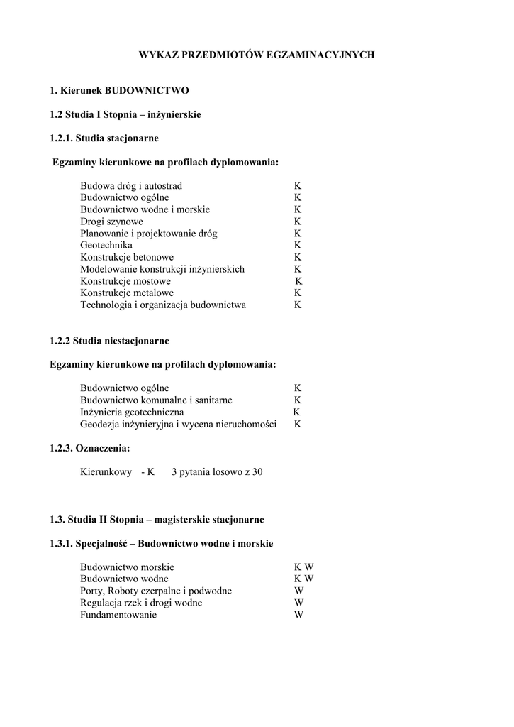 WYKAZ PRZEDMIOTÓW EGZAMINACYJNYCH 1. Kierunek BUDOWNICTWO 1.2 Studia I Stopnia – inżynierskie 1.2.1. Studia stacjonarne Egzaminy kierunkowe na profilach dyplomowania: Budowa dróg i autostrad Budownictwo ogólne Budownictwo wodne i morskie Drogi szynowe Planowanie i projektowanie dróg Geotechnika Konstrukcje betonowe Modelowanie konstrukcji inżynierskich Konstrukcje mostowe Konstrukcje metalowe Technologia i organizacja budownictwa K K K K K K K K K K K 1.2.2 Studia niestacjonarne Egzaminy kierunkowe na profilach dyplomowania: Budownictwo ogólne Budownictwo komunalne i sanitarne Inżynieria geotechniczna Geodezja inżynieryjna i wycena nieruchomości K K K K 1.2.3. Oznaczenia: Kierunkowy - K 3 pytania losowo z 30 1.3. Studia II Stopnia – magisterskie stacjonarne 1.3.1. Specjalność – Budownictwo wodne i morskie Budownictwo morskie Budownictwo wodne Porty, Roboty czerpalne i podwodne Regulacja rzek i drogi wodne Fundamentowanie KW KW W W W 1.3.2. Specjalność – KBI Budownictwo ogólne KW Konstrukcje metalowe KW Konstrukcje betonowe KW Mosty stalowe KW Mosty betonowe KW Modelowanie konstrukcji inżynierskich KW Budownictwo ogólne realizowane metodami uprzemysłowionymi Modelowanie w budownictwie Budownictwo przemysłowe II Fizyka budowli II Diagnostyka konstrukcji murowych, betonowych i drewnianych Nowoczesne konstrukcje drewniane Inżynierskie konstrukcje betonowe Fundamentowanie 1.3.3. Specjalność – geotechnika Mechanika gruntów i fundamentowanie Techniki fundamentowania Budownictwo podziemne Budowle ziemne Geosyntetyki Budownictwo hydrotechniczne K W W W W W 1.3.4. Specjalność – TOBiZN Budownictwo ogólne Technologia robót inżynieryjnych Technologia i organizacja robót budowlanych Ekonomika budownictwa Zarządzania przedsięwzięciami budowlanymi K W W W W 1.3.5. Specjalność - Inżynieria Transportowa Budowa dróg i autostrad Budowa dróg i autostrad Materiały drogowe Teoria konstrukcji nawierzchni Utrzymanie dróg i nawierzchni K W W W Planowanie i projektowanie dróg Planowanie i projektowanie dróg Budowa dróg i autostrad Organizacja i sterowanie ruchem Planowanie sieci drogowej K W W W W W W W W W W W Drogi szynowe Drogi szynowe Modernizacja dróg szynowych Diagnostyka i niezawodność dróg szynowych Technologia robót torowych K W W W 1.3.6. 2 nd Level - Civil engineering Structural Mechanics Geo-engineering Concrete Structures Steel Structures Bridge Structures Construction Management Hydro and Marine Civil Engineering Transportation Engineering. 1.4 KW KW W W W W W W Studia II Stopnia – magisterskie niestacjonarne 1.4.1 Specjalność – Budownictwo ogólne Budownictwo ogólne Budownictwo przemysłowe II Fizyka budowli Technologia betonu Konstrukcje betonowe Konstrukcje metalowe Mosty stalowe Mosty betonowe K W W W W W W W 1.5 Oznaczenia: Wybieralny - W Kierunkowy - K 1 pytanie losowo z 15 1 pytanie losowo z 15 2. Kierunek INŻYNIERIA ŚRODOWISKA 2.1. Studia I stopnia inżynierskie – Inżynieria sanitarna stacjonarne / niestacjonarne Egzaminy kierunkowe na profilach dyplomowania: inżynieria sanitarna - sieci i instalacje inżynieria sanitarna - oczyszczalnie i składowiska infrastruktura wodna inżynieria sanitarna 2.1.1 Oznaczenia: Kierunkowy - K 3 pytania losowo z 30 K K K K 2.2. Studia II stopnia magisterskie (stacjonarne i niestacjonarne) 2.2.1. Specjalność – Inżynieria Sanitarna Profil dyplomowania - Infrastruktura wodna Ochrona przeciwpowodziowa Hydrologia zlewni zurbanizowanej Melioracje i odwodnienia K W W Profil dyplomowania - Sieci i instalacje Wodociągi i kanalizacja Optymalizacja systemów inżynierii sanitarnej Wentylacja i klimatyzacja Technika sanitarna Ogrzewnictwo K W W W W Profil dyplomowania - Technologie w inżynierii środowiska Technologie i urządzenia w inżynierii środowiska K Chemia, biologia, monitoring środowiska W Procesy jednostkowe w inżynierii środowiska W 2.1.2. Specjalność – Environmental Engineering (studia w języku angielskim) Wastewater engineering Fluid mechanics Water Supply and Wastewater Disposal Urban Hydrology K W W W Gospodarka wodna Zasoby wód podziemnych Oczyszczanie wody i ścieków W W W 2.1.3. Profil dyplomowania na studiach niestacjonarnych – sieci i instalacje Wodociągi i kanalizacja Oczyszczanie wody i ścieków Wentylacja i klimatyzacja Technika sanitarna Ogrzewnictwo 2.1.4 Oznaczenia: Kierunkowy - K Wybieralny -W 1 pytanie losowo z 15 1 pytanie losowo z 15 3. Kierunek GEODEZJA I KARTOGRAFIA 3.1. Studia inżynierskie – stacjonarne i niestacjonarne K W W W W Geodezja inżynieryjna K 3.1.1 Oznaczenia: Kierunkowy - K 3 pytania losowo z 30 4. Kierunek TRANSPORT 4.1. Studia I stopnia – stacjonarne 4.1.1 Specjalność: Systemy transportowe Systemy transportowe (połączone kierunkowe przedmioty wspólne i specjalistyczne) K 4.1.2 Specjalność: Infrastruktura transportu Infrastruktura transportu (połączone kierunkowe przedmioty wspólne i specjalistyczne) K 4.1.3 Oznaczenia: Kierunkowy – K 3 pytania losowo z 30 4.2. Studia II stopnia– stacjonarne 4.2.1. Profil dyplomowania - Rozwój inteligentnych systemów transportu Połączone, kierunkowe przedmioty wspólne K Inteligentne systemy transport W Systemy zbierania, przetwarzania i transmisji danych W 4.2.2. Profil dyplomowania – Zarządzanie logistyką miejską i mobilnością Połączone, kierunkowe przedmioty wspólne K Zarządzanie transportem miejskim i regionalnym W Logistyka miejska i zarządzanie mobilnością W 4.2.3. Profil dyplomowania – Zarządzanie bezpieczeństwem transportu Połączone, kierunkowe przedmioty wspólne K Zarządzanie bezpieczeństwem transport W Badania bezpieczeństwa transport W 4.2.4. Profil dyplomowania – Zarządzanie infrastrukturą miejską i regionalną Połączone, kierunkowe przedmioty wspólne K Infrastruktura transport miejskiego W Zarządzanie infrastrukturą regionalną W 4.2.5. Oznaczenia: K – Kierunkowy: 1 pytanie losowo z 15 W – Wybieralny (jeden z dwóch przedmiot