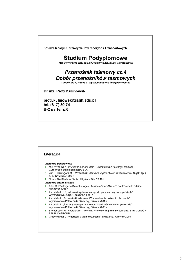 Katedra Maszyn Górniczych, Przeróbczych i Transportowych Studium Podyplomowe http://www.kmg.agh.edu.pl/Dydaktyka/StudiumPodyplomowe Przenośnik taśmowy cz.4 Dobór przenośników taśmowych - dobór mocy napędu i wytrzymałości taśmy przenośnika Dr inż. Piotr Kulinowski [email protected] tel. (617) 30 74 B-2 parter p.6 Literatura Literatura podstawowa 1. MURZYŃSKI Z.: Wytyczne doboru taśm, Bełchatowskie Zakłady Przemysłu Gumowego Stomil Bełchatów S.A. 2. Żur T., Hardygóra M.: „Przenośniki taśmowe w górnictwie”. Wydawnictwo „Śląsk” sp. z o. o., Katowice 1996 r. 3. Norma Gurtförderer für Schüttgüter - DIN 22 101. Literatura uzupełniająca 1. Alles R. Főrdergurte Berechnungen „Transportband-Dienst”. ContiTechnik, Edition Hannover 1985 r. 2. Antoniak J.: „Urządzenia i systemy transportu podziemnego w kopalniach”. Wydawnictwo „Śląsk”, Katowice 1990 r. 3. Antoniak J.: „Przenośniki taśmowe. Wprowadzenie do teorii i obliczenia”. Wydawnictwo Politechniki Gliwickiej, Gliwice 2004 r. 4. Antoniak J.: „Systemy transportu przenośnikami taśmowymi w górnictwie”. Wydawnictwo Politechniki Gliwickiej, Gliwice 2005 r. 5. Breidenbach H.: Foerdergurt - Technik, Projektierung und Berechnung, BTR DUNLOP BELTING GROUP 6. Gładysiewicz L.: Przenośniki taśmowe.Teoria i obliczenia. Wrocław 2003. 1 Wykaz ważniejszych symboli i oznaczeń B C f H K L N P Q S v W α δ η µ – szerokość taśmy, [mm] – współczynnik uwzględniający skupione opory ruchu przenośnika przy nominalnym obciążeniu, – współczynnik oporów ruchu przenośnika przy nominalnym obciążeniu, – wysokość podnoszenia lub opuszczania materiału transportowanego, [m] (różnica poziomów między bębnem czołowym i zwrotnym) – jednostkowa siła rozciągająca taśmę, [N/mm] – długość przenośnika, [m] – moc napędu, [kW] – siła obwodowa na bębnie w ruchu ustalonym, [kN] – wydajność masowa, [t/h] – siła rozciągająca taśmę, [kN] – prędkość taśmy, [m/s] – opory ruchu, [N] – kąt opasania, [º] – kąt nachylenia przenośnika, [º] – sprawność, – współczynnik tarcia, Obliczanie przenośników taśmowych metodą podstawową W ruchu ustalonym (v=const) → Pu = W C v v Pu P m mgsinδ mgcosδ δ mg P = W = µ ⋅ m ⋅ g ⋅ cos δ + m ⋅ g ⋅ sin δ Siła tarcia W przenośniku taśmowym: µ→f m → Σmi Siła ciężkości Pu = WC = f ⋅ ¦ mi ⋅ g ⋅ cos δ + ¦ mi ⋅ g ⋅ sin δ [N] 2 Masy elementów ruchomych przenośnika Do obliczeń oporów ruchu muszą być znane masy wszystkich elementów ruchomych na trasie przenośnika. Masę ruchomą stanowi nie tylko materiał transportowany, ale także masa taśmy i masa obracających się części krążników. Masa urobku obciążającego 1 [m] długości taśmy przenośnika może być wyliczona z wydajności przenośnika i prędkości taśmy według poniższego wzoru: ′ ml = Q 3.6 ⋅ v Masę obrotowych części krążników przypadających na 1 [m] długości przenośnika oblicza się wzorem: ' m'k = m zkg lkg + m'zkd lkd [kg/m] Masę taśmy przypadającą na 1 [m] długości przenośnika oblicza się wzorem: mt = B ⋅ m tj 1000 [kg/m] Opory ruchu Źródła oporów ruchu przenośnika. 1. 2. 3. 4. 5. 6. 7. 8. Opory ruchu krążników. Opory przeginania taśmy. Opory związane z falowaniem urobku. Opory w miejscu załadunku związane z rozpędzaniem ładunku. Opory w miejscu załadunku związane z tarciem. Opory urządzeń czyszczących. Opory przeginania taśmy na bębnach. Opory związane z podnoszeniem urobku. W G - główne W S - skupione W H - podnoszenia 3 Współczynniki oporów ruchu - f Fikcyjny współczynnik tarcia f określany jako współczynnik oporu ruchu obejmuje łącznie opory ruchu górnej i dolnej gałęzi przenośnika. Wartości współczynnika f podane w tablicy dotyczą obciążenia przenośnika ładunkiem w zakresie 70 ÷ 110% ustalonego obciążenia nominalnego i strzałki ugięcia taśmy nie przekraczającej 1%. Wzrost naciągu taśmy i zmniejszenie strzałki ugięcia, podobnie jak i zwiększenie średnicy krążników, powoduje zmniejszenie wartości f. Dobrane z tablicy wartości współczynnika f+ (taśma napędzana silnikiem) i f- (taśma hamowana generatorowo) należy pomnożyć przez współczynnik cT> 1 zwiększając go przy spadku temperatury otoczenia. Przenośniki wznoszące, poziome lub nieznacznie opuszczające f + w zależności od prędkości taśmy Warunki eksploatacji przenośnika v [m/s] Wykonanie normalne, ładunek z przeciętnym tarciem wewnętrznym Dobre ułożenie przenośnika, krążniki lekko obracające się, ładunek z małym tarciem wewnętrznym 1 2 3 4 5 6 0,016 0,0165 0,017 0,018 0,02 0,022 0,0135 0,014 0,015 0,016 0,017 0,019 Niekorzystne warunki ruchowe, ładunek z dużym tarciem wewnętrznym 0,023 ÷ 0,027 Przenośniki oddziałowe w górnictwie podziemnym 0,027 ÷ 0,03 Przenośniki transportujące silnie w dół f- - Warunki eksploatacji przenośnika Dobre ułożenie przenośnika przy normalnych warunkach ruchowych, ładunek z małym do średniego tarciem wewnętrznym 0,012 ÷ 0,016 Współczynniki oporów ruchu - C(L) Do obliczenia oporów skupionych potrzebna jest wartość współczynnika C. Opory skupione są wywoływane przede wszystkim siłami bezwładności i siłami tarcia występującymi w rejonie punktu załadowczego. Wartości współczynnika C w zależności od długości przenośnika L (wg DIN 22101) zestawiono w tablicy. Za pomocą tego współczynnika można dość dokładnie obliczać przenośniki o długości powyżej 80 [m]. Wsp. długości C 2,0 1,9 1,8 1,7 1,6 1,5 1,4 1,3 1,2 1,1 1,05 1,03 1,0 80 100 200 300 500 1000 2000 5000 Długość przenośnika L [m] 4 Opory ruchu WC = WG + WS + WH + WD Opory główne wyliczane są z wzoru: [ ( ) ] WG = f ⋅ L ⋅ mk' + 2 ⋅ m t + m'l ⋅ cos δ ⋅ g [N] Opory skupione określane są przy użyciu współczynnika C. WS = (C − 1) ⋅ WG [N] Opory podnoszen