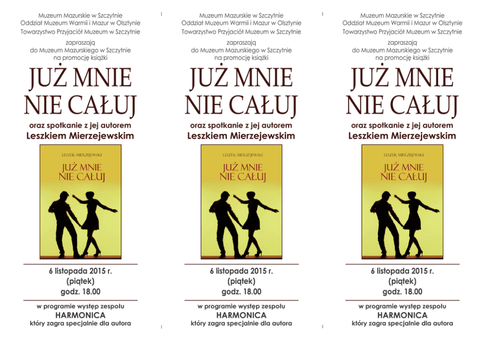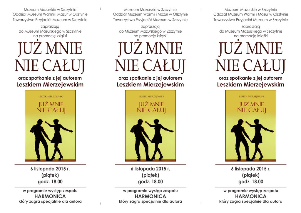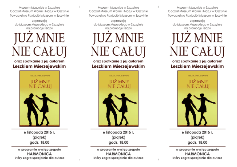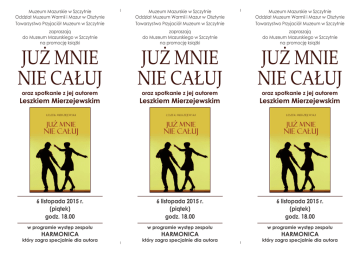 Muzeum Mazurskie w Szczytnie Oddział Muzeum Warmii i Mazur w Olsztynie Towarzystwo Przyjaciół Muzeum w Szczytnie Muzeum Mazurskie w Szczytnie Oddział Muzeum Warmii i Mazur w Olsztynie Towarzystwo Przyjaciół Muzeum w Szczytnie Muzeum Mazurskie w Szczytnie Oddział Muzeum Warmii i Mazur w Olsztynie Towarzystwo Przyjaciół Muzeum w Szczytnie zapraszają do Muzeum Mazurskiego w Szczytnie na promocję książki zapraszają do Muzeum Mazurskiego w Szczytnie na promocję książki zapraszają do Muzeum Mazurskiego w Szczytnie na promocję książki JUŻ MNIE NIE CAŁUJ JUŻ MNIE NIE CAŁUJ JUŻ MNIE NIE CAŁUJ Leszkiem Mierzejewskim Leszkiem Mierzejewskim Leszkiem Mierzejewskim 6 listopada 2015 r. (piątek) godz. 18.00 6 listopada 2015 r. (piątek) godz. 18.00 6 listopada 2015 r. (piątek) godz. 18.00 w programie występ zespołu w programie występ zespołu w programie występ zespołu który zagra specjalnie dla autora który zagra specjalnie dla autora który zagra specjalnie dla autora oraz spotkanie z jej autorem HARMONICA oraz spotkanie z jej autorem HARMONICA oraz spotkanie z jej autorem HARMONICA Leszek Mierzejewski, człowiek o wielkiej pasji życia. Czerpie pełnymi garściami z tego, co mu ono przynosi. Spełniony zawodowo, działacz społeczny, myśliwy, żeglarz, literat, a przy tym malarz - i rysownik - celnie ilustrujący swe opowiadania na łamach „Tygodnika Szczytno” w stałej rubryce „Tropem zwierząt i myśliwych”. To właśnie tam publikowane jego utwory otrzymały w 2015 r. ogólnopolski laur najlepszych opowieści myśliwskich w konkursie periodyku „Łowiec Polski”. Leszek Mierzejewski, człowiek o wielkiej pasji życia. Czerpie pełnymi garściami z tego, co mu ono przynosi. Spełniony zawodowo, działacz społeczny, myśliwy, żeglarz, literat, a przy tym malarz - i rysownik - celnie ilustrujący swe opowiadania na łamach „Tygodnika Szczytno” w stałej rubryce „Tropem zwierząt i myśliwych”. To właśnie tam publikowane jego utwory otrzymały w 2015 r. ogólnopolski laur najlepszych opowieści myśliwskich w konkursie periodyku „Łowiec Polski”. Leszek Mierzejewski, człowiek o wielkiej pasji życia. Czerpie pełnymi garściami z tego, co mu ono przynosi. Spełniony zawodowo, działacz społeczny, myśliwy, żeglarz, literat, a przy tym malarz - i rysownik - celnie ilustrujący swe opowiadania na łamach „Tygodnika Szczytno” w stałej rubryce „Tropem zwierząt i myśliwych”. To właśnie tam publikowane jego utwory otrzymały w 2015 r. ogólnopolski laur najlepszych opowieści myśliwskich w konkursie periodyku „Łowiec Polski”. Jednak życiowe pasje i pasja życia Leszka Mierzejewskiego musiały znaleźć pełniejszy wyraz. W 2014 r. poważył się na pierwszą publikację książkową pt. „Czy stracone lata? Czyli groch z kapustą”. Jego wspomnienia, opowieści, anegdoty, refleksje spotkały się z wielkim zainteresowaniem publiczności lokalnej (nie ukrywajmy – znającej Autora), ale nie tylko. Sukces debiutu literackiego sprowokował Autora do kolejnej publikacji pt. „Prowincja” (wyd. 2015 r.), stanowiącej również niepowtarzalny zbiór opowieści o przypadkach z życia Autora i jego otoczenia. Jednak życiowe pasje i pasja życia Leszka Mierzejewskiego musiały znaleźć pełniejszy wyraz. W 2014 r. poważył się na pierwszą publikację książkową pt. „Czy stracone lata? Czyli groch z kapustą”. Jego wspomnienia, opowieści, anegdoty, refleksje spotkały się z wielkim zainteresowaniem publiczności lokalnej (nie ukrywajmy – znającej Autora), ale nie tylko. Sukces debiutu literackiego sprowokował Autora do kolejnej publikacji pt. „Prowincja” (wyd. 2015 r.), stanowiącej również niepowtarzalny zbiór opowieści o przypadkach z życia Autora i jego otoczenia. Jednak życiowe pasje i pasja życia Leszka Mierzejewskiego musiały znaleźć pełniejszy wyraz. W 2014 r. poważył się na pierwszą publikację książkową pt. „Czy stracone lata? Czyli groch z kapustą”. Jego wspomnienia, opowieści, anegdoty, refleksje spotkały się z wielkim zainteresowaniem publiczności lokalnej (nie ukrywajmy – znającej Autora), ale nie tylko. Sukces debiutu literackiego sprowokował Autora do kolejnej publikacji pt. „Prowincja” (wyd. 2015 r.), stanowiącej również niepowtarzalny zbiór opowieści o przypadkach z życia Autora i jego otoczenia. Teraz mamy zaszczyt, ale przede wszystkim wielką przyjemność, zaprosić Państwa na prezentację i promocję kolejnej książki Leszka Mierzejewskiego. Tytuł jak zwykle prowokatorski - JUŻ MNIE NIE CAŁUJ. Teraz mamy zaszczyt, ale przede wszystkim wielką przyjemność, zaprosić Państwa na prezentację i promocję kolejnej książki Leszka Mierzejewskiego. Tytuł jak zwykle prowokatorski - JUŻ MNIE NIE CAŁUJ. Teraz mamy zaszczyt, ale przede wszystkim wielką przyjemność, zaprosić Państwa na prezentację i promocję kolejnej książki Leszka Mierzejewskiego. Tytuł jak zwykle prowokatorski - JUŻ MNIE NIE CAŁUJ. „Już mnie nie całuj” to opowieści o zdarzeniach ważnych i mniej ważnych, „urzędowych” i mniej „urzędowych”, prywatnych i oficjalnych, śmiesznych i smutnych. Jednak wszystkie one miały duży wpływ na życie Autora oraz wspominanych przez niego w książce – przyjaciół, znajomych. „Już mnie nie całuj” to opowieści o zdarzeniach ważnych i mniej ważnych, „urzędowych” i mniej „urzędowych”, prywatnych i oficjalnych, śmiesznych i smutnych. Jednak wszystkie one miały duży wpływ na życie Autora oraz wspominanych przez niego w książce – przyjaciół, znajomych. „Już mnie nie całuj” to opowieści o zdarzeniach ważnych i mniej ważnych, „urzędowych” i mniej „urzędowych”, prywatnych i oficjalnych, śmiesznych i smutnych. Jednak wszystkie one miały duży wpływ na życie Autora oraz wspominanych przez niego w książce – przyjaciół, znajomych. Spotkamy się więc w najnowszej 