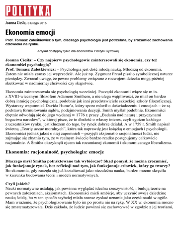 Joanna Cieśla, 3 lutego 2015 Ekonomia emocji Prof. Tomasz Zaleśkiewicz o tym, dlaczego psychologia jest potrzebna, by zrozumieć zachowania człowieka na rynku. Artykuł dostępny tylko dla abonentów Polityki Cyfrowej Joanna Cieśla: – Czy najpierw psychologowie zainteresowali się ekonomią, czy też ekonomiści psychologią? Prof. Tomasz Zaleśkiewicz: – Psychologia jest dość młodą nauką. Młodszą od ekonomii. Zatem nie miała szansy jej wyprzedzić. Ale już np. Zygmunt Freud pisał o symbolicznej naturze pieniędzy. Zwracał uwagę, że pewne problemy związane z rozwojem dziecka mogą później skutkować w nadmiernej chciwości czy skąpstwie. Ekonomia zainteresowała się psychologią wcześniej. Początki ekonomii wiąże się m.in. z XVIII-wiecznym filozofem Adamem Smithem, a nie ulega wątpliwości, że miał on bardzo dobrą intuicję psychologiczną, podobnie jak inni przedstawiciele szkockiej szkoły filozoficznej. Wystarczy wspomnieć Davida Hume’a, który sporo mówił o doświadczeniu i emocjach – że są podstawą formułowania sądów, podejmowania decyzji. Smith myślał podobnie. Ekonomiści chętnie odwołują się do jego wydanej w 1776 r. pracy „Badania nad naturą i przyczynami bogactwa narodów”, w której pisze, że to dbałość o własny interes, czyli egoizm każdego z uczestników rynku, jest kluczem do tego, by rynek dobrze działał. A w 1759 r. Smith napisał świetną „Teorię uczuć moralnych”, która tak naprawdę jest książką o emocjach i psychologii. Ekonomiści jednak jakoś o niej zapomnieli – przyjęli aksjomat o racjonalności ludzi, nie zajmując się zbytnio tym, że w realnym świecie bardzo rzadko postępujemy całkowicie racjonalnie. A Smitha okrzyknęli ojcem tak rozumianej ekonomii i ekonomicznego liberalizmu. Ekonomia: racjonalność, psychologia: emocje Dlaczego myśl Smitha potraktowano tak wybiórczo? Skąd pomysł, że można zrozumieć, jak funkcjonuje rynek, bez refleksji nad tym, jak funkcjonuje człowiek, który go tworzy? Bo ekonomia, gdy zaczęła się już kształtować jako niezależna nauka, bardzo mocno skręciła w kierunku budowania teorii i modeli normatywnych. Czyli jakich? Nauki normatywne ustalają, jak powinna wyglądać idealna rzeczywistość, i budują teorie na pewnych założeniach, aksjomatach. Ekonomiści mieli ambicje, aby uczynić swoją dziedzinę nauką ścisłą, bo w ten sposób szybciej miała szanse zyskać uznanie jako część nauki w ogóle. Mam wrażenie, że psychologizowanie było im po prostu nie na rękę. W XX w. ekonomia mocno się zmatematyzowała. Dziś zakłada, że ludzie powinni się zachowywać w zgodzie z jej teoriami, a jeśli tego nie robią, to konkluduje, że nie są racjonalni. Psychologia natomiast, która jest nauką deskryptywną, obserwuje, co robią ludzie, i próbuje te obserwacje uogólniać. To fundamentalna różnica podejść. Ale udało się te podejścia połączyć, skoro powstała psychologia ekonomiczna. Czym ona się zajmuje? Kiedy my, psychologowie, badamy zachowanie ludzi – na przykład to, w jaki sposób podejmują decyzje – to robimy eksperyment. Dajemy uczestnikom zadania i widzimy: o, tu kierują się emocjami i to przynosi im skutki inne niż oczekiwane, prawdopodobnie popełniają błąd. Skoro mówimy o błędzie, to powinniśmy wiedzieć, co by było, gdyby błędu nie popełniali. Czyli – jak mógłby funkcjonować idealny rynek. A to pokazuje ekonomia. Weźmy jedno z jej podstawowych praw – popytu i podaży. Ono bardzo czytelnie tłumaczy, w jaki sposób kształtują się ceny. To, że w pewnych warunkach reguła ta może się nie sprawdzać – na przykład rośnie popyt, ale cena nie rośnie – nie znaczy, że w ogóle nie ma ono sensu. Możemy się do niego odwołać, porównywać z tym to, co obserwujemy. Tym właśnie zajmuje się psychologia ekonomiczna. Przenikanie się dziedzin obserwowane w ostatnich 10–15 latach wpisuje się w ogólniejszą tendencję: cała nauka staje się coraz bardziej interdyscyplinarna. Czy w tej chwili ktoś jeszcze pisze tak, jak w poradnikach dla inwestorów z lat 90., żeby przy decyzjach finansowych wyłączyć emocje? Ludzie, którzy działają na rynkach finansowych, cały czas w ten sposób myślą, bo chyba każdy podjął nietrafne decyzje, działając pod wpływem emocji. Z jednej strony one z pewnością mogą zaburzać racjonalne myślenie. Z drugiej – nie możemy udawać, że nie przeżywamy emocji. Gdyby one tylko upośledzały nasze działanie, to prędzej czy później w procesie ewolucji zostałyby wyeliminowane. Niekiedy mogą wręcz stanowić wskazówkę, jak działać, zanim świadomie przeanalizujemy sytuację. W psychologii zauważono, że emocje mają wartość informacyjną – podpowiadają nam, czy funkcjonujemy w otoczeniu, które jest dla nas przyjazne. Także na giełdzie mogą pomagać w podejmowaniu decyzji, na przykład uświadamiać, że ryzyko, które podejmujemy, jest zbyt wysokie. Oczywiście, problem z emocjami – jak ze wszystkim – jest wtedy, gdy jest ich zbyt dużo, są bardzo silne. Nie ma jednak sensu próbować się ich pozbyć, co zresztą nie jest możliwe, ale warto nauczyć się, jak odczytywać i wykorzystywać informacje dzięki nim zdobyte. Gdy próbujemy się od emocji oderwać, wypierać je, znów pojawia się kłopot. Dobrze pokazują to badania nad ludźmi w sytuacji zadłużenia, którzy przeżywają wiele negatywnych emocji naraz. Próbując je wypierać, zachowują się coraz bardziej nieracjonalnie. To przecież paradoks. Ale tak to działa. Emocją, która pojawia się wraz z problemami finansowymi, jest wstyd. Jest ona bardzo nieprzyjemna zwłaszcza we współczesnych społeczeństwach nastawionych na osiąganie sukcesów, w których nie można przyznawać się do błędów i trzeba demonstrować wysoką samoocenę. Ludzie próbują więc uciec od wstydu, udając, że nie mają długu. Unikają kontaktów z bankiem c