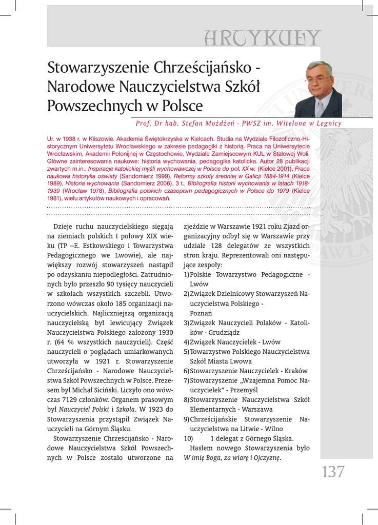 ARTYKUŁY Stowarzyszenie Chrześcijańsko Narodowe Nauczycielstwa Szkół Powszechnych w Polsce P rof. Dr hab. St efan Możd że ń - P WSZ im. W it elona w L eg nic y Ur. w 1938 r. w Kliszowie. Akademia Świętokrzyska w Kielcach. Studia na Wydziale Filozoficzno-Historycznym Uniwersytetu Wrocławskiego w zakresie pedagogiki z historią. Praca na Uniwersytecie Wrocławskim, Akademii Polonijnej w Częstochowie, Wydziale Zamiejscowym KUL w Stalowej Woli. Główne zainteresowania naukowe: historia wychowania, pedagogika katolicka. Autor 28 publikacji zwartych m.in.: Inspiracje katolickiej myśli wychowawczej w Polsce do poł. XX w. (Kielce 2001), Praca naukowa historyka oświaty (Sandomierz 1999), Reformy szkoły średniej w Galicji 1884-1914 (Kielce 1989), Historia wychowania (Sandomierz 2006), 3 t., Bibliografia historii wychowania w latach 19181939 (Wrocław 1978), Bibliografia polskich czasopism pedagogicznych w Polsce do 1979 (Kielce 1981), wielu artykułów naukowych i opracowań. Dzieje ruchu nauczycielskiego sięgają na ziemiach polskich I połowy XIX wieku (TP –E. Estkowskiego i Towarzystwa Pedagogicznego we Lwowie), ale największy rozwój stowarzyszeń nastąpił po odzyskaniu niepodległości. Zatrudnionych było przeszło 90 tysięcy nauczycieli w szkołach wszystkich szczebli. Utworzono wówczas około 185 organizacji nauczycielskich. Najliczniejszą organizacją nauczycielską był lewicujący Związek Nauczycielstwa Polskiego założony 1930 r. (64 % wszystkich nauczycieli). Część nauczycieli o poglądach umiarkowanych utworzyła w 1921 r. Stowarzyszenie Chrześcijańsko - Narodowe Nauczycielstwa Szkół Powszechnych w Polsce. Prezesem był Michał Siciński. Liczyło ono wówczas 7129 członków. Organem prasowym był Nauczyciel Polski i Szkoła. W 1923 do Stowarzyszenia przystąpił Związek Nauczycieli na Górnym Śląsku. Stowarzyszenie Chrześcijańsko - Narodowe Nauczycielstwa Szkół Powszechnych w Polsce zostało utworzone na zjeździe w Warszawie 1921 roku Zjazd organizacyjny odbył się w Warszawie przy udziale 128 delegatów ze wszystkich stron kraju. Reprezentowali oni następujące zespoły: 1)Polskie Towarzystwo Pedagogiczne Lwów 2)Związek Dzielnicowy Stowarzyszeń Nauczycielstwa Polskiego Poznań 3)Związek Nauczycieli Polaków - Katolików - Grudziądz 4)Związek Nauczycielek - Lwów 5)Towarzystwo Polskiego Nauczycielstwa Szkół Miasta Lwowa 6)Stowarzyszenie Nauczycielek - Kraków 7)Stowarzyszenie „Wzajemna Pomoc Nauczycielek” - Przemyśl 8)Stowarzyszenie Nauczycielstwa Szkół Elementarnych - Warszawa 9)Chrześcijańskie Stowarzyszenie Nauczycielstwa na Litwie - Wilno 10) 1 delegat z Górnego Śląska. Hasłem nowego Stowarzyszenia było W imię Boga, za wiarę i Ojczyznę. 137 ARTICLES Michał Siciński ze Lwowa, który wygłosił referat pt. Dlaczego się zrzeszamy. Stwierdził, że łączenie się jest oparte na ideach narodowych, ideałach twórcach Konstytucji 3 Maja, bohaterów walk o wolność i niepodległość narodu, obrońców o zachowanie ducha narodowego w czasach niewoli oraz wszystkich pracowników nad wskrzeszaniem i rozwinięciem szkoły polskiej. Nauczycielstwo, zahartowane w walce postanowiło zjednoczyć się, stawiając sobie za cel wychowanie młodych pokoleń na zasadach wskazanych przez Komisję Edukacyjną. Siciński twierdził, że nauczycielstwo polskie musi stanąć zjednoczone do pracy nad budową polskiej szkoły powszechnej. „Idąc z postępem, winno czerpać wskazania z ducha narodu, opierając się na zasadach chrześcijańskich”1. Pierwszym i najważniejszym zadaniem Stowarzyszenia miała być obrona szkoły polskiej przed eksperymentami obcych mędrców międzynarodowych lub fałszywych proroków, głoszących zasady szczęścia ludzkości dla uśpienia czujności rozsądku, dla przeprowadzenia tylko sobie znanych celów. Siciński stwierdził, że do walki z przebiegłym wrogiem potrzebna jest organizacja oparta na zasadach wykluczających fałsz i obłudę, uznająca tylko szlachetną miłość bliźniego i prawdę. Stowarzyszenie miało czuwać nad godnością stanu nauczycielskiego i zapewniać mu należne znaczenie pracy nauczycielskiej i poszanowanie u wszystkich. Za podstawę miała być brana wartość pracy nauczycielskiej, a nie korzyści materialnych dla siebie. Stowarzyszenie miało troszczyć się o zapewnienie nauczycielstwu bytu materialnego, umożliwiającego mu twórczą pracę wychowawczą, 138 1 Nauczyciel Polski 1922 nr 3 s. 15. 2 jw nr 18 s.73. możność spokojnej rozważania refleksji pedagogicznej. Stowarzyszenie zapewniało swoim członkom wzajemną pomoc przez tworzenie fundacji zapomogowych, zakładanie kolonii leczniczych, wypoczynkowych, biur pedagogicznych i pomocy prawnej i domów towarowych. Stowarzyszenie miało także zająć się opracowania książek dla nauczycieli i młodzieży i zunifikowaniem szkolnictwa polskiego. Miało współpracować z władzami szkolnymi i domagało się wpływu na ustawodawstwo i życie szkolne. Stowarzyszenie walczyło z agitacją przeciwną zasadom pedagogice polskiej, wynikającą z miłości Boga i Ojczyzny. Miało dążyć do zjednoczenia pozostałych zrzeszeń nauczycielskich szkół powszechnych dla dobra szkoły i narodu. Referent Majeranowski stwierdził, że wytyczną SChNNSP miała być współpraca z władzami nad stworzeniem i urządzeniem doskonałej szkoły powszechnej, odpowiadającej warunkom i potrzebom narodu. Dalej referent określił stosunek stowarzyszenia do władzy, domagał się, by władze powoływały Stowarzyszenie do współpracy i korzystały z jego doświadczenia. Za najważniejsze potrzeby szkolnictwa uznano: 1. Ustalenie zasad nauczania i wychowywania narodowo - religijnego. 2. Budowę i wyposażenie szkół. 3. Pracę oświatową pozaszkolną. Wychowanie nasze powinno i musi być narodowe, i oparte na zasadach chrześcijańskich. Winno postępować z duchem czasu, strzec pilnie i czujnie interesów Państwa”2