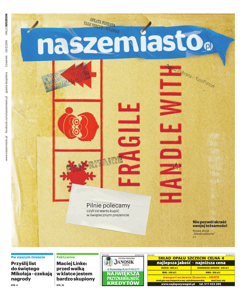 HALLO SZCZECIN 03.12.2014 Czwartek gazeta bezpłatna facebook.com/naszemiasto.pl www.naszemiasto.pl Pilnie polecamy czyli co warto kupić w świątecznym prezencie Nie pozwól skraść swojej tożsamości Rusza akcja „Nieskradzione” s. 7 #w naszym mieście #aktywnie Przyślij list do świętego Mikołaja - czekają nagrody Maciej Linke: przed walką w klatce jestem bardzo skupiony STR. 4 STR. 15 REKLAMA S015003745B REKLAMA S015002277C CENTRUM FINANSOWE SZCZECIN ul. Krzywoustego 28, tel. 91 433 22 77 ORZECH - 660 zł/t EKOGROSZEK/GROSZEK - 640 zł/t NAJWIĘKSZA PRZYZNAWALNOŚĆ KREDYTÓW MIAŁ - 420 zł/t KOKS - 930 zł/t 2 #hallo szczecin 02 CZWARTEK, 3 GRUDNIA 2015 NASZEMIASTO www.naszemiasto.pl WEEKEND ZAPOWIADA SIĘ POGODNIE I BEZ OPADÓW. TYLKO W PIĄTKOWY WIECZÓR MOŻE POKROPIĆ I TO PRZEDE WSZYSTKIM NAD MORZEM. KRZYSZTOF ŚCIBOR Z BIURA PROGNOZ POGODY CALVUS #hallo szczecin #coraz bliżej święta Olek Różanek, wokalista #z miasta POMÓŻ DZIECIOM WYGRAĆ NAGRODY! Blisko 3000 uczniów zgłosiło swoje reklamy społeczne promujące wiedzę o żywieniu w konkursie Tesco dla Szkół - „Przyszłość na talerzu”. Dzieci z naszego województwa stworzyły filmy i plakaty, które zachęcają do zdrowego żywienia! Teraz od decyzji internautów będzie zależeć, która szkoła w naszym województwie zdobędzie nagrodę. Głosowanie na prace trwa od 1 do 14 grudnia. Aby zagłosować na wybraną pracę, trzeba zarejestrować się na stronie konkursu www.tescodlaszkol.pl, wejść w zakładkę Galerii Prac i wyszukać szkołę ze swojej okolicy. Każdy zarejestrowany kibic w terminie 1-14 grudnia może oddawać codziennie 1 głos na każdą wybraną pracę, głosy można oddawać na wiele różnych prac. Więcej informacji na www.tescodlaszkol.pl. FOT. ARCHIWUM Przyłączamy się do świątecznej akcji “Jestem Mikołajem”, bo to wspaniała inicjatywa. #konkurs #z miasta Budują dom kota w schronisku ZWIERZĘTA - Szczecińskie schroni- sko będzie miało nowy dom kota. Poprowadzone zostały już wszystkie przyłącza. W najbliższych dniach przywiezione będą specjalne, gotowe budynki, w których zamieszkają zwierzaki. Każde pomieszczenie będzie miało 2,5 na 6 metrów. Jedno przeznaczone będzie dla dużych kotów, jedno dla mniejszych, a trzecie posłuży jako izolatka. Po przywiezieniu i ustawieniu zostaną wyposażone m.in. w klatki, leżanki i zabawki. W podstawowym wyposażeniu natomiast będą zlewozmywaki i stalowe ławki. Domy kota będą ogrzewane. Wszystkie zostaną ogrodzone, a przed nimi do dyspozycji czworonogów znajdzie się niewielki wybieg. Zadanie realizowane jest w ramach Szczecińskiego Budżetu Obywatelskiego, z którego na ten cel przeznaczono 51 tysięcy złotych netto. Zakład Usług Komunalnych dołożył 28,800 złotych netto. MA 12 METRÓW WYSOKOŚCI, WAŻY PONAD TONĘ, A ZA KILKA DNI OŚWIETLI JĄ 7 TYSIĘCY LAMPEK. W PONIEDZIAŁEK ROZPOCZĘŁO SIĘ SKŁADANIE ŚWIĄTECZNEJ CHOINKI POD URZĘDEM MIASTA SZCZECIN. TO NAJWIĘKSZE DRZEWKO W MIEŚCIE. CHOINKA PRZED MAGISTRATEM TO JUŻ TRADYCJA. NIESTETY, DRZEWKO JEST SZTUCZNE I NIE PACHNIE, ALE SZCZEGÓLNIE WIECZOREM WYGLĄDA UROCZO. #głosujemy FOT. SEBASTIAN WOŁOSZ Darmowa mammografia FOT. SEBASTIAN WOŁSOZ OD JUTRA STARTUJE TEGOROCZNA AKCJA ŚWIEĆ SIĘ Z ENERGĄ PODOBNIE JAK W ZESZŁYM ROKU SZCZECIN BIERZE UDZIAŁ W TYM PLEBISCYCIE Do Szczecina przyjechała świąteczna ciężarówka Coca-Coli #zdrowie WYBIERAMY NAJŁADNIEJ OŚWIETLONE MIASTO MOŻNA GŁOSOWAĆ #dla dzieci BADANIA - Grudzień to ostatni miesiąc i ostatnia szansa na wykonanie bezpłanych badań dla pań. Specjalny mammobus LuxMedu stanie w Szczecinie przy al. Wyzwolenia 44 a, przy Centrum Handlowym Fala. Mammobus będzie przyjmował panie od 4 do 7 grudnia. Lux Med zaprasza więc na bezpłatną mammografię panie w wieku od 50 do 69 lat. Te panie moga przyjść do mammobusu bez skierowania od lekarza. Badanie te są organizowane w ramach Populacyjnego Programu Wczesnego Wykrywania Raka Piersi. Jest refundowane kobietom co 2 lata przez Narodowy Fundusz Zdrowia (lub co 12 miesięcy dla kobiet, które w ramach realizacji Programu otrzymały odpowiednie pisemne wskazanie). #rozmowa Sebastian Murawski Skąd piłka nożna w pana życiu? W mojej rodzinie od wujków po tatę i braci wszyscy grali w piłkę. Ale miłość do tej dyscypliny zaszczepił we mnie szczególnie mój starszy brat. Kiedy tylko rano wstawałem od razu pojawiała się piłka i towarzyszyła mi przez cały dzień, aż do wieczora. Nigdy sobie też nie odpuściłem. Chciałem grać i robiłem wszystko, by robić to co dziś robię. Kiedyś jako chłopiec pewnie chodził pan na mecze Pogoni. Czy wtedy myślał pan, by być jak ci zawodnicy? Moim marzeniem było zagrać w ekstraklasie. Często ze znajomymi sobie żartowałem, że kiedyś też będę biegał po boisku w Szczecinie. Nagle moje marzenie się spełniło. Wiem, że wywalczyłem to ciężką pracą i mocno do tych marzeń dążyłem, by im pomóc. Kiedyś byłem tutaj na meczu reprezentacji Polski, potem zbierałem autografy od zawodników, dziś sam je rozdaję. To niesamowite i bardzo się z tego cieszę, kiedy mogę sprawić radość osobom, które tak jak ja kochają piłkę nożną. Jak było u pana ze sportem w szkole? Na lekcjach wychowania fizycznego zawsze byłem aktywny i miałem celujące oceny. Dążyłem do jak najlepszych wyników w każdej dyscyplinie sportowej, czy to była koszykówka, czy siatkówka, czy biegi, albo skoki w dal. Zawsze chętnie ćwiczy- łem, czułem że po prostu kocham sport. Z innych przedmiotów nie szło aż tak dobrze, ale do tego chyba trzeba dorosnąć. Dziś będąc studentem w Instytucie Kultury Fizycznej trzeba pogodzić zdobywanie wiedzy i umiejętności fizycznych. Jedno nie istnieje bez drugiego. Młodym osobom wydaje się, że wystarczy być świetnym sportowcem i nie trzeba się uczyć. Zapewniam, że to nieprawda. Dziś na przykład zaraz po spotkaniu jadę n