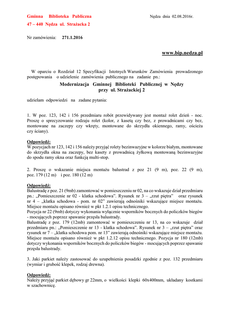 Gminna Biblioteka Publiczna Nędza dnia 02.08.2016r. 47 – 440 Nędza ul. Strażacka 2 Nr zamówienia: 271.1.2016 www.bip.nedza.pl W oparciu o Rozdział 12 Specyfikacji Istotnych Warunków Zamówienia prowadzonego postępowania o udzielenie zamówienia publicznego na zadanie pn.: Modernizacja Gminnej Biblioteki Publicznej w Nędzy przy ul. Strażackiej 2 udzielam odpowiedzi na zadane pytania: 1. W poz. 123, 142 i 156 przedmiaru robót przewidywany jest montaż rolet dzień - noc. Proszę o sprecyzowanie rodzaju rolet (kolor, z kasetą czy bez, z prowadnicami czy bez, montowane na zaczepy czy wkręty, montowane do skrzydła okiennego, ramy, ościeża czy ściany). Odpowiedź: W pozycjach nr 123, 142 i 156 należy przyjąć rolety bezinwazyjne w kolorze białym, montowane do skrzydła okna na zaczepy, bez kasety z prowadnicą żyłkową montowaną bezinwazyjne do spodu ramy okna oraz funkcją multi-stop. 2. Proszę o wskazanie miejsca montażu balustrad z poz 21 (9 m), poz. 22 (9 m), poz. 179 (12 m) i poz. 180 (12 m) Odpowiedź: Balustradę z poz. 21 (9mb) zamontować w pomieszczeniu nr 02, na co wskazuje dział przedmiaru pn.: „Pomieszczenie nr 02 - klatka schodowa”. Rysunek nr 3 – „rzut piętra” oraz rysunek nr 4 – „klatka schodowa - pom. nr 02” zawierają odnośniki wskazujące miejsce montażu. Miejsce montażu opisano również w pkt 1.2.1 opisu technicznego. Pozycja nr 22 (9mb) dotyczy wykonania wyłącznie wsporników bocznych do policzków biegów - mocujących poprzez spawanie przęsła balustrady. Balustradę z poz. 179 (12mb) zamontować w pomieszczeniu nr 13, na co wskazuje dział przedmiaru pn.: „Pomieszczenie nr 13 - klatka schodowa”. Rysunek nr 3 – „rzut piętra” oraz rysunek nr 7 – „klatka schodowa pom. nr 13” zawierają odnośniki wskazujące miejsce montażu. Miejsce montażu opisano również w pkt 1.2.12 opisu technicznego. Pozycja nr 180 (12mb) dotyczy wykonania wsporników bocznych do policzków biegów - mocujących poprzez spawanie przęsła balustrady. 3. Jaki parkiet należy zastosować do uzupełnienia posadzki zgodnie z poz. 132 przedmiaru (wymiar i grubość klepek, rodzaj drewna). Odpowiedź: Należy przyjąć parkiet dębowy gr 22mm, o wielkości klepki 60x400mm, układany kostkami w szachownicę. 4. Czy przedmiar poz. 132 jest wystarczający? Zakładane jest uzupełnienie parkietu paskiem o szerokości 15 cm, co ze względów technologicznych wydaje się niemożliwym do wykonania. Proszę o ewentualną korektę przedmiaru. Odpowiedź: Przedmiar robót pełni funkcję pomocniczą dla Wykonawcy robót w celu kalkulacji ceny ofertowej. W poz. nr 132 przyjęto minimalną technologicznie ilość robót niezbędną do ich wykonania. Wykonawca może wkalkulować w cenę zwiększony zakres robót, jeżeli technologia realizacji po stronie Wykonawcy będzie tego wymagała. 5. Czy ścianki działowe murowane mają być z bloczków silikatowych (projekt), czy z betonu komórkowego (przedmiar robót) Odpowiedź: Zgodnie z pkt 1.4.4. STWiOR (str. 3), stanowiącym załącznik do SIWZ, stanowi: W przypadku rozbieżności w ustaleniach poszczególnych dokumentów obowiązująca kolejność ich ważności: 1. Dokumentacja projektowa 2. Specyfikacje techniczne 3. Przedmiar robót Ściany działowe murowane więc będą z bloczków silikatowych. 6. Czy nowe ścianki działowe (pomieszczenia 7, 9, 10) murowane mają być na posadzce parkietowej? Jeżeli nie - proszę o uzupełnienie przedmiarów o wykonanie robót z tym związanych (wycięcie i rozbiórka parkietu, uzupełnienie listew przyściennych z określeniem ich rodzaju) Odpowiedź: Zgodnie z opisem rodzaju posadzek na rysunku nr 2 (inwentaryzacja – rzut piętra), posadzkę stanowi parkiet drewniany, który zgodnie ze sztuką budowlaną i warunkami technicznymi wykonania robót (pkt 10.2 STWiOR, str. 20), powinien zostać docięty i rozebrany w miejscu nowych murowanych ścianek działowych. Po wykonaniu ścianki zamontować należy listwę przyścienną zgodą z rodzajem posadzki - listwę drewnianą dębową o przekroju 2x5cm w ilości łącznej 14,5m. Na podstawie pkt 9. STWiOR (str. 12), stanowiącym załącznik do SIWZ, Wykonawca uwzględni w cenie jednostkowej pozycji podstawowych wszystkie koszty robót tymczasowych jak również koszty robót towarzyszących niezbędnych do wykonania i odbioru robót podstawowych. Wszystkie roboty powinny być wykonane jako kompletne w zakresie przyjętego systemu oraz technicznie poprawne z zapewnieniem trwałości i najwyższej jakości. Wartość robót związaną z wycięciem i rozbiórką parkietu, uzupełnieniem listew przyściennych należy uwzględnić w wycenie robót podstawowych, w pozycjach związanych z wykonaniem ścianek działowych. 7. Jakie wentylatory zastosować do wyceny poz. 102 i 228 przedmiaru robót? Wymienione w opisie pozycji wentylatory EDM60 nie są dostępne w sprzedaży. Odpowiedź: Dopuszcza się możliwość zastosowania wentylatorów czyli minimalnej wydajności 60m3/h, więc np. EDM 80. o lepszych parametrach, 8. Pozycje 81 i 213 przedmiaru powinny (prawdopodobnie) mieć obmiary odpowiednio 3,14*0,2*2 = 1,256 m2 oraz 3,14*0,2*4 = 2,512 m2. Proszę o ewentualne skorygowanie przedmiaru. Odpowiedź: Obmiar pozycji nr 81 powinien wynosić: 1,256m2. Obmiar pozycji nr 213 powinien wynosić: 2,512m2. Przedmiar robót pełni funkcję pomocniczą dla Wykonawcy robót w celu kalkulacji ceny ofertowej. Nędza dnia: 02.08.2016r. p.o. Dyrektora GBP w Nędzy Helena Krziżek ............................................................................................................................... ( Kierownik Jednostki )