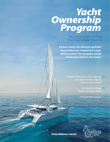 Yacht Ownership Program Posiadaj jacht z flot y SailingEurope Charter Chcesz cieszyć się własnym jachtem bez problemów związanych z jego utrzymaniem? Ten program został stworzony właśnie dla Ciebie. Żaglówki Beneteau i Sun Odyssey oraz katamarany Lagoon w doskonałym stanie Ekskluzywna baza Rogač na wyspie Šolta Profesjonalna usługa Twój ulubiony czarter Nasza flota Beneteau Cyclades 39.3 Cena Rok produkcji Kabiny Miejsca leżące 59.800 €* 2007 3 + saloon 6+2 Prysznice 2 WC 2 Długość 11.97 m Beneteau Cyclades 43.4 Cena Rok produkcji Kabiny Miejsca leżące 72.680 €* 2007 4 + saloon 8+2 Prysznice 2 WC 2 Długość 13.26 m Beneteau Cyclades 50.5 Cena Rok produkcji Kabiny Miejsca leżące Prysznice WC Długość *Bez VAT Yacht Ownership Program 115.000 €* 2007 5 + 1 + saloon 10 + 2 3 3+1 15.65 m Lagoon 400 Cena 257.000 €* Rok produkcji 2012 Kabiny 4+2 Miejsca leżące 10 + 2 Prysznice 4 WC 4 Długość 11.97 m Lagoon 450 Cena 365.000 €* Rok produkcji 2012 Kabiny 4+1 Miejsca leżące 9+2 Prysznice 4 WC Długość 4+1 13.96 m Oceanis 50 Family Cena 218.000 €* Rok produkcji 2012 Kabiny 5 Miejsca leżące 10 + 2 Prysznice 3 WC 3 Długość 15.42 m Sun Odyssey 349 Cena Rok produkcji Kabiny Miejsca leżące 105.000 €* 2015 3 6+2 Prysznice 1 WC 1 Długość 10.34 m *Bez VAT www.sailingeuropecharter.com Cele podróży Destinations Chorwacja to śródziemnomorski kraj z ponad tysiąc wysp, kryształowo czystym morzem oraz ponad tysiącletnim dziedzictwem architektonicznym. Dzięki temu jest ona jedna z najbardziej atrakcyjnych destynacji żeglarskich żeglarzy, oferuje szereg możliwości żeglowania – od pokoju małych miejscowości na oddalonych wyspach do zgiełku dużych nadbrzeżnych miast. Odkryj piękno wysp i wybrzeża Chorwacji oraz wybierz jedną z zalecanych tras, które zaczynają się w naszej bazie w miejscowości Rogač. Dubrovnik Lastovo Šibenik Split Mljet Yacht Ownership Program Bol Primošten Šibenik Trogir Split Rogač Bol Vis Hvar Korčula Lastovo Vis Mljet Dubrovnik Hvar www.sailingeuropecharter.com Nasza baza Our Base Baza Rogač Baza Rogač znajduje się na północnej części wyspy Šolta, w zatoce otoczonej drzewami sosny, a od Splitu oddalona jest zaledwie o 9 mil morskich (16 km). Rogač rozwinął się na potrzeby pobliskiego miasteczka Grohote, najstarszego i największego osiedla na wyspie, usytuowanego we wnętrzu wyspy. Rogač dzisiaj stanowi główne połączenie wyspy z lądem. Morze w zatoce jest czyste i przejrzyste, więc śmiało możesz popływać zanim Twój jacht będzie przygotowany do wypłynięcia. Zatoka nie jest zbyt wielka, a nasza baza znajduje się tylko kilka kroków od plaży, kawiarni i pizzerii. Można podziwiać widok na tradycyjne kamienne domy, kościół Św. Teresy oraz inne atrakcji. Zalety bazy Rogač // Mała prywatna baza, bez tłumów // Baza położona jest tuż obok plaży // Bezpłatny parking // Bezpłatny Wi-Fi // Stacja paliw znajduje się zaledwie 100 m od plaży //Urokliwy klimat małego miasteczka adriatyckiego, wypoczynek rozpoczyna się natychmiast po przyjeździe // Bankomat znajduje się zaledwie 300 m od bazy // Bliskość najlepszych destynacji żeglarskich – do wysp Brač, Hvar i Vis można dopłynąć w zaledwie kilka godzin JUST 30 MINUTELIST FROM SP AIRPORT Ciesz się ekscytującą i szybką, ale bezpieczną jazdą w prywatnej łodzi motorowej, która zawiezie Cię bezpośrednio ze Splitu lub z lotniska w Splicie do naszej prywatnej bazy w miejscowości Rogač. Do swego jachtu możesz dotrzeć w ciągu zaledwie 30 minut. Oprócz łodzią motorową, do Šolty i Rogaču można dopłynąć promem lub katamaranem, które wypływają ze splickiego portu. Promy i katamarany kursują regularnie cały rok (od rana do wieczora), a w sezonie uruchamiane są dodatkowe połączenia. Podróż promem trwa 45 minut, a katamaranem 30 minut. AT SPEEDBO Yacht Ownership Program Jak trafić do Rogaču Trasy Propozycja trasy (7 dni) Odkryj kulturę Odkryj kulturę – trasa południowa Oprócz kryształowo czystego morza, Dalmacja oferuje interesującą mozaikę dziedzictwa historycznego. Leżący na styku światów Wschodu i Zachodu, ten region jest prawdziwym bastionem kultury, bogatym w zabytki malarstwa, architektury i sztuki o klasycznej harmonii i długiej tradycji. (Rogač-Brač-Hvar-Palmižana-Vis-Rogač) Odkryj kulturę – trasa północna (Rogač-Zlarin-Prvić-Skradin (NP Krka)-Tribunj-PrimoštenTrogir-Rogač) Odkryj przyrodę – trasa południowa (Rogač-Brač-Hvar-Paklinski otoci-Vis-Komiža-PrimoštenTrogir-Rogač) Odkryj przyrodę – trasa północna (Rogač-Kaprije-NP Kornati (Lavsa,Telašćica, Dugi otok, Opat)Primošten-Rogač) Odkryj przyrodę Przyrodnicze trasy żeglarskie oferują możliwość odwiedzenia licznych parków narodowych i krajobrazowych na wybrzeżu Adriatyku, które jest jednym z ekologicznie najlepiej zachowanych regionów Europy. Propozycja trasy (14 dni) Dubrovnik (Rogač-Brač-Hvar-Paklinski otoci-Korčula-Dubrovnik-MljetLastovo-Korčula-Vis-Rogač) Kornati (Rogač-Kaprije-NP Kornati (Lavsa,Telašćica, Opat)-PrimoštenKomiža-Hvar-Brač-Rogač) www.sailingeuropecharter.com Informacje i kontakt Zachęcamy do kontaktu z nami, aby dowiedzieć się więcej o możliwościach i szczegółach naszego programu Relax Yacht Ownership: [email protected] T: +385 1 488 2200, +385 1 488 2201 Skype sailing.europe www.sailingeurope.com