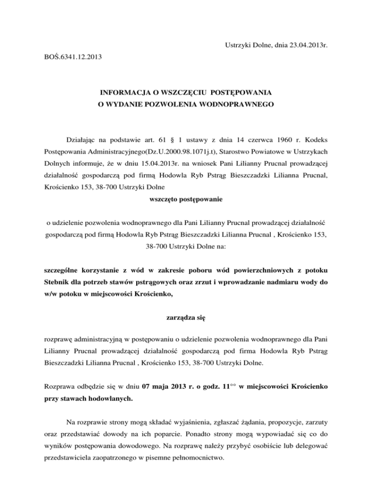 Ustrzyki Dolne, dnia 23.04.2013r. BOŚ.6341.12.2013 INFORMACJA O WSZCZĘCIU POSTĘPOWANIA O WYDANIE POZWOLENIA WODNOPRAWNEGO Działając na podstawie art. 61 § 1 ustawy z dnia 14 czerwca 1960 r. Kodeks Postępowania Administracyjnego(Dz.U.2000.98.1071j.t), Starostwo Powiatowe w Ustrzykach Dolnych informuje, Ŝe w dniu 15.04.2013r. na wniosek Pani Lilianny Prucnal prowadzącej działalność gospodarczą pod firmą Hodowla Ryb Pstrąg Bieszczadzki Lilianna Prucnal, Krościenko 153, 38-700 Ustrzyki Dolne wszczęto postępowanie o udzielenie pozwolenia wodnoprawnego dla Pani Lilianny Prucnal prowadzącej działalność gospodarczą pod firmą Hodowla Ryb Pstrąg Bieszczadzki Lilianna Prucnal , Krościenko 153, 38-700 Ustrzyki Dolne na: szczególne korzystanie z wód w zakresie poboru wód powierzchniowych z potoku Stebnik dla potrzeb stawów pstrągowych oraz zrzut i wprowadzanie nadmiaru wody do w/w potoku w miejscowości Krościenko, zarządza się rozprawę administracyjną w postępowaniu o udzielenie pozwolenia wodnoprawnego dla Pani Lilianny Prucnal prowadzącej działalność gospodarczą pod firma Hodowla Ryb Pstrąg Bieszczadzki Lilianna Prucnal , Krościenko 153, 38-700 Ustrzyki Dolne. Rozprawa odbędzie się w dniu 07 maja 2013 r. o godz. 11°° w miejscowości Krościenko przy stawach hodowlanych. Na rozprawie strony mogą składać wyjaśnienia, zgłaszać Ŝądania, propozycje, zarzuty oraz przedstawiać dowody na ich poparcie. Ponadto strony mogą wypowiadać się co do wyników postępowania dowodowego. Na rozprawę naleŜy przybyć osobiście lub delegować przedstawiciela zaopatrzonego w pisemne pełnomocnictwo. W związku z powyŜszym informuje się, Ŝe dokumentacja dotycząca w/w sprawy została umieszczona w publicznie dostępnym wykazie danych i jest do wglądu w Starostwie Powiatowym w Ustrzykach Dolnych w Wydziale Budownictwa i Ochrony Środowiska ul. Pionierska 10, pokój nr 22. Zgodnie z art. 127 ust. 6 ustawy z dnia 18 lipca 2001 r. Prawo wodne (Dz. U.2012. 145.j.t.), podaje się informację do publicznej wiadomości poprzez umieszczenie w Biuletynie Informacji Publicznej Starostwa Powiatowego w Ustrzykach Dolnych www.starostwoustrzyki.itl.pl./bip, wywieszenie na tablicy ogłoszeń w Urzędzie Gminy w Ustrzykach Dolnych oraz w Starostwie Powiatowym w Ustrzykach Dolnych. W terminie 14 dni od daty podania do publicznej wiadomości, w Wydziale Budownictwa i Ochrony Środowiska Starostwa Powiatowego w Ustrzykach Dolnych ul. Pionierska 10 pokój nr 22 istnieje moŜliwości składania uwag i wniosków dotyczących w/w postępowania. Strony postępowania oraz ich przedstawiciele i pełnomocnicy mają obowiązek zawiadomić organ administracji publicznej o kaŜdej zmianie swojego adresu. Otrzymują: 1. Strony postępowania według wykazu 2. A/a