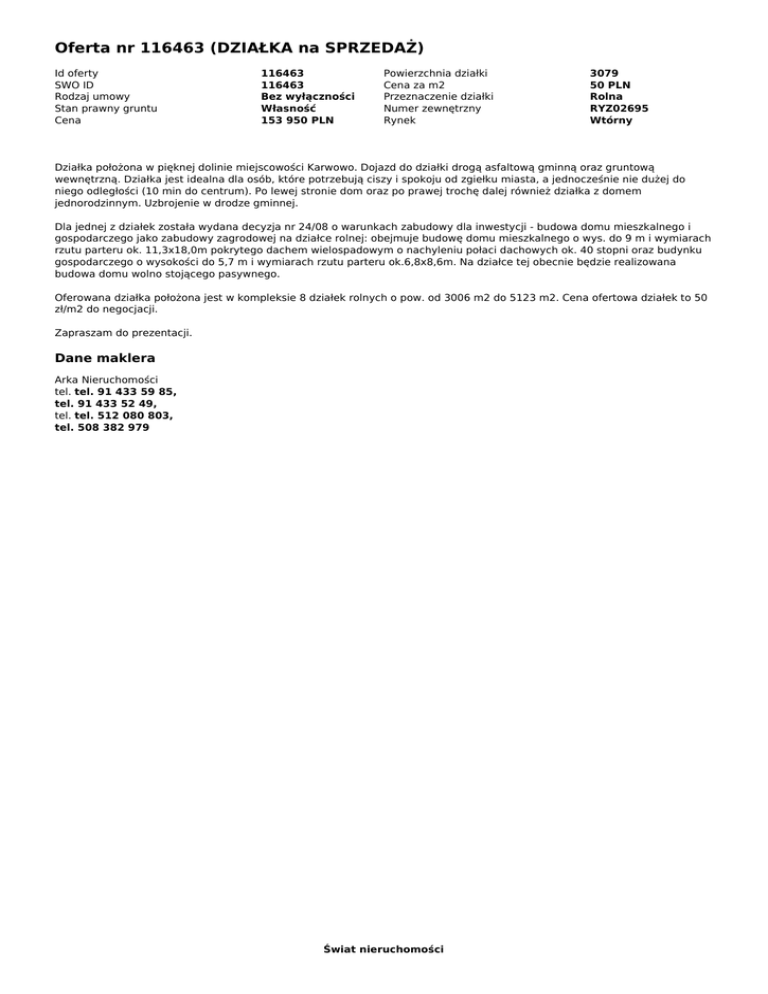 Oferta nr 116463 (DZIAŁKA na SPRZEDAŻ) Id oferty SWO ID Rodzaj umowy Stan prawny gruntu Cena 116463 116463 Bez wyłączności Własność 153 950 PLN Powierzchnia działki Cena za m2 Przeznaczenie działki Numer zewnętrzny Rynek 3079 50 PLN Rolna RYZ02695 Wtórny Działka położona w pięknej dolinie miejscowości Karwowo. Dojazd do działki drogą asfaltową gminną oraz gruntową wewnętrzną. Działka jest idealna dla osób, które potrzebują ciszy i spokoju od zgiełku miasta, a jednocześnie nie dużej do niego odległości (10 min do centrum). Po lewej stronie dom oraz po prawej trochę dalej również działka z domem jednorodzinnym. Uzbrojenie w drodze gminnej. Dla jednej z działek została wydana decyzja nr 24/08 o warunkach zabudowy dla inwestycji - budowa domu mieszkalnego i gospodarczego jako zabudowy zagrodowej na działce rolnej: obejmuje budowę domu mieszkalnego o wys. do 9 m i wymiarach rzutu parteru ok. 11,3x18,0m pokrytego dachem wielospadowym o nachyleniu połaci dachowych ok. 40 stopni oraz budynku gospodarczego o wysokości do 5,7 m i wymiarach rzutu parteru ok.6,8x8,6m. Na działce tej obecnie będzie realizowana budowa domu wolno stojącego pasywnego. Oferowana działka położona jest w kompleksie 8 działek rolnych o pow. od 3006 m2 do 5123 m2. Cena ofertowa działek to 50 zł/m2 do negocjacji. Zapraszam do prezentacji. Dane maklera Arka Nieruchomości tel. tel. 91 433 59 85, tel. 91 433 52 49, tel. tel. 512 080 803, tel. 508 382 979 Świat nieruchomości Powered by TCPDF (www.tcpdf.org)