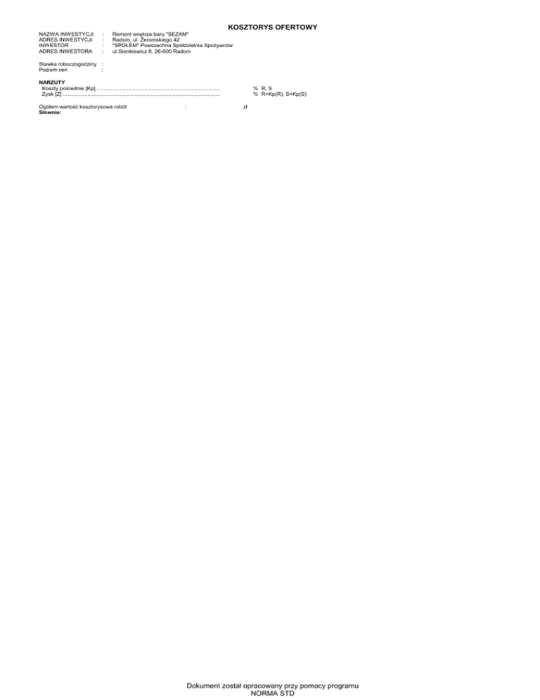 KOSZTORYS OFERTOWY Dokument został opracowany przy