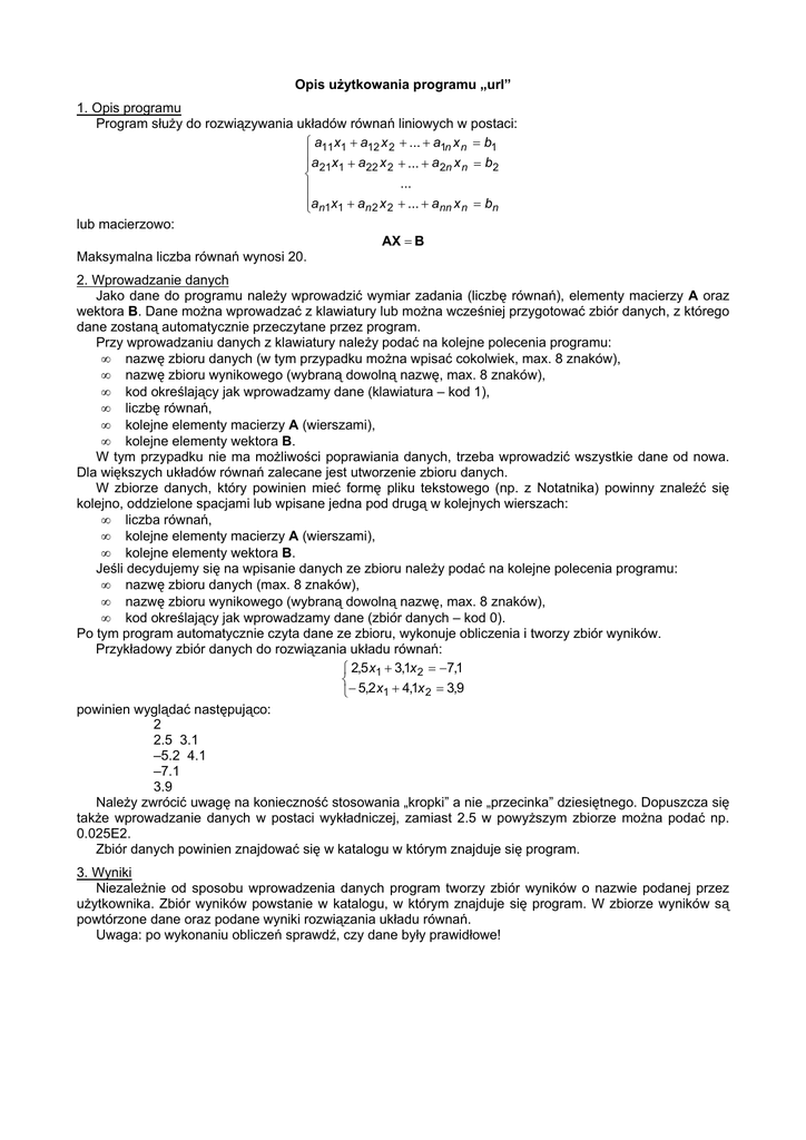 Opis użytkowania programu „url” 1. Opis programu Program służy do rozwiązywania układów równań liniowych w postaci: a11x1 + a12 x 2 + ... + a1n x n = b1 a21x1 + a22 x 2 + ... + a 2n x n = b2 ... an1x1 + an 2 x 2 + ... + ann x n = bn lub macierzowo: Maksymalna liczba równań wynosi 20. AX = B 2. Wprowadzanie danych Jako dane do programu należy wprowadzić wymiar zadania (liczbę równań), elementy macierzy A oraz wektora B. Dane można wprowadzać z klawiatury lub można wcześniej przygotować zbiór danych, z którego dane zostaną automatycznie przeczytane przez program. Przy wprowadzaniu danych z klawiatury należy podać na kolejne polecenia programu: • nazwę zbioru danych (w tym przypadku można wpisać cokolwiek, max. 8 znaków), • nazwę zbioru wynikowego (wybraną dowolną nazwę, max. 8 znaków), • kod określający jak wprowadzamy dane (klawiatura – kod 1), • liczbę równań, • kolejne elementy macierzy A (wierszami), • kolejne elementy wektora B. W tym przypadku nie ma możliwości poprawiania danych, trzeba wprowadzić wszystkie dane od nowa. Dla większych układów równań zalecane jest utworzenie zbioru danych. W zbiorze danych, który powinien mieć formę pliku tekstowego (np. z Notatnika) powinny znaleźć się kolejno, oddzielone spacjami lub wpisane jedna pod drugą w kolejnych wierszach: • liczba równań, • kolejne elementy macierzy A (wierszami), • kolejne elementy wektora B. Jeśli decydujemy się na wpisanie danych ze zbioru należy podać na kolejne polecenia programu: • nazwę zbioru danych (max. 8 znaków), • nazwę zbioru wynikowego (wybraną dowolną nazwę, max. 8 znaków), • kod określający jak wprowadzamy dane (zbiór danych – kod 0). Po tym program automatycznie czyta dane ze zbioru, wykonuje obliczenia i tworzy zbiór wyników. Przykładowy zbiór danych do rozwiązania układu równań: 2,5 x1 + 3,1x 2 = −7,1 − 5,2 x1 + 4,1x 2 = 3,9 powinien wyglądać następująco: 2 2.5 3.1 –5.2 4.1 –7.1 3.9 Należy zwrócić uwagę na konieczność stosowania „kropki” a nie „przecinka” dziesiętnego. Dopuszcza się także wprowadzanie danych w postaci wykładniczej, zamiast 2.5 w powyższym zbiorze można podać np. 0.025E2. Zbiór danych powinien znajdować się w katalogu w którym znajduje się program. 3. Wyniki Niezależnie od sposobu wprowadzenia danych program tworzy zbiór wyników o nazwie podanej przez użytkownika. Zbiór wyników powstanie w katalogu, w którym znajduje się program. W zbiorze wyników są powtórzone dane oraz podane wyniki rozwiązania układu równań. Uwaga: po wykonaniu obliczeń sprawdź, czy dane były prawidłowe!