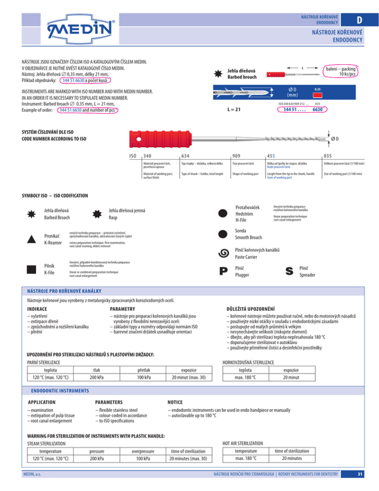 Nástroje kořenové Endodoncy D Nástroje kořenové Endodoncy NÁSTROJE JSOU OZNAČENY ČÍSLEM ISO A KATALOGOVÝM ČÍSLEM MEDIN. V OBJEDNÁVCE JE NUTNÉ UVÉST KATALOGOVÉ ČÍSLO MEDIN. Nástroj: Jehla dřeňová 0,35 mm, délky 21 mm, Příklad objednávky: 144 51 6630 a počet kusů L Jehla dřeňová Barbed broach balení – packing 10 ks/pcs ØD ( mm ) INSTRUMENTS ARE MARKED WITH ISO NUMBER AND WITH MEDIN NUMBER. IN AN ORDER IT IS NECESSARY TO STIPULATE MEDIN NUMBER. Instrument: Barbed broach 0,35 mm, L = 21 mm, Example of order: 144 51 6630 and number of pcs 0.35 ISO 340 634 909 212 ... 035 144 51 . . . . 6630 L = 21 SYSTÉM ČÍSLOVÁNÍ DLE ISO CODE NUMBER ACCORDING TO ISO ØD ISO 340 634 909 455 035 Materiál pracovní části, povrchová úprava Typ stopky – držátka, celková délka Tvar pracovní části Délka od špičky ke stopce, držátku Kužel pracovní části Velikost pracovní části (1/100 mm) Material of working part, surface finish Type of shank – holder, total length Shape of working part Lenght from the tip to the shank, handle Cone of working part Size of working part (1/100 mm) SYMBOLY ISO – ISO CODIFICATION Jehla dřeňová Barbed Broach Pronikač K-Reamer Pilník K-File Protahováček Hedström H-File Jehla dřeňová jemná Rasp lineární technika preparace rozšíření kořenového kanálku linear preparation technique root canal enlargement Sonda Smooth Broach rotační technika preparace – primární vyšetření, zprůchodňování kanálků, odstraňování starých výplní rotary preparation technique, first examination, root canal reaming, debris removal Plnič kořenových kanálků Paste Carrier lineární, případně kombinovaná technika preparace rozšíření kořenového kanálku Plnič Plugger linear or combined preparation technique root canal enlargement Plnič Spreader NÁSTROJE PRO KO Ř ENOVÉ KANÁLKY Nástroje kořenové jsou vyrobeny z metalurgicky zpracovaných korozivzdorných ocelí. INDIKACE – vyšetření – extirpace dřeně – zprůchodnění a rozšíření kanálku – plnění PARAMETRY – nástroje pro preparaci kořenových kanálků jsou vyrobeny z flexibilní nerezavějící oceli – základní typy a rozměry odpovídají normám ISO – barevné značení držátek usnadňuje orientaci UPOZORNĚNÍ PRO STERILIZACI NÁSTROJŮ S PLASTOVÝMI DRŽADLY: PARNÍ STERILIZACE teplota tlak přetlak 120 °C (max. 120 °C) 200 kPa 100 kPa expozice 20 minut (max. 30) DŮLEŽITÁ UPOZORNĚNÍ – kořenové nástroje můžete používat ručně, nebo do motorových násadců – používejte nízké otáčky v souladu s endodontickými zásadami – postupujte od malých průměrů k velkým – nevynechávejte velikosti (riskujete zlomení) – dbejte, aby při sterilizaci teplota nepřesahovala 180 °C – doporučujeme sterilizovat v autoklávu – používejte přiměřené čistící a desinfekční prostředky HORKOVZDUŠNÁ STERILIZACE teplota max. 180 °C expozice 20 minut ENDODONTIC INSTRUMENTS APPLICATION PARAMETERS NOTICE – examination – extirpation of pulp tissue – root canal enlargement – flexible stainless steel – colour-coded in accordance – to ISO specifications – endodontic instruments can be used in endo handpiece or manually – autoclavable up to 180 °C WARNING FOR STERILIZATION OF INSTRUMENTS WITH PLASTIC HANDLE: STEAM STERILIZATION temperature pressure overpressure time of sterilization 120 °C (max. 120 °C) 200 kPa 100 kPa 20 minutes (max. 30) MEDIN, a.s. HOT AIR STERILIZATION temperature max. 180 °C time of sterilization 20 minutes NÁSTROJE ROTAČNÍ PRO STOMATOLOGII | ROTARY INSTRUMENTS FOR DENTISTRY 31 D Nástroje kořenové Endodoncy Nástroje kořenové Endodoncy Nástroje NiTi Použití slitiny nikl-titan (NiTi) pro nástroje na kořenové kanálky umožnilo vytvoření nové generace těchto nástrojů. V porovnání s tradičními nástroji slitina NiTi násobně zvyšuje ohebnost kořenového nástroje, což umožňuje jemné sledováníkřivky kořenového nástroje v kanálku během všech fází pracovního postupu. Nástroje NiTi nevyžadují předchozí natvarování před zahájením práce. Vysoká ohebnost zabraňuje vzniku rýhování nebo jinýchodchylekpřirozenékřivkykanálku. Při použití K-Reamerů NiTi ve strojním provedení doporučujeme použití kolénkových endosystémů s ovládáním kroutícího momentu a otáčkami mezi 150–300 ot./min. Je důležité, aby se uživatel před použitím rotačních nástrojů z NiTi seznámil s „citem” pro nástroj pomocí cvičení na vytržených zubech nebo tréningových blocích z plastu. Ztráta citu při vysoké ohebnosti nástroje může vést ve spojitosti se strojovým pohybem, v krajním případě kezlomenínástroje. Nástroje H-File Hedström jsou určeny pouze pro lineární techniku preparace a nelze s nimi vkanálkurotovat. Preventivníopatřenípřipoužitínástrojů zNiTi: – přizaváděnínástrojedokanálkuvyvíjetpouzelehkýtlak – pokudcítíte „sevření”,zastavitpráciapoužítmenšívelikostnástroje – pracovatscitem,nikdynepůsobitnanástrojvkanálkusilou – pravidelněčistitprostorproodvodpilin,abysezabránilozablokovánínástroje NiTi Instruments The rotary endodonticinstrumentsshould be used preferablywith a slowhandpiece with thetorquecontrol.Theoptimaloperatingspeedis150–300rpm. Use onlylightpressure,andlubricateduringthewholeprocedure.Neveruseforce. Iftheinstrumentbinds,stoptheprocedure,reverseandremovetheinstrument. Stepdowntoasmallersize. Pull the instrument from the canal perodically to prevent the accumulation of filings and debris. Advantages of usage: – a new level of flexibility for root canal instruments – low resistance to bending significantly less transportation within the canal improved maintenance of canal curvature no preshaping before procedure – opening suited for the methods of canal shaping and cleaning. BALENÍ KOŘENOV