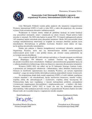 Warszawa, 30 marca 2016 r. Stanowisko Unii Metropolii Polskich w sprawie organizacji Wystawy International EXPO 2022 w Łodzi Unia Metropolii Polskich wyraża pełne poparcie dla inicjatywy zorganizowania Wystawy International EXPO w Łodzi w roku 2022, a także dla propozycji, aby tematem wystawy była rewitalizacja obszarów zurbanizowanych. Wydarzenie to wniesie istotny wkład do globalnej dyskusji na temat kondycji oraz przyszłości metropolii, miast i miasteczek na całym świecie. Ponad połowa ludzi mieszka w miastach. Do 2050 roku będzie to ponad 70%. W krajach najbogatszych jedynie 14% populacji będzie mieszkało poza obszarami miejskimi. Około 20% powierzchni miast wymaga natychmiastowej interwencji ze względu na znacząco obniżony poziom życia mieszkańców. Rewitalizacja to globalne wyzwanie. Rozkwit miast zależy od tego, na ile spełnią one potrzeby mieszkańców. Polska jest jednym z liderów kompleksowej rewitalizacji obszarów miejskich. Organizacja Wystawy może stać się ukoronowaniem działań rewitalizacyjnych realizowanych przez Łódź i inne polskie miasta, jak również szansą podzielenia się ze światem naszym dorobkiem. Przy wsparciu Rządu RP, Łódź realizuje największy w Europie program rewitalizacji miasta, obejmujący 100 hektarów w centrum. Zmienia się tkanka miejska, ale przede wszystkim życie mieszkańców. Edukacja i przeorientowanie gospodarki łączą się z ochroną dziedzictwa kulturowego, które ma kluczowe znaczenia dla poczucia tożsamości. Wystawa EXPO 2022 ma odbyć się na 25 hektarach Nowego Centrum Łodzi, w przestrzeni już istniejących zabudowań i infrastruktury, także obiektów historycznych. Oznacza to możliwość zapoznawania się z tematyką Wystawy „na żywym organizmie miejskim”, czego nie można byłoby doświadczyć podczas poprzednich wystaw światowych. Na niespotykaną dotąd skalę model organizacji EXPO w Łodzi zakłada współpracę z innymi miastami i ich mieszkańcami, łącząc możliwości biznesowe, transfer wiedzy, wspólną ofertą dla odwiedzających i wystawców, wspólną ofertę turystyczną itd. Wykorzystane będą sieci współpracy z innymi metropoliami polskimi, europejskimi i światowymi; organizacjami obywatelskimi i międzynarodowymi – z ludźmi i dla ludzi. Wystawa International EXPO 2022 w Łodzi ma stać się festiwalem aktywności obywatelskiej. Takie podejście pozwala wierzyć, że gospodarzem Wystawy będzie nie tylko Miasto Łódź, ale wszystkie krajowe i zagraniczne ośrodki miejskie. Rafał Dutkiewicz Prezydent Miasta Wrocławia Prezes Zarządu UMP Hanna Gronkiewicz-Waltz Prezydent m.st. Warszawy Przewodnicząca Rady UMP