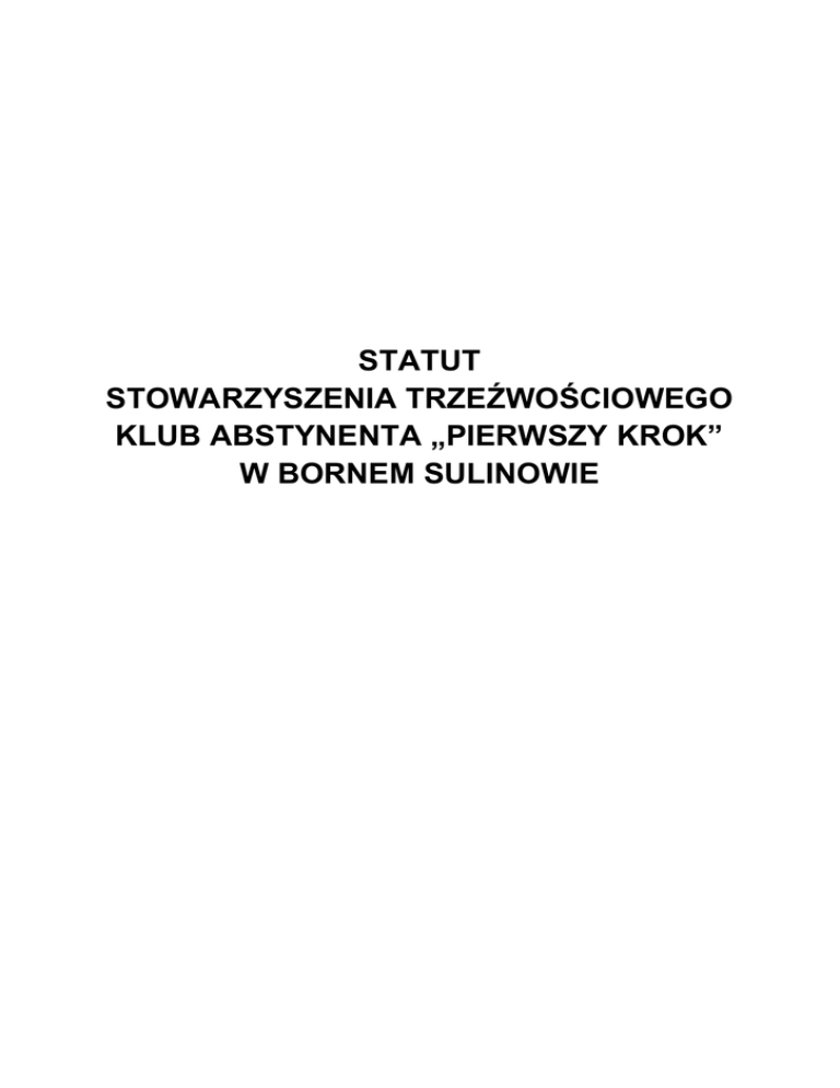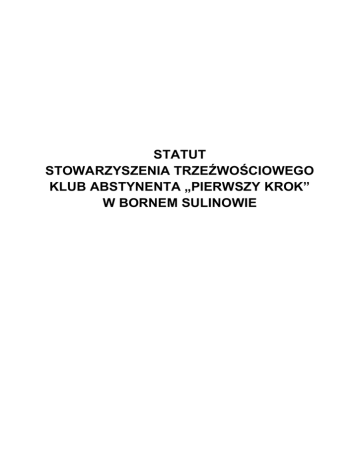 STATUT STOWARZYSZENIA TRZEŹWOŚCIOWEGO KLUB ABSTYNENTA „PIERWSZY KROK” W BORNEM SULINOWIE ROZDZIAŁ I POSTANOWIENIA OGÓLNE &1 Stowarzyszenie nosi nazwę : STOWARZYSZENIE TRZEŹWOŚCIOWE KLUB ABSTYNENTA „ PIERWSZY KROK” i w dalszych postanowieniach statutu zwane jest Stowarzyszeniem &2 Stowarzyszenie jest zrzeszeniem osób fizycznych, zawiązanym dla wspólnych celów. Terenem działania jest Rzeczypospolita Polska &3 Stowarzyszenie jest Stowarzyszeniem zarejestrowanym i posiada osobowość prawną od chwili wpisu do Krajowego Rejestru Sądowego &4 Dla realizacji celów statutowych Stowarzyszenie może działać na terenie innych państw z poszanowaniem tamtejszego prawa. &5 Stowarzyszenie jest zawiązane na czas nieograniczony. Posiada osobowość prawną. Działa na podstawie przepisów ustawy z dnia 7 kwietnia 1989 r. Prawo o Stowarzyszeniach (Dz.U.z 2001, Nr 79, poz. 855 z póź. zm.)oraz niniejszego statutu. &6 Stowarzyszenie może należeć do innych krajowych i międzynarodowych organizacji o podobnych celach. &7 Stowarzyszenie ma prawo używać oznak, znaków i pieczęci zgodnie z obowiązującymi w tym zakresie przepisami prawa. &8 Działalność Stowarzyszenia oparta jest przede wszystkim na pracy społecznej członków. Do prowadzenia spraw Stowarzyszenie może zatrudniać pracowników. &9 Upoważnia się Zarząd Stowarzyszenia do zawierania odpłatnych umów niezbędnych dla zabezpieczenia statutowych zadań Stowarzyszenia ROZDZIAŁ II CELE I ŚRODKI DZIAŁANIA &10 Celem Stowarzyszenia jest: 1. Propagowanie na zewnątrz trzeźwego stylu życia i zmiany obyczajów w kierunku osiągnięcia pełnej abstynencji 2. Pełnienie roli środowiska alternatywnego dla osób uzależnionych od alkoholu i innych substancji uzależniających, dającego poczucie bezpieczeństwa oraz zwiększającego możliwości realizacji różnych potrzeb życiowych. 3. Pobudzanie osób biernych do aktywności społecznej i zawodowej 4. Integracja społeczności lokalnej w celu poprawy i zmiany jakości życia &11 Stowarzyszenie swe cele realizuje poprzez: a) współpracę z: - Poradniami i Ośrodkami Lecznictwa Otwartego - Instytucjami i Organizacjami powołanymi do działań profilaktyki przeciwalkoholowej oraz rozwiązywania problemów wynikających z uzależnień/ m.in. z placówkami oświatowymi, z ośrodkami pomocy społecznej, samorządem gminnym itp./ b) działalność kulturalno-rozrywkowa: prelekcje, odczyty, zabawy, konkursy, zajęcia klubowo-świetlicowe c) organizowanie obozów terapeutycznych, rajdów, wycieczek i innych imprez rekreacyjno-sportowych o charakterze abstynenckim d) organizowanie i prowadzenie grup terapeutycznych, samopomocowych, grup wsparcia i integracji, jako przedłużenie ogólnie przyjętego leczenia odwykowego dla osób uzależnionych od alkoholu i innych substancji psychoaktywnych oraz dla rodzin, e) działalność informacyjno-propagandową na rzecz trzeźwego stylu życia, prowadzenie punktów informacyjno-kontaktowych, telefonu zaufania itp. ROZDZIAŁ III CZŁONKOWIE-PRAWA I OBOWIĄZKI &12 1. Członkiem Stowarzyszenia może być każda osoba deklarująca trzeźwy styl życia, podporządkowująca się postanowieniom niniejszego statutu i uchwałom władz Stowarzyszenia 2. Stowarzyszenie posiada członków: a) zwyczajnych b) wspierających c) honorowych Członkiem Zwyczajnym Stowarzyszenia może być każda osoba fizyczna, która: a) złoży deklarację członkowską na piśmie b) zostanie formalnie przyjęta przez Zarząd Stowarzyszenia 3. Członkiem zwyczajnym staje się po złożeniu pisemnej deklaracji na podstawie uchwały Zarządu Stowarzyszenia 4. Członkiem wspierającym Stowarzyszenie może zostać osoba fizyczna i prawna deklarująca pomoc finansową, rzeczową lub merytoryczną w realizacji celów Stowarzyszenia 5. Członkiem wspierającym staje się po złożeniu pisemnej deklaracji na podstawie uchwały Zarządu 6. Członkiem honorowym Stowarzyszenia może być osoba fizyczna, która wniosła wybitny wkład w działalność i rozwój Stowarzyszenia 7. Członkowie honorowi są przyjmowani przez Walne Zebranie na wniosek 10 członków Stowarzyszenia. 8. Członkowie zwyczajni mają prawo: a) biernego i czynnego uczestnictwa w wyborach do władz Stowarzyszenia b) korzystania z dorobku, majątku i wszelkich form działalności Stowarzyszenia c) udziału w zebraniach, wykładach oraz imprez organizowanych przez Stowarzyszenie, zgłaszania wniosków co do działalności Stowarzyszenia 9. Członkowie zwyczajni mają obowiązek: a) brania udziału w działalności Stowarzyszenia i realizacji jego celów b) chronić przedmioty stanowiące własność Stowarzyszenia jako własność społeczną i wspólne dobro c) przestrzegania statutu i uchwał władz Stowarzyszenia d) regularnego opłacania składek 10. Członkowie wspierający i honorowi nie posiadają biernego oraz czynnego prawa wyborczego, mogą jednak brać udział z głosem doradczym w statutowych władzach Stowarzyszenia, poza tym posiadają takie prawa jak członkowie zwyczajni. 11. Członek wspierający ma obowiązek wywiązywania się z zadeklarowanych świadczeń, przestrzegania statutu oraz uchwał władz Stowarzyszenia 12. Członkowie honorowi są zwolnieni ze składek członkowskich 13. Utrata członkostwa następuje na skutek: a) Pisemnej rezygnacji złożonej na ręce Zarządu b) Wykluczenia przez Zarząd: - z powodu łamania statutu i nieprzestrzegania uchwał władz Stowarzyszenia - z powodu notorycznego nie brania udziału w pracach Stowarzyszenia - z powodu nie płacenia składek za okres pól roku Na pisemny wniosek trzech członków Stowarzyszenia c) Utraty praw obywatelskich na mocy prawomocnego wyroku sądu d) Śmierci członka oraz utraty osobowości prawnej przez osoby prawne 14. Od uchwały Zarządu w sprawie przyjęcia w poczet członków Stowarzyszenia lub pozbawienia członkostwa zainteresowanemu przysługuje odwołanie do Walnego Zgromadzenia Członków. Uchwała walnego zgro