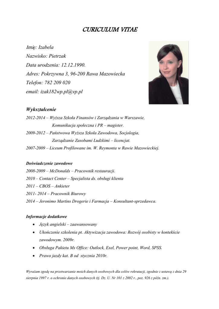 CURICULUM VITAE Imię: Izabela Nazwisko: Pietrzak Data urodzenia: 12.12.1990. Adres: Pokrzywna 3, 96-200 Rawa Mazowiecka Telefon: 782 209 020 email: [email protected] Wykształcenie 2012-2014 – Wyższa Szkoła Finansów i Zarządzania w Warszawie, Komunikacja społeczna i PR – magister. 2009-2012 – Państwowa Wyższa Szkoła Zawodowa, Socjologia, Zarządzanie Zasobami Ludzkimi – licencjat. 2007-2009 – Liceum Profilowane im. W. Reymonta w Rawie Mazowieckiej. Doświadczenie zawodowe 2008-2009 – McDonalds – Pracownik restauracji. 2010 – Contact Center – Specjalista ds. obsługi klienta 2011 – CBOS – Ankieter 2011- 2014 – Pracownik Biurowy 2014 – Jeronimo Martins Drogerie i Farmacja – Konsultant-sprzedawca. Informacje dodatkowe Język angielski – zaawansowany Ukończenie szkolenia pt. Aktywizacja zawodowa: Rozwój osobisty w kontekście zawodowym. 2009r. Obsługa Pakietu Ms Office: Outlock, Exel, Power point, Word, SPSS. Prawo jazdy kat. B od stycznia 2010r. Wyrażam zgodę na przetwarzanie moich danych osobowych dla celów rekrutacji, zgodnie z ustawą z dnia 29 sierpnia 1997 r. o ochronie danych osobowych (tj. Dz. U. Nr 101 z 2002 r., poz. 926 z późn. zm.).