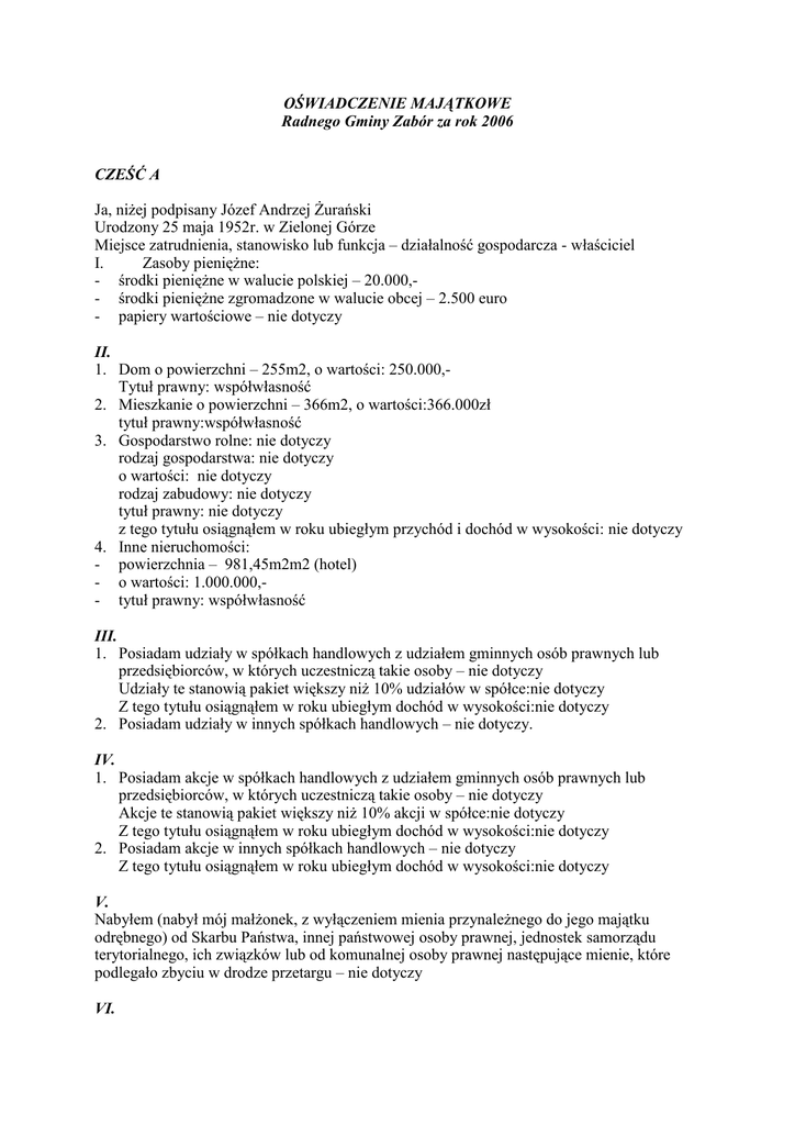 OŚWIADCZENIE MAJĄTKOWE Radnego Gminy Zabór za rok 2006 CZEŚĆ A Ja, niŜej podpisany Józef Andrzej śurański Urodzony 25 maja 1952r. w Zielonej Górze Miejsce zatrudnienia, stanowisko lub funkcja – działalność gospodarcza - właściciel I. Zasoby pienięŜne: - środki pienięŜne w walucie polskiej – 20.000,- środki pienięŜne zgromadzone w walucie obcej – 2.500 euro - papiery wartościowe – nie dotyczy II. 1. Dom o powierzchni – 255m2, o wartości: 250.000,Tytuł prawny: współwłasność 2. Mieszkanie o powierzchni – 366m2, o wartości:366.000zł tytuł prawny:współwłasność 3. Gospodarstwo rolne: nie dotyczy rodzaj gospodarstwa: nie dotyczy o wartości: nie dotyczy rodzaj zabudowy: nie dotyczy tytuł prawny: nie dotyczy z tego tytułu osiągnąłem w roku ubiegłym przychód i dochód w wysokości: nie dotyczy 4. Inne nieruchomości: - powierzchnia – 981,45m2m2 (hotel) - o wartości: 1.000.000,- tytuł prawny: współwłasność III. 1. Posiadam udziały w spółkach handlowych z udziałem gminnych osób prawnych lub przedsiębiorców, w których uczestniczą takie osoby – nie dotyczy Udziały te stanowią pakiet większy niŜ 10% udziałów w spółce:nie dotyczy Z tego tytułu osiągnąłem w roku ubiegłym dochód w wysokości:nie dotyczy 2. Posiadam udziały w innych spółkach handlowych – nie dotyczy. IV. 1. Posiadam akcje w spółkach handlowych z udziałem gminnych osób prawnych lub przedsiębiorców, w których uczestniczą takie osoby – nie dotyczy Akcje te stanowią pakiet większy niŜ 10% akcji w spółce:nie dotyczy Z tego tytułu osiągnąłem w roku ubiegłym dochód w wysokości:nie dotyczy 2. Posiadam akcje w innych spółkach handlowych – nie dotyczy Z tego tytułu osiągnąłem w roku ubiegłym dochód w wysokości:nie dotyczy V. Nabyłem (nabył mój małŜonek, z wyłączeniem mienia przynaleŜnego do jego majątku odrębnego) od Skarbu Państwa, innej państwowej osoby prawnej, jednostek samorządu terytorialnego, ich związków lub od komunalnej osoby prawnej następujące mienie, które podlegało zbyciu w drodze przetargu – nie dotyczy VI. 1. Prowadzę działalność gospodarczą - osobiście – PPHU Jozbud śurański Józef, handlowo-gastronomiczno-hotelarskie - wspólnie z innymi osobami – nie dotyczy Z tego tytułu osiągnąłem w roku ubiegłym przychód i dochód w wysokości:340.104,73zł/109.375zł 2. Zarządzam działalnością gospodarczą lub jestem przedstawicielem pełnomocnikiem takiej działalności – nie dotyczy - osobiście:nie dotyczy - wspólnie z innymi osobami: nie dotyczy Z tego tytułu osiągnąłem w roku ubiegłym dochód w wysokości:nie dotyczy VII. W spółkach handlowych – nie dotyczy - jestem członkiem zarządu-nie dotyczy - jestem członkiem rady nadzorczej-nie dotyczy - jestem członkiem komisji rewizyjnej-nie dotyczy Z tego tytułu osiągnąłem w roku ubiegłym dochód w wysokości-nie dotyczy VIII. Inne dochody osiągane z tytułu zatrudnienia lub innej działalności zarobkowej lub zajęć, z podaniem kwot uzyskanych z kaŜdego tytułu - dieta radnego 112,50zł, inne źródła 891,19zł IX. Składniki mienia ruchomego o wartości powyŜej 10.000,- - Seat Cordoba 2005 rok X. Zobowiązania pienięŜne o wartości powyŜej 10.000,-, w tym zaciągnięte kredyty i poŜyczki oraz warunki, na jakich zostały udzielone – nie dotyczy Zabór, dnia 25.04.2007r. Podpis