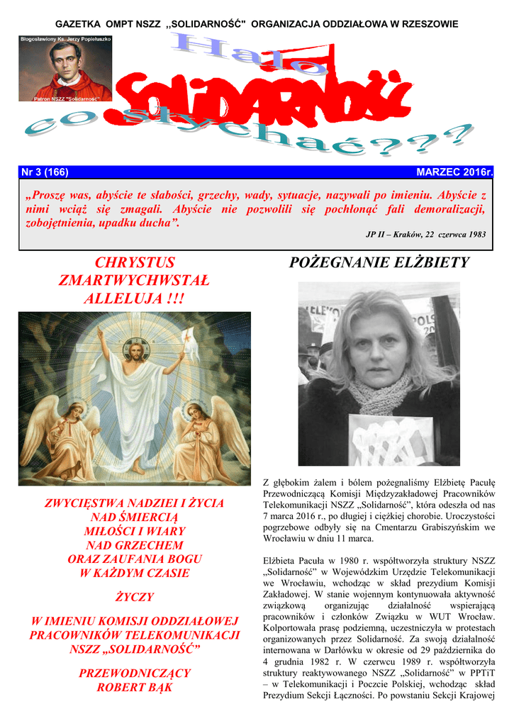 GAZETKA OMPT NSZZ ,,SOLIDARNOŚĆ" ORGANIZACJA ODDZIAŁOWA W RZESZOWIE Nr 3 (166) MARZEC 2016r. „Proszę was, abyście te słabości, grzechy, wady, sytuacje, nazywali po imieniu. Abyście z nimi wciąż się zmagali. Abyście nie pozwolili się pochłonąć fali demoralizacji, zobojętnienia, upadku ducha”. JP II – Kraków, 22 czerwca 1983 CHRYSTUS ZMARTWYCHWSTAŁ ALLELUJA !!! ZWYCIĘSTWA NADZIEI I ŻYCIA NAD ŚMIERCIĄ MIŁOŚCI I WIARY NAD GRZECHEM ORAZ ZAUFANIA BOGU W KAŻDYM CZASIE ŻYCZY W IMIENIU KOMISJI ODDZIAŁOWEJ PRACOWNIKÓW TELEKOMUNIKACJI NSZZ „SOLIDARNOŚĆ” PRZEWODNICZĄCY ROBERT BĄK POŻEGNANIE ELŻBIETY Z głębokim żalem i bólem pożegnaliśmy Elżbietę Pacułę Przewodniczącą Komisji Międzyzakładowej Pracowników Telekomunikacji NSZZ „Solidarność”, która odeszła od nas 7 marca 2016 r., po długiej i ciężkiej chorobie. Uroczystości pogrzebowe odbyły się na Cmentarzu Grabiszyńskim we Wrocławiu w dniu 11 marca. Elżbieta Pacuła w 1980 r. współtworzyła struktury NSZZ „Solidarność” w Wojewódzkim Urzędzie Telekomunikacji we Wrocławiu, wchodząc w skład prezydium Komisji Zakładowej. W stanie wojennym kontynuowała aktywność związkową organizując działalność wspierającą pracowników i członków Związku w WUT Wrocław. Kolportowała prasę podziemną, uczestniczyła w protestach organizowanych przez Solidarność. Za swoją działalność internowana w Darłówku w okresie od 29 października do 4 grudnia 1982 r. W czerwcu 1989 r. współtworzyła struktury reaktywowanego NSZZ „Solidarność” w PPTiT – w Telekomunikacji i Poczcie Polskiej, wchodząc skład Prezydium Sekcji Łączności. Po powstaniu Sekcji Krajowej Pracowników Telekomunikacji w 1991 r. przewodnicząca do chwili obecnej. W latach 1998-2002 przewodniczyła Krajowemu Sekretariatowi Łączności, będą jednocześnie członkiem Komisji Krajowej NSZZ „Solidarność”, a w kolejnych latach delegatem na Zjazd Krajowy. Aktywnie kierowała Związkiem w okresie przemian własnościowych w Telekomunikacji Polskiej, doprowadzając m.in. do znacznego wzrostu wynagrodzeń w latach 1993 - 2000, zawarcia w 1998 r Ponadzakładowego Układu Zbiorowego Pracy i podpisania Pakietu Socjalnego w 2000 r. oraz utworzenia Pracowniczego Programu Emerytalnego w Telekomunikacji Polskiej w 2001r. i Orange Customer Service w 2011r. Współpracowała z międzynarodowymi i zagranicznymi organizacjami związkowymi w ramach UNI (PTTI) oraz w kontaktach bezpośrednich ze związkami m.in. we Francji, Niemczech, Danii, Norwegii. Była członkiem Europejskiej i Światowej Rady Zakładowej Grupy Orange Francja. W kolejnych trudnych latach związanych z reorganizacja i restrukturyzacją przedsiębiorstwa, prowadziła na czele Sekcji Krajowej i utworzonej w 2004 r. Organizacji Międzyzakładowej Pracowników Telekomunikacji, trudny dialog z pracodawcą. W tym czasie Związek prowadził liczne akcje protestacyjne, których kulminacją był protest głodowy w 2005r. Efektem dialogu prowadzonego z pracodawcą są m.in. zawarte umowy społeczne oraz układy zbiorowe pracy w spółkach Grupy Orange Polska. Od momentu reaktywowania w 1989r. NSZZ „Solidarność” organizowała Pielgrzymki Pracowników Telekomunikacji na Jasną Górę. Pozostanie na zawsze w naszej pamięci. W imieniu Komisji Oddziałowej w Rzeszowie w uroczystości pogrzebowej uczestniczyli: Robert Bąk, Marek Bryś, Andrzej Kędzierski. WYBORY ZWIĄZKOWE W związku ze śmiercią dotychczasowej Przewodniczącej Elżbiety Pacuły, ustalono, że wybory związkowe odbędą się w dniach 14 kwietnia (Komisja Międzyzakładowa) i 15 kwietnia br. (Krajowa Sekcja Pracowników Telekomunikacji). WYBORY SIP W OPL I OCS W dniu 3 marca organizacje związkowe zawarły porozumienie ws. przeprowadzenia wyborów społecznych inspektorów pracy (SIP) w Orange Polska (OPL) i Orange Customer Service (OCS) na kadencję 2016 - 2020. Przyjęto regulamin wyborów i powołano Główną Komisję Wyborczą SIP. Szczegóły będziemy podawać na stronie internetowej www.skpt.pl/ko. Redagują: Sekretariat związku: Adres do korespondencji: Internet: ZMIANY W ELTEL NETWORKS Ponieważ Eltel Networks zakończył współpracę z Orange Polska na strefach Kraków Północ i Południe aktualnie rozstrzyga się kto przejmie teren. Aażne jest zabezpieczenie pracowników w zakresie warunków zatrudnienia u nowego pracodawcy. Trwają też starania o organizację spotkania przedstawicieli związku z Eltel Networks ws. wspomnianych zmian, zwolnień i podsumowania podwyżek. Spotkanie ma szansę odbyć się pod koniec marca lub początkiem kwietnia. SZKOLENIE W dniach 3 - 4 marca 2016r. odbyło się w Rzeszowie szkolenie komputerowe z zakresu obsługi strony internetowej. Z naszej organizacji oddziałowej uczestniczył Robert Bąk. PIELGRZYMKA NA JASNĄ GÓRĘ W związku z planowaną Pielgrzymką Pracowników Telekomunikacji na Jasną Górę informujemy, że odbędzie się roku bieżącym w dniu 21 maja. Szczegóły będą podane w późniejszym terminie na stronie internetowej naszej organizacji związkowej www.skpt.pl/ko. INFORMACJE REGIONALNE „SOLIDARNOŚĆ” - WARTO BYĆ RAZEM „Solidarność” z jarosławskiego Leara przygotowuje się razem z Komisją Krajowa i Zarządem Regionu Ziemia Przemyska do wybudowania domu dla koleżanki, która żyje z córką w opłakanych warunkach. Budowa ruszy na wiosnę. Najpierw jednak związkowcy zorganizowali pomoc doraźną. Kobiecie nie wystarczało pieniędzy na zaspokojenie podstawowych potrzeb. Ze składek związkowych zakupiono podstawowe artykuły, wyposażenie, m.in. piecyk do ogrzania. Więcej na www.skpt.pl/ko. Na przerwie Jaś podchodzi do nauczyciela: - Ja nie chcę pana straszyć, ale mój tata powiedział, że jeśli dalej będę przynosił uwagi w dzienniczku, to ktoś dostanie w skórę! <> <> <> Dlaczego pan nie ratował swojej żony, gdy tonęła? A skąd miałem wiedzieć, że się topi? Wrzeszcz