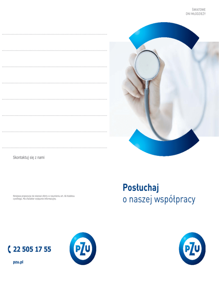 ŚWIATOWE DNI MŁODZIEŻY .......................................................................................... .......................................................................................... .......................................................................................... .......................................................................................... .......................................................................................... .......................................................................................... .......................................................................................... .......................................................................................... Skontaktuj się z nami Niniejsza propozycja nie stanowi oferty w rozumieniu art. 66 Kodeksu cywilnego. Ma charakter wyłącznie informacyjny. 22 505 17 55 pzu.pl Posłuchaj o naszej współpracy Przyjąłeś pacjenta do placówki medycznej? Zgłoś to niezwłocznie do Centrum Alarmowego PZU. Pamiętaj: ubezpieczamy każdego zarejestrowanego uczestnika ŚDM 2016, czyli każdą osobę, która posiada identyfikator pielgrzyma. Zadzwoń pod numer 22 505 17 55 i podaj najważniejsze informacje: • dane ubezpieczonego: imię, nazwisko, nr identyfikatora pielgrzyma, PESEL (a w przypadku cudzoziemca – datę urodzenia), • datę i powód przyjęcia do placówki medycznej, • planowane procedury medyczne i rodzaj potrzebnej pomocy, • telefon kontaktowy do lekarza prowadzącego lub na oddział. Kiedy pokrywamy koszty? Pokrywamy koszty, jeśli leczenie było prowadzone w związku z: • nieszczęśliwym wypadkiem lub nagłym zachorowaniem, • zaostrzeniem choroby przewlekłej lub choroby będącej przyczyną hospitalizacji w ciągu 12 miesięcy przed przystąpieniem do ubezpieczenia, • zabiegiem w ramach chirurgii jednego dnia przeprowadzonym w ciągu 30 dni przed przystąpieniem do ubezpieczenia i zdarzenie wystąpiło w okresie ubezpieczenia. Transportu medycznego: • do odpowiedniej placówki medycznej i między kolejnymi placówkami medycznymi, • do miejsca zakwaterowania ubezpieczonego, jeśli takie są zalecenia lekarza, • związanego z ciążą i porodem, maksymalnie do zakończenia 32. tygodnia ciąży. Pamiętaj, że nie ponosimy odpowiedzialności finansowej za leczenie m.in. w następujących wypadkach: • po przywróceniu do stanu zdrowia, w którym pacjent może wrócić do domu lub innej placówki medycznej, • jeśli pacjent kierował pojazdem silnikowym bez uprawnień, w stanie nietrzeźwości lub pod wpływem środków odurzających i substancji psychotropowych, • zaburzeń psychicznych i zaburzeń zachowania, w tym nerwic, • chorób przenoszonych drogą płciową, AIDS i HIV, • chorób wynikających z alkoholizmu, • badań zbędnych do rozpoznania lub leczenia choroby i szczepień profilaktycznych, • po udziale w przestępstwach albo bójkach, z wyjątkiem działania w obronie koniecznej, • ponadstandardowej dodatkowej opieki medycznej, • po wypadkach wynikających z uprawiania sportów wysokiego ryzyka. Jak się z nami rozliczyć? Jakie koszty pokrywamy? Hospitalizacji i leczenia: • wizyt lekarskich, pobytu i leczenia w szpitalu, • zabiegów ambulatoryjnych i operacji przeprowadzanych ze wskazań nagłych, • koszty zakupu lekarstw i środków opatrunkowych przepisanych przez lekarza, • badań pomocniczych zleconych przez lekarza (RTG, EKG, USG, rezonansu magnetycznego, tomografii komputerowej, badań laboratoryjnych), • leczenia stomatologicznego w przypadku nagłych ostrych stanów zapalnych. 22 505 17 55 Po wykonaniu usługi jako placówka medyczna, wystaw fakturę na Mondial Assistance. Musi ona zawierać dane wynikające z rozporządzenia Ministra Finansów (Dz.U 2013, poz.1485) dotyczącego m.in. wystawiania faktur oraz: • numer sprawy nadany przez Centrum Alarmowe PZU, • imię i nazwisko osoby ubezpieczonej, • diagnozę oraz specyfikację usług wraz z datami ich wykonania. Fakturę prześlij na adres: Mondial Assistance Sp. z o.o., ul. Domaniewska 50 b, 02-672 Warszawa NIP: 526-23-22-380 pzu.pl