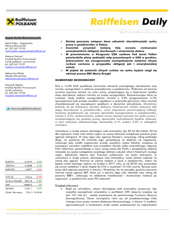 BIULETYN DZIENNY, 2016-11-18 09:07 Zespół Analiz Ekonomicznych: Marta Petka - Zagajewska. Główny Ekonomista tel. (22) 347 75 95 [email protected] Mateusz Namysł Analityk Rynków Finansowych (rynek giełdowy i surowcowy) tel. (22) 347 75 97 [email protected] Aleksandra Pikała Młodszy Ekonomista [email protected] Wojciech Stępień Analityk Rynków Finansowych (rynek walutowy) tel. (22) 347 75 96 [email protected] Dzisiaj poznamy wstępne dane odnośnie charakterystyki rynku pracy w październiku w Polsce. Czwartek przyniósł kolejną falę wzrostu rentowności amerykańskich obligacji skarbowych i umocnienia dolara W przemówieniu w Kongresie USA szefowa Fed Janet Yellen potwierdziła plany podwyżki stóp procentowych w USA w grudniu, jednocześnie nie zasugerowała zaniepokojenia ostatnim silnym ruchem zarówno w przypadku obligacji jak i amerykańskiej waluty W piątek do ostatnich silnych ruchów na rynku będzie mógł się odnieść prezes EBC Mario Draghi KOMENTARZ EKONOMICZNY Dziś o 14.00 GUS opublikuje komunikat odnośnie przeciętnego zatrudnienia oraz wzrostu wynagrodzeń w sektorze przesiębiorstw w październiku. Widoczna od stycznia wyraźna poprawa sytuacji na rynku pracy, przejawiąjąca się w stopniowym spadku stopy bezrobocia wpływa również na presję wynagrodzeń. Rozczarowujące dane za wrzesień, kiedy średnie wynagrodzenie wzrosło o 3.9% (prognozowano 4,7%) spowodowane było przede wszystkim spadkami w przemyśle górniczym, który również charakteryzował się największymi spadkami w dynamice zatrudnienia. Uważamy jednak, że po kolejnym, bardzo dobrym, historycznie niskim odczycie dla stopy bezrobocia w październiku oraz stopniowo powracającej inflacji, możemy spodziewać się wzrostu dynamiki wynagrodzeń w październiku, nawet o 4.4%. Jednocześnie, wobec coraz lepszej sytuacji na rynku pracy i zmniejszającej się podaży pracy, dynamika zatrudnienia będzie słabnąć, w tym miesiący odnotwywując dynamikę 3.1% wobec 3.2% w ubiegłym miesiącu. Uchwalona w środę ustawa obniżająca wiek emerytalny (do 60 lat dla kobiet, 65 lat dla mężczyzn) może mieć istotny wpływ na ocenę zdolności kredytowej państwa przez agencje ratingowe. W maju tego roku agencja Moody’s, utrzymując rating polskiego długu na poziomie A2 zmieniła jego perspektywę ze stabilnej na negatywną, wskazując jako źródło niepewności przede wszystkim ryzyka fiskalne, związane ze znaczącym wzrostem wydatków oraz projektem obniżki wieku emerytalnego. Agencja Fitch natomiast, potwierdzając w lipcu swoją ocenę dla Polski z perspektywą stabilną wskazała na ryzyka wystąpienia wysokiego deficytu wskutek reform fiskalnych nowego rządu. Jakkolwiek obecny stan finansów publicznych nie budzi zastrzeżeń, to uchwalona w środę ustawa, obniżająca wiek emerytalny, może istotnie wpłynąć na ocenę obu agencji. Pomimo że ustawa wejdzie w życie w październiku, zatem nie będzie miała istotnego wpływu na budżet w 2017 roku, to od 2018 roku przewiduje się wzrost wydatków z tytułu dopłat do FUS w wysokości 10 mld rocznie. Rewizje ocen przez obie agencje poznamy w styczniu. Wcześniej, bo na początku grudnia poznamy również ocenę agencji S&P, która już w styczniu tego roku obniżyła nasz rating do poziomu BBB+, wskazując na osłabienie niezalezności i skuteczności instytucji po wygranych w październiku przez PiS wyborach. Przegląd informacji: Rząd po uchwaleniu ustawy obniżającej wiek emerytalny proponuje, aby wszystkie oszczędności emerytalne w portfelach OFE (obecnie znajduje się tam 147 mld zł.), zostały przekazane do państwowego Funduszu Rezerwy Demograficznej. Nowe rozwiązanie różni się od przedstawionego kilka miesięcy temu przez ministra Mateusza Morawieckiego, w którym ¾ środków zgromadzonych w funduszach miało zostać przekazanych na indywidualne Klauzula ograniczenia odpowiedzialności znajduje się na ostatniej stronie. 1 BIULETYN DZIENNY, 18 listopada 2016, GODZ 9.10 konta emerytalne, a jedynie ¼ miała trafić do Funduszu Rezerwy Demograficznej. KOMENTARZ RYNKOWY Czwartek na rynkach przyniósł kolejną przecenę amerykańskich obligacji skarbowych. Rentowność 10-letnich papierów wzrosła powyżej 2,33 % i jest najwyżej od ponad roku. Rosły również rentowności polskich obligacji w przypadku 10-letniego papieru przekroczyła ona 3,65 %. Umocnienie kontynuował również dolar. Kurs EUR/USD spadł poniżej 1,06 po raz pierwszy od listopada ubiegłego roku. Spadek EUR/USD przełożył się na osłabienie złotego do dolara (kurs USD/PLN zbliżył się do 4,19) polska waluta umocniła się natomiast nieznacznie w relacji do euro. Kurs EUR/USD kształtuje się w rejonie 4,45. Impulsu do kolejnej fali wzrostu rentowności obligacji oraz umocnienia dolara dostarczyła przewodnicząca Fed Janet Yellen. Szefowa Fed, która w czwartek przemawiała w Kongresie USA. W swoim pierwszym wystąpieniu publicznym od czasu amerykańskich wyborów prezydenckich, stwierdziła, że kondycja amerykańskiej gospodarki uzasadnia podwyżkę stop procentowych w USA i powinna ona mieć miejsce „relatywnie szybko”. Biorąc pod uwagę oczekiwania rynku, który już przed wystąpieniem Yellen wyceniał prawdopodobieństwo podwyżki w grudniu na ponad 90 proc., występnie szefowej Fed potwierdziło tym samym scenariusz zakładający podwyżkę stóp procentowych w USA przed końcem roku. Yellen w tekście wystąpieniu nie nawiązała jednocześnie bezpośrednio do wyników wyborów oraz zmian z jakimi wiązałoby się wprowadzenie przez D. Trumpa zapowiadanej w kampanii wyborczej stymulacji fiskalnej. Szefowa Fed nie odniosła się również do ostatniego dużego wzrostu rentowności amerykańskich obligacji oraz umocnienia dolara. Może to sugerować, że Fed nie dostrzega w tym ruchu nic niepokojącego dla koniunktury w gospodarce USA. Takie nastawienie sugeruje również, że Fed może dostrzegać potencjał do zarówno