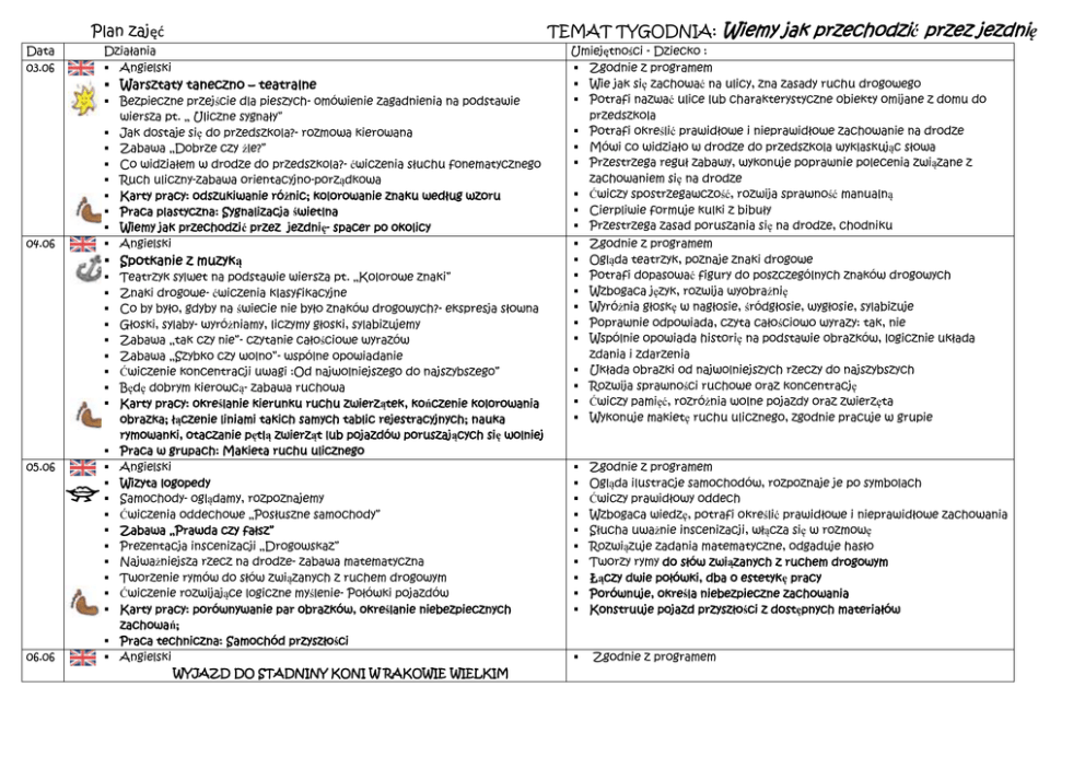 Plan zajęć Data 03.06 Działania  Angielski  Warsztaty taneczno – teatralne 04.06  Bezpieczne przejście dla pieszych- omówienie zagadnienia na podstawie wiersza pt. „ Uliczne sygnały”  Jak dostaje się do przedszkola?- rozmowa kierowana  Zabawa „Dobrze czy źle?”  Co widziałem w drodze do przedszkola?- ćwiczenia słuchu fonematycznego  Ruch uliczny-zabawa orientacyjno-porządkowa  Karty pracy: odszukiwanie różnic; kolorowanie znaku według wzoru  Praca plastyczna: Sygnalizacja świetlna  Wiemy jak przechodzić przez jezdnię- spacer po okolicy  Angielski  Spotkanie z muzyką          05.06 06.06              Teatrzyk sylwet na podstawie wiersza pt. „Kolorowe znaki” Znaki drogowe- ćwiczenia klasyfikacyjne Co by było, gdyby na świecie nie było znaków drogowych?- ekspresja słowna Głoski, sylaby- wyróżniamy, liczymy głoski, sylabizujemy Zabawa „tak czy nie”- czytanie całościowe wyrazów Zabawa „Szybko czy wolno”- wspólne opowiadanie Ćwiczenie koncentracji uwagi :Od najwolniejszego do najszybszego” Będę dobrym kierowcą- zabawa ruchowa Karty pracy: określanie kierunku ruchu zwierzątek, kończenie kolorowania obrazka; łączenie liniami takich samych tablic rejestracyjnych; nauka rymowanki, otaczanie pętlą zwierząt lub pojazdów poruszających się wolniej Praca w grupach: Makieta ruchu ulicznego Angielski Wizyta logopedy Samochody- oglądamy, rozpoznajemy Ćwiczenia oddechowe „Posłuszne samochody” Zabawa „Prawda czy fałsz” Prezentacja inscenizacji „Drogowskaz” Najważniejsza rzecz na drodze- zabawa matematyczna Tworzenie rymów do słów związanych z ruchem drogowym Ćwiczenie rozwijające logiczne myślenie- Połówki pojazdów Karty pracy: porównywanie par obrazków, określanie niebezpiecznych zachowań; Praca techniczna: Samochód przyszłości Angielski WYJAZD DO STADNINY KONI W RAKOWIE WIELKIM TEMAT TYGODNIA: Wiemy jak przechodzić przez jezdnię Umiejętności - Dziecko :  Zgodnie z programem  Wie jak się zachować na ulicy, zna zasady ruchu drogowego  Potrafi nazwać ulice lub charakterystyczne obiekty omijane z domu do przedszkola  Potrafi określić prawidłowe i nieprawidłowe zachowanie na drodze  Mówi co widziało w drodze do przedszkola wyklaskując słowa  Przestrzega reguł zabawy, wykonuje poprawnie polecenia związane z zachowaniem się na drodze  Ćwiczy spostrzegawczość, rozwija sprawność manualną  Cierpliwie formuje kulki z bibuły  Przestrzega zasad poruszania się na drodze, chodniku     Zgodnie z programem Ogląda teatrzyk, poznaje znaki drogowe Potrafi dopasować figury do poszczególnych znaków drogowych Wzbogaca język, rozwija wyobraźnię Wyróżnia głoskę w nagłosie, śródgłosie, wygłosie, sylabizuje Poprawnie odpowiada, czyta całościowo wyrazy: tak, nie Wspólnie opowiada historię na podstawie obrazków, logicznie układa zdania i zdarzenia Układa obrazki od najwolniejszych rzeczy do najszybszych Rozwija sprawności ruchowe oraz koncentrację Ćwiczy pamięć, rozróżnia wolne pojazdy oraz zwierzęta Wykonuje makietę ruchu ulicznego, zgodnie pracuje w grupie           Zgodnie z programem Ogląda ilustracje samochodów, rozpoznaje je po symbolach Ćwiczy prawidłowy oddech Wzbogaca wiedzę, potrafi określić prawidłowe i nieprawidłowe zachowania Słucha uważnie inscenizacji, włącza się w rozmowę Rozwiązuje zadania matematyczne, odgaduje hasło Tworzy rymy do słów związanych z ruchem drogowym Łączy dwie połówki, dba o estetykę pracy Porównuje, określa niebezpieczne zachowania Konstruuje pojazd przyszłości z dostępnych materiałów  Zgodnie z programem        07.06  Angielski  PROJEKT EUROPA: Irlandia (praca z przewodnikiem o państwie -położenie, flaga, słuchanie ciekawostek; słowniczek irlandzko-polski, kultura oraz symbole Irandii: Halloween, muzyka-słuchamy , taniec-uczymy się kroków; Lepruchan- irlandzki skrzat; koniczyna- irlandzkie szczęście; Dzień św. Patryka; I love Irish food- smakołyki regionu; sport: konie, hurling - rozgrywka drużynowa)  Praca plastyczna: Pamiątkowa widokówka z Irlandii  Zgodnie z programem  Poznaje obyczaje, symbole kraju, słucha muzyki, poznaje kilka słów w języku irlandzkim, uczy się kilku kroków tańca irlandzkiego, bierze udział czynnie w zajęciach, rozgrywce, poznaje nowy sport, próbuje smakołyków regionu, zapamiętuje informacje o Irlandii  Wykonuje pamiątkową pocztówkę z Irlandii z dostępnych materiałów