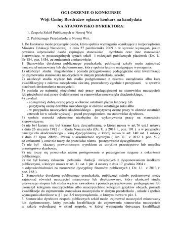 OGŁOSZENIE O KONKURSIE Wójt Gminy Rozdrażew ogłasza konkurs na kandydata NA STANOWISKO DYREKTORA: 1. Zespołu Szkół Publicznych w Nowej Wsi 2. Publicznego Przedszkola w Nowej Wsi. I. Do konkursu może przystąpić osoba, która spełnia wymagania wynikające z rozporządzenia Ministra Edukacji Narodowej z dnia 27 października 2009 r. w sprawie wymagań, jakim powinna odpowiadać osoba zajmująca stanowisko dyrektora oraz inne stanowisko kierownicze, w poszczególnych typach szkół i rodzajach publicznych placówek (Dz. U. Nr 184, poz. 1436, ze zmianami) a mianowicie: 1. Stanowisko dyrektora publicznego przedszkola, publicznej szkoły może zajmować nauczyciel mianowany lub dyplomowany, który spełnia łącznie następujące wymagania: 1) ukończył studia magisterskie i posiada przygotowanie pedagogiczne oraz kwalifikacje do zajmowania stanowiska nauczyciela w danym przedszkolu, szkole; 2) ukończył studia wyższe lub studia podyplomowe z zakresu zarządzania albo kurs kwalifikacyjny z zakresu zarządzania oświatą, prowadzony zgodnie z przepisami w sprawie placówek doskonalenia nauczycieli; 3) posiada co najmniej pięcioletni staż pracy pedagogicznej na stanowisku nauczyciela lub pięcioletni staż pracy dydaktycznej na stanowisku nauczyciela akademickiego; 4) uzyskał: - co najmniej dobrą ocenę pracy w okresie ostatnich pięciu lat pracy lub - pozytywną ocenę dorobku zawodowego w okresie ostatniego roku albo - w przypadku nauczyciela akademickiego – pozytywną ocenę pracy w okresie ostatnich czterech lat w szkole wyższej – przed przystąpieniem na stanowisko dyrektora, 5) spełnia warunki zdrowotne niezbędne do wykonywania pracy na stanowisku kierowniczym; 6) nie był karany nie był karany karą dyscyplinarną, o której mowa w art.76 ust.1 ustawy z dnia 26 stycznia 1982 r. – Karta Nauczyciela (Dz. U. z 2014 r., poz. 191 ) a w przypadku nauczyciela akademickiego – karą dyscyplinarną, o której mowa w art. 140 ust. 1 ustawy z dnia 27 lipca 2005r.- Prawo o szkolnictwie wyższym ( Dz. U. z 2012 r. poz. 572, ze zmianami ), oraz nie toczy się przeciwko niemu postępowanie dyscyplinarne; 7) nie był skazany prawomocnym wyrokiem za umyślne przestępstwo lub umyślne przestępstwo skarbowe; 8) nie toczy się przeciwko niemu postępowanie o przestępstwo ścigane z oskarżenia publicznego; 9) nie był karany zakazem pełnienia funkcji związanych z dysponowaniem środkami publicznymi, o którym mowa w art. 31 ust. 1 pkt 4 ustawy z dnia 17 grudnia 2004 r. o odpowiedzialności za naruszenie dyscypliny finansów publicznych ( Dz. U. z 2013 r. poz. 168 ). 2. Stanowisko dyrektora publicznego przedszkola, publicznej szkoły podstawowej może zajmować również nauczyciel mianowany lub dyplomowany, który ukończył studia pierwszego stopnia lub studia wyższe zawodowe i posiada przygotowanie pedagogiczne lub ukończył kolegium nauczycielskie albo nauczycielskie kolegium języków obcych, posiada kwalifikacje do zajmowania stanowiska nauczyciela w danym przedszkolu , szkole i spełnia wymagania określone w § 1 pkt 2-9 rozporządzenia , o którym mowa w pkt. I. 3. Stanowisko dyrektora zespołu publicznych szkół może zajmować nauczyciel mianowany lub dyplomowany, który posiada kwalifikacje do zajmowania stanowiska nauczyciela w szkole wchodzącej w skład zespołu, w której wymagania dotyczące kwalifikacji nauczycieli są wyższe, oraz spełnia wymagania określone w § 1 pkt 2-9 rozporządzenia , o którym mowa w pkt I. 4. Stanowisko dyrektora publicznego przedszkola, publicznej szkoły oraz zespołu publicznych szkół może zajmować osoba niebędąca nauczycielem, która spełnia łącznie następujące wymagania: 1) posiada obywatelstwo polskie, z tym że wymóg tentem nie dotyczy obywateli państw członkowskich Unii Europejskiej, państw członkowskich Europejskiego Porozumienia o Wolnym Handlu (EFTA)- stron umowy o Europejskim Obszarze Gospodarczym oraz Konfederacji Szwajcarskiej; 2) ukończyła studia magisterskie; 3) posiada co najmniej pięcioletni staż pracy, w tym co najmniej dwuletni staż pracy na stanowisku kierowniczym; 4) ma pełną zdolność do czynności prawnych i korzysta z praw publicznych; 5) nie toczy się przeciwko niej postępowanie o przestępstwo ścigane z oskarż publicznego lub postępowanie dyscyplinarne; 6) spełnia wymagania określone w § 1 pkt 2, 5, 7 i 9 rozporządzenia, o którym mowa w pkt I. 5. Stanowisko dyrektora w publicznym przedszkoli, publicznej szkole oraz zespole publicznych szkół może zajmować również nauczyciel mianowany lub dyplomowany zatrudniony na stanowisku wymagającym kwalifikacji pedagogicznych w urzędzie organu administracji rządowej, kuratorium oświaty, Centrum Edukacji Artystycznej, Centralnej Komisji Egzaminacyjnej i okręgowych komisjach egzaminacyjnych, oraz nauczyciel mianowany lub dyplomowany urlopowany lub zwolniony z obowiązku świadczenia pracy na podstawie przepisów ustawy z dnia 23 maja 1991r. o związkach zawodowych (Dz.U. z 2001 r. Nr 79, poz. 854 ze zmianami ) spełniający wymagania określone w rozporządzeniu, z wyjątkiem wymogu posiadania co najmniej dobrej oceny pracy albo pozytywnej oceny dorobku zawodowego. II. Oferty osób przystępujących do konkursu , zgodnie z rozporządzeniem Ministra Edukacji Narodowej z dnia 8 kwietnia 2010 r. w sprawie regulaminu konkursu na stanowisko dyrektora publicznej szkoły lub publicznej placówki oraz trybu pracy komisji konkursowej ( Dz. U. Nr 60, poz. 373, ze zmianami ),powinny zawierać: 1) uzasadnienie przystąpienia do konkursu oraz koncepcję funkcjonowania i rozwoju publicznego przedszkola lub publicznej szkoły; 2) poświadczoną przez kandydata za zgodność z oryginałem kopię dowodu osobistego lub innego dokumentu potwierdzającego tożsamość oraz poświadczającego obywatelstwo, 3) życiorys z opisem przebiegu pracy zawodowej; zawierający w szczególności informację o: - stażu pracy pedagogicznej – w przypadk