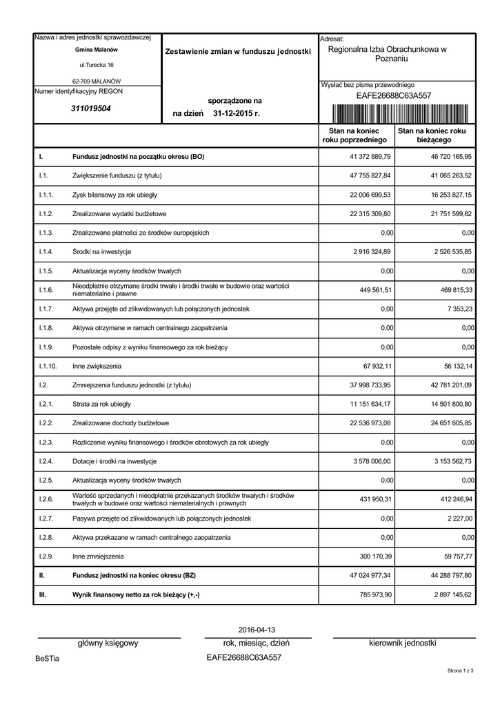 Nazwa i adres jednostki sprawozdawczej Gmina Malanów ul.Turecka 16 Zestawienie zmian w funduszu jednostki 62-709 MALANÓW Numer identyfikacyjny REGON 311019504 na dzień sporządzone na 31-12-2015 r. Adresat: Regionalna Izba Obrachunkowa w Poznaniu Wysłać bez pisma przewodniego EAFE26688C63A557 Stan na koniec roku poprzedniego Stan na koniec roku bieżącego I. Fundusz jednostki na początku okresu (BO) 41 372 889,79 46 720 165,95 I.1. Zwiększenie funduszu (z tytułu) 47 755 827,84 41 065 263,52 I.1.1. Zysk bilansowy za rok ubiegły 22 006 699,53 16 253 827,15 I.1.2. Zrealizowane wydatki budżetowe 22 315 309,80 21 751 599,82 I.1.3. Zrealizowane płatności ze środków europejskich I.1.4. Środki na inwestycje I.1.5. Aktualizacja wyceny środków trwałych 0,00 2 916 324,89 0,00 2 526 535,85 0,00 0,00 449 561,51 469 815,33 Aktywa przejęte od zlikwidowanych lub połączonych jednostek 0,00 7 353,23 I.1.8. Aktywa otrzymane w ramach centralnego zaopatrzenia 0,00 0,00 I.1.9. Pozostałe odpisy z wyniku finansowego za rok bieżący 0,00 0,00 I.1.10. Inne zwiększenia 67 932,11 56 132,14 I.2. Zmniejszenia funduszu jednostki (z tytułu) 37 998 733,95 42 781 201,09 I.2.1. Strata za rok ubiegły 11 151 634,17 14 501 800,80 I.2.2. Zrealizowane dochody budżetowe 22 536 973,08 24 651 605,85 I.2.3. Rozliczenie wyniku finansowego i środków obrotowych za rok ubiegły I.2.4. Dotacje i środki na inwestycje I.2.5. Aktualizacja wyceny środków trwałych I.1.6. I.1.7. Nieodpłatnie otrzymane środki trwałe i środki trwałe w budowie oraz wartości niematerialne i prawne 0,00 3 578 006,00 0,00 3 153 562,73 0,00 0,00 431 950,31 412 246,94 Pasywa przejęte od zlikwidowanych lub połączonych jednostek 0,00 2 227,00 I.2.8. Aktywa przekazane w ramach centralnego zaopatrzenia 0,00 0,00 I.2.9. Inne zmniejszenia 300 170,39 59 757,77 II. Fundusz jednostki na koniec okresu (BZ) 47 024 977,34 44 288 797,80 III. Wynik finansowy netto za rok bieżący (+,-) 785 973,90 2 897 145,62 I.2.6. I.2.7. BeSTia Wartość sprzedanych i nieodpłatnie przekazanych środków trwałych i środków trwałych w budowie oraz wartości niematerialnych i prawnych główny księgowy 2016-04-13 rok, miesiąc, dzień EAFE26688C63A557 kierownik jednostki Strona 1 z 3 III.1. zysk netto (+) 16 253 827,15 18 206 265,80 III.2. strata netto (-) -15 467 853,25 -15 309 120,18 IV. V. Nadwyżka dochodów jednostek budżetowych, nadwyżka środków obrotowych samorządowych zakładków budżetowych Fundusz (II+,-III-IV) 0,00 47 810 951,24 0,00 47 185 943,42 Informacje uzupełniające istotne dla oceny rzetelności i przejrzystości sytuacji finansowej : BeSTia główny księgowy 2016-04-13 rok, miesiąc, dzień EAFE26688C63A557 kierownik jednostki Strona 2 z 3 Wyjaśnienia do sprawozdania BeSTia główny księgowy 2016-04-13 rok, miesiąc, dzień EAFE26688C63A557 kierownik jednostki Strona 3 z 3