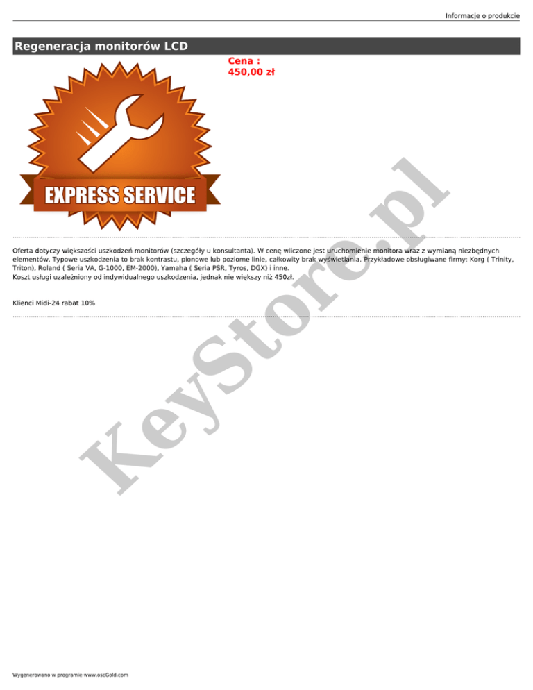 Informacje o produkcie Regeneracja monitorów LCD or e. pl Cena : 450,00 zł Oferta dotyczy większości uszkodzeń monitorów (szczegóły u konsultanta). W cenę wliczone jest uruchomienie monitora wraz z wymianą niezbędnych elementów. Typowe uszkodzenia to brak kontrastu, pionowe lub poziome linie, całkowity brak wyświetlania. Przykładowe obsługiwane firmy: Korg ( Trinity, Triton), Roland ( Seria VA, G-1000, EM-2000), Yamaha ( Seria PSR, Tyros, DGX) i inne. Koszt usługi uzależniony od indywidualnego uszkodzenia, jednak nie większy niż 450zł. K ey St Klienci Midi-24 rabat 10% Wygenerowano w programie www.oscGold.com