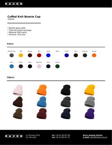 Cuffed Knit Beanie Cap 1501KC • Bardzo gęsty splot • Tylko do prania ręcznego • Materiał 100% akryl • Rozmiar: One Size Kolory Heather-Grey Gold Maroon Red Royal White Blue Brown Black Baby-Pink Navy Spruce Purple Olive Charcoal Orange Zdjęcia ul. Plonowa 20 B, 91-156 Łódź tel.: 48 42 650-97-60 fax: 48 42 650-97-70 Biuro obsługi klienta e-mail: [email protected] ul. Plonowa 20 B, 91-156 Łódź tel.: 48 42 650-97-60 fax: 48 42 650-97-70 Biuro obsługi klienta e-mail: [email protected]