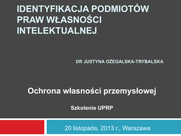 IDENTYFIKACJA PODMIOTÓW PRAW WŁASNOŚCI INTELEKTUALNEJ DR JUSTYNA OŻEGALSKA-TRYBALSKA Ochrona własności przemysłowej Szkolenie UPRP 20 listopada, 2013 r., Warszawa Problem właściwej identyfikacji twórcy konkretnego, chronionego wytworu i/lub podmiotu uprawnionego do jego eksploatacji Podmiot praw własności intelektualnej Współtwórca ? Twórca ? Podmiot finansujący prace ? Pracodaw ca? Zlecający ? Nabywca praw ? Wytwór intelektualny Osoba kierująca pracami ? „Podmiot praw” Pierwotnie uprawniony Wtórnie uprawniony Twórca Współtwórcy Pracodawca Zlecający Nabywca osoba fizyczna (osoby fizyczne) która stworzyła (które stworzyły) wytwór intelektualny objęty ochroną) osoba fizyczna, prawna, jednostka organizacyjna, która nabyła prawo na mocy ustawy lub umowy „Podmiot praw” Osobistych Twórca Współtwórcy Prawo do autorstwa Majątkowych Twórca Współtwórcy Pracodawca Zlecający Nabywca Prawo do komercyjnej eksploatacji Podmiot praw własności intelektualnej Współtwór ca Nabywca praw Pracodawca Wytwór intelektualn y Kryteria istotne z punktu widzenia prawidłowego ustalenia podmiotu praw własności intelektualnej ? ? ? • Przedmiot ochrony • (przedmiot praw autorskich, pokrewnych własności przemysłowej, prawa sui generis do baz danych) • Zasady ustawowe nabycia praw • (określone przepisami bezwzględnie/względnie obowiązującymi) • Charakter praw • (majątkowe, osobiste) Kryteria istotne z punktu widzenia prawidłowego ustalenia podmiotu praw własności intelektualnej ? • „Status” wytworu intelektualnego • (samodzielny, współautorski, pracowniczy, na zlecenie?) ? • „Status” twórcy • (samodzielny twórca, pracownik, zleceniobiorca, student) ? • Związanie twórcy postanowieniami regulującymi kwestię praw własności intelektualnej • (wewnętrzne regulaminy ds. własności intelektualnej, umowy grantowe) Ustawowe zasady określające podmiot praw własności intelektualnej PRAWO AUTORSKIE PRAWO WŁASNOŚCI PRZEMYSŁOWEJ art. 8, art. 16, art.17 – utwory art. 8, art. 11 ust.1 – samodzielne samodzielne wynalazki, wzory art. 9, art. 16, art.17 – utwory art.8, art. 11ust.2 wspólne współautorskie wynalazki, wzory art. 12 - utwory pracownicze art. 11 ust.3 pracownicze art. 14 - naukowe utwory wynalazki, wzory pracownicze art. 15 a - prace dyplomowe studentów Wewnętrzne regulaminy (o ile wiążą twórcę) Znowelizowane przepisy ustawy o szkolnictwie wyższym ? (w stosunku do pracowników uczelni i jednostek badawczych o ile wejdą w życie) Możliwość modyfikacji zasad ustawowych określających podmiot praw własności intelektualnej tylko w odniesieniu do przepisów względnie obowiązujących, z których wynika możliwość modyfikacji reżimu ustawowego („o ile umowa lub ustawa nie stanowi inaczej….”) w odniesieniu do wytworów intelektualnych stworzonych w ramach stosunku pracy na podstawie umowy o pracę (lub na podstawie umowy zlecenia w przypadku przedmiotów praw własności przemysłowej) brak skuteczności postanowień wewnętrznych regulaminów (postanowień) modyfikujących reżimy ustawowe, które nie stanowią integralnej części umowy o pracę Problem identyfikacji podmiotu praw w przypadku wytworów intelektualnych tworzonych wspólnie Brak ustawowej definicji „współtwórczości” (współtwórcy) osoba, która twórczo przyczyniła się do stworzenia chronionego wytworu (?) osoba, która pomagała w stworzeniu wspólnego utworu(?) osoba, która zainspirowała stworzenie chronionego wytworu (?) Wytwór intelektualny (stworzony niesamodzielnie) osoba, która kierowała pracami prowadzącymi do stworzenia chronionego wytworu(?) Brak jednolitych standardów w zakresie oceny współtwórczości w orzecznictwie sądowym Kazuistyczne przykłady działalności pozbawionej charakteru twórczego w orzecznictwie sądowym brak twórczego wkładu osoby jej współpraca nie ma charakteru twórczego, lecz pomocniczy, chociażby umiejętność wykonywania czynności pomocniczych wymagała wysokiego stopnia wiedzy fachowej, zręczności i inicjatywy osobistej (2002.07.05, wyrok SN, III CKN 1096/00, Biul. SN 2003/2/10), dana osoba przy tworzeniu dzieła wykonuje tylko czynności techniczne obsługi sprzętu ściśle według wskazówek twórcy (2002.07.05, wyrok SN, III CKN 1096/00, Biul. SN 2003/2/10). Kazuistyczne przykłady prac pozbawionych charakteru twórczego w przypadku twórczości wynalazczej inicjatywa dokonania wynalazku, pomysł na przeprowadzenie badań nieujęty w żadną konkretną formę opracowanie naukowej koncepcji stanowiącej podstawę dokonania wynalazku przekazanie wiedzy fachowej wykonywanie czynności mechanicznych zgodnie z poleceniami innej osoby wniesienie poprawek do procesu badawczego niemających charakteru merytorycznego, a jedynie będących poprawkami technicznymi lub organizacyjnymi sprawdzenie pracy zespołu badawczego kierowanie zespołem badawczym zebranie danych wykorzystanych przy tworzeniu wynalazku przygotowanie urządzeń i/lub infrastruktury umożliwiającej dokonanie wynalazku przeprowadzenie badań laboratoryjnych, testów sprawdzających działanie wynalazku Współautorstwo wynika wyłącznie z faktu, czy dana osoba twórczo przyczyniła się do stworzenia danego wytworu wniosła wkład twórczy w stworzenie utworu tzn. nadała utworowi indywidualne, oryginalne cechy (prawo autorskie) przyczyniła się do rozwiązania problemu technicznego leżącego u podstaw wynalazku (prawo patentowe) Okoliczności nieistotne z punktu widzenia prawidłowego ustalenia twórcy/współtwórcy wynalazku „status” autora/współautora wynalazku zajmowane stanowisko, funkcja brak w zakresie swoich kompetencji obowiązku prowadzenia prac (twórczych, wynalazczych badawczych, wdrożeniowych) „zgodność z prawem” prac prowadzących do stworzenia wynalazku zgody zwierzchników/uprawnionych podmiotów do prowadzenia prac badawczych prowadzenie prac wynalazc