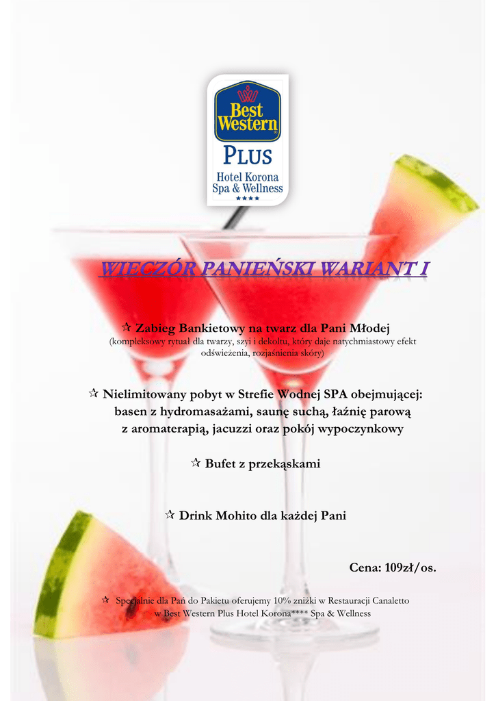 Zabieg Bankietowy na twarz dla Pani Młodej (kompleksowy rytuał dla twarzy, szyi i dekoltu, który daje natychmiastowy efekt odświeżenia, rozjaśnienia skóry) Nielimitowany pobyt w Strefie Wodnej SPA obejmującej: basen z hydromasażami, saunę suchą, łaźnię parową z aromaterapią, jacuzzi oraz pokój wypoczynkowy Bufet z przekąskami Drink Mohito dla każdej Pani Cena: 109zł/os. Specjalnie dla Pań do Pakietu oferujemy 10% zniżki w Restauracji Canaletto w Best Western Plus Hotel Korona**** Spa & Wellness Nielimitowany pobyt w Strefie Wodnej SPA obejmującej: basen z hydromasażami, saunę suchą, łaźnię parową z aromaterapią, jacuzzi oraz pokój wypoczynkowy Wspólny Seans w łaźni algowo-błotnej (seans kąpieli w łaźni parowej z aplikacją kompozycji o działaniu peelingującym, remineralizującym i detoksykującym) Bufet z przekąskami Drink Mohito dla każdej Pani Cena: 149zł/os. Specjalnie dla Pań do Pakietu oferujemy 10% zniżki w Restauracji Canaletto w Best Western Plus Hotel Korona**** Spa & Wellness Zabieg Róża Orientu dla przyszłej Panny Młodej (kompleksowy zabieg na twarz i ciało oddziałujący na psychikę i zmysły, głęboko relaksujący, wygładzający i nawilżający skórę, stymulujący mikrokrążenie, poprawiający elastyczność skóry) Wspólny Seans w łaźni algowo-błotnej (seans kąpieli w łaźni parowej z aplikacją kompozycji o działaniu peelingującym, remineralizującym i detoksykującym) Nielimitowany pobyt w Strefie Wodnej SPA obejmującej: basen z hydromasażami, saunę suchą, łaźnię parową z aromaterapią, jacuzzi oraz pokój wypoczynkowy Bufet z przekąskami Drink Mohito dla każdej Pani Cena: 185 zł/ os.* * Cena pakietu przy grupie 12 osób. Poniżej i powyżej tej liczby wycena indywidualna. Specjalnie dla Pań do Pakietu oferujemy 10% zniżki w Restauracji Canaletto w Best Western Plus Hotel Korona**** Spa & Wellness