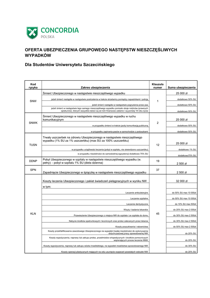 OFERTA UBEZPIECZENIA GRUPOWEGO NASTĘPSTW NIESZCZĘŚLIWYCH WYPADKÓW OFERTA UBEZPIECZENIA GRUPOWEGO NASTĘPSTW NIESZCZĘŚLIWYCH WYPADKÓW Dla Studentów Uniwersytetu Szczecińskiego Kod ryzyka Klauzula numer Zakres ubezpieczenia Śmierć Ubezpieczonego w następstwie nieszczęśliwego wypadku 25 000 zł jeŜeli śmierć nastąpiła w następstwie postrzelenia w trakcie strzelaniny pomiędzy napastnikami i policją SNW Suma ubezpieczenia 1 dodatkowo 50% SU jeŜeli śmierć nastąpiła w następstwie pogryzienia przez psa dodatkowo 50% SU jeŜeli śmierć w następstwie tego samego nieszczęśliwego wypadku poniosło oboje rodziców (prawnych opiekunów), których wszystkie dzieci są od nich finansowo zaleŜne i są poniŜej 18 roku Ŝycia dodatkowo 50% SU Śmierć Ubezpieczonego w następstwie nieszczęśliwego wypadku w ruchu komunikacyjnym SNWK 25 000 zł 2 w przypadku śmierci w trakcie jazdy komunikacją publiczną dodatkowo 50% SU w przypadku zapinania pasów w samochodzie z poduszkami dodatkowo 50% SU Trwały uszczerbek na zdrowiu Ubezpieczonego w następstwie nieszczęśliwego wypadku (1% SU za 1% uszczerbku) (max SU za 100% uszczerbku) TUSN 12 w przypadku uciąŜliwości leczenia (pobyt w szpitalu, nie stwierdzono uszczerbku) dodatkowo 1% SU w przypadku niezdolności do samodzielnej egzystencji dodatkowo 75% SU DDNP SPN Pobyt Ubezpieczonego w szpitalu w następstwie nieszczęśliwego wypadku (w. pełny): - pobyt w szpitalu 1% SU (dieta dzienna) Zapadnięcie Ubezpieczonego w śpiączkę w następstwie nieszczęśliwego wypadku 25 000 zł dodatkowo75% SU 19 37 Koszty leczenia Ubezpieczonego i pakiet świadczeń pielęgnacyjnych w wyniku NW 2 500 zł 2 500 zł 32 000 zł w tym: Leczenie ambulatoryjne do 50% SU max 10 000zł Leczenie szpitalne do 50% SU max 10 000zł Leczenie dentystyczne do 10% SU max 500zł Wizyty i badania lekarskie KLN Przewiezienie Ubezpieczonego z miejsca NW do szpitala i ze szpitala do domu do 20% SU max 2 000zł 45 do 30% SU max 2 500zł Nabycie środków opatrunkowych i leczniczych oraz protez zalecanych przez lekarza do 30% SU max 2 500zł Koszty poszukiwania i ratownictwa do 50% SU max 2 500zł Koszty przekfalifikowania zawodowego Ubezpieczonego na wypadek trwałej niezdolności do wykonywania dotychczasowej pracy spowodowanej NW do 20% SU Koszty wypoŜyczenia, naprawy lub zakupu protez, przedmiotów ortopedycznych i środków pomocniczych wspierających proces leczenia NNW do 20% SU Koszty wypoŜyczenia, naprawy lub zakupu wózka inwalidzkiego, na wypadek inwalidztwa spowodowanego NW do 30% SU Koszty operacji plastycznych mających na celu usunięcie oszpeceń powstałych wskutek NW do 20% SU