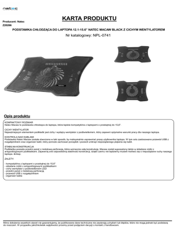 Producent: Natec Z20266 KARTA PRODUKTU PODSTAWKA CHŁODZĄCA DO LAPTOPA 12.1-15.6” NATEC MACAW BLACK Z CICHYM WENTYLATOREM Nr katalogowy: NPL-0741 Opis produktu KOMPAKTOWY ROZMIAR Natec Macaw to podstawka chłodząca do laptopa, która będzie kompatybilna z laptopami o przekątnej do 15,6". CICHY WENTYLATOR Najważniejszym elementem podkładki jest cichy i wydajny wentylator z podświetleniem, który zapewni optymalne warunki pracy dla naszego laptopa. KONTROLA NAD KABLAMI Podstawka Natec Macaw została stworzona w taki sposób, by maksymalnie usprawniać pracę użytkownika laptopa. W tym celu zastosowano przewód USB z rozgałęźnikiem oraz organizer kabli, który pomoże zachować porządek i pozwoli uniknąć niepożądanego plątania się kabli. STABILNA KONSTRUKCJA Podkładka posiada przedni panel z metalową perforacją, która wzmacnia całą konstrukcję. Macaw został wyposażony także w składane nóżki z antypoślizgowymi podkładkami. Zapewnią one odpowiednią stabilność konstrukcji, dzięki czemu nie będziemy musieli martwić się o niepożądane ruchy naszego laptopa. ZALETY: - kompatybilna z laptopami o przekątnej do 15,6" - składane nóżki z antypoślizgowymi podkładkami - cichy wentylator z podświetleniem LED - przedni panel z metalową perforacją - przewód USB z rozgałęźnikiem - organizer kabla Mimo dołożenia wszelkich starań nie gwarantujemy, że publikowane dane techniczne nie zawierają uchybień lub błędów, które nie mogą jednak być podstawą do roszczeń. W przypadku jakichkolwiek wątpliwości prosimy przed podjęciem decyzji o kontakt z handlowcem. Cechy produktu Długość [mm] 350,00 Szerokość [mm] 250,00 Wysokość [mm] 30,00 Podświetlenie Tak Zasilanie USB (5V) Poziom hałasu [dB] 20,00 Dedykowany rozmiar ["] 15,60 Materiał ABS + metal Liczba zainstalowanych wentylatorów 1,00 Zainstalowane wentylatory 1x120 mm Prędkość obrotowa [RPM] od 1 000,00 do 1 000,00 Przepływ powietrza [CFM] od 28,00 do 28,00 Regulacja kąta nachylenia 2 poziomy Waga [g] 410,00 Dane logistyczne EAN 5901969402377 Szerokość sztuki [cm] 25,50 Wysokość sztuki [cm] 3,00 Długość sztuki [cm] 36,00 Waga sztuki [kg] 0.52900 EAN kartonu 15901969402374 Ilość w kartonie [szt] 20.000 Szerokość kartonu [cm] 38,50 Wysokość kartonu [cm] 28,50 Długość kartonu [cm] 63,00 Waga kartonu [kg] 11.23500 Stawka VAT [%] 23,00 % Gwarancja 24 Kraj pochodzenia Chiny Kod celny 84145920 Mimo dołożenia wszelkich starań nie gwarantujemy, że publikowane dane techniczne nie zawierają uchybień lub błędów, które nie mogą jednak być podstawą do roszczeń. W przypadku jakichkolwiek wątpliwości prosimy przed podjęciem decyzji o kontakt z handlowcem.