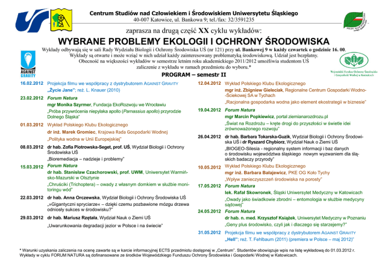 Centrum Studiów nad Człowiekiem i Środowiskiem Uniwersytetu Śląskiego 40-007 Katowice, ul. Bankowa 9; tel./fax: 32/3591235 zaprasza na drugą część XX cyklu wykładów: WYBRANE PROBLEMY EKOLOGII I OCHRONY ŚRODOWISKA Wykłady odbywają się w sali Rady Wydziału Biologii i Ochrony Środowiska UŚ (nr 121) przy ul. Bankowej 9 w każdy czwartek o godzinie 16. 00. Wykłady są otwarte i może wziąć w nich udział każdy zainteresowany problematyką środowiskową. Udział jest bezpłatny. Obecność na większości wykładów w semestrze letnim roku akademickiego 2011/2012 umożliwia studentom UŚ zaliczenie z wykładu w ramach przedmiotu do wyboru.* PROGRAM – semestr II 16.02.2012 Projekcja filmu we współpracy z dystrybutorem AGAINST GRAVITY „Życie Jane”; reż. L. Knauer (2010) 23.02.2012 Forum Natura mgr Monika Szyrmer, Fundacja EkoRozwoju we Wrocławiu „Próba przywrócenia niepylaka apollo (Parnassius apollo) przyrodzie Dolnego Śląska” 01.03.2012 Wykład Polskiego Klubu Ekologicznego dr inż. Marek Gromiec, Krajowa Rada Gospodarki Wodnej „Polityka wodna w Unii Europejskiej” 08.03.2012 dr hab. Zofia Piotrowska-Seget, prof. UŚ, Wydział Biologii i Ochrony Środowiska UŚ „Bioremediacja – nadzieje i problemy” 15.03.2012 Forum Natura dr hab. Stanisław Czachorowski, prof. UWM, Uniwersytet Warmińsko-Mazurski w Olsztynie „Chruściki (Trichoptera) – owady z własnym domkiem w służbie monitoringu wód” 22.03.2012 dr hab. Anna Orczewska, Wydział Biologii i Ochrony Środowiska UŚ „»Gigantyczni spryciarze« – dzięki czemu pozbawione mózgu drzewa odniosły sukces w środowisku?” 29.03.2012 dr hab. Mariusz Rzętała, Wydział Nauk o Ziemi UŚ „Uwarunkowania degradacji jezior w Polsce i na świecie” 12.04.2012 Wykład Polskiego Klubu Ekologicznego mgr inż. Zbigniew Gieleciak, Regionalne Centrum Gospodarki Wodno-Ściekowej SA w Tychach „Racjonalna gospodarka wodna jako element ekostrategii w biznesie” 19.04.2012 Forum Natura mgr Marcin Popkiewicz, portal ziemianarozdrozu.pl „Świat na Rozdrożu – kręte drogi do przyszłości w świetle idei zrównoważonego rozwoju” 26.04.2012 dr hab. Barbara Tokarska-Guzik, Wydział Biologii i Ochrony Środowiska UŚ i dr Ryszard Chybiorz, Wydział Nauk o Ziemi UŚ „BIOGEO-Silesia - regionalny system informacji i baz danych o środowisku województwa śląskiego nowym wyzwaniem dla śląskich badaczy przyrody” 10.05.2012 Wykład Polskiego Klubu Ekologicznego mgr inż. Barbara Bałajewicz, PKE OG Koło Tychy „Wpływ zanieczyszczeń środowiska na porosty” 17.05.2012 Forum Natura lek. Rafał Skowronek, Śląski Uniwersytet Medyczny w Katowicach „Owady jako świadkowie zbrodni – entomologia w służbie medycyny sądowej” 24.05.2012 Forum Natura dr hab. n. med. Krzysztof Książek, Uniwersytet Medyczny w Poznaniu „Geny plus środowisko, czyli jak i dlaczego się starzejemy?” 31.05.2012 Projekcja filmu we współpracy z dystrybutorem AGAINST GRAVITY „Hell”; reż. T. Fehlbaum (2011) (premiera w Polsce – maj 2012)” * Warunki uzyskania zaliczenia na ocenę zawarte są w karcie informacyjnej ECTS przedmiotu dostępnej w „Centrum”. Studentów obowiązuje wpis na listę wykładową do 01.03.2012 r. Wykłady w cyklu FORUM NATURA są dofinansowane ze środków Wojewódzkiego Funduszu Ochrony Środowiska i Gospodarki Wodnej w Katowicach.
