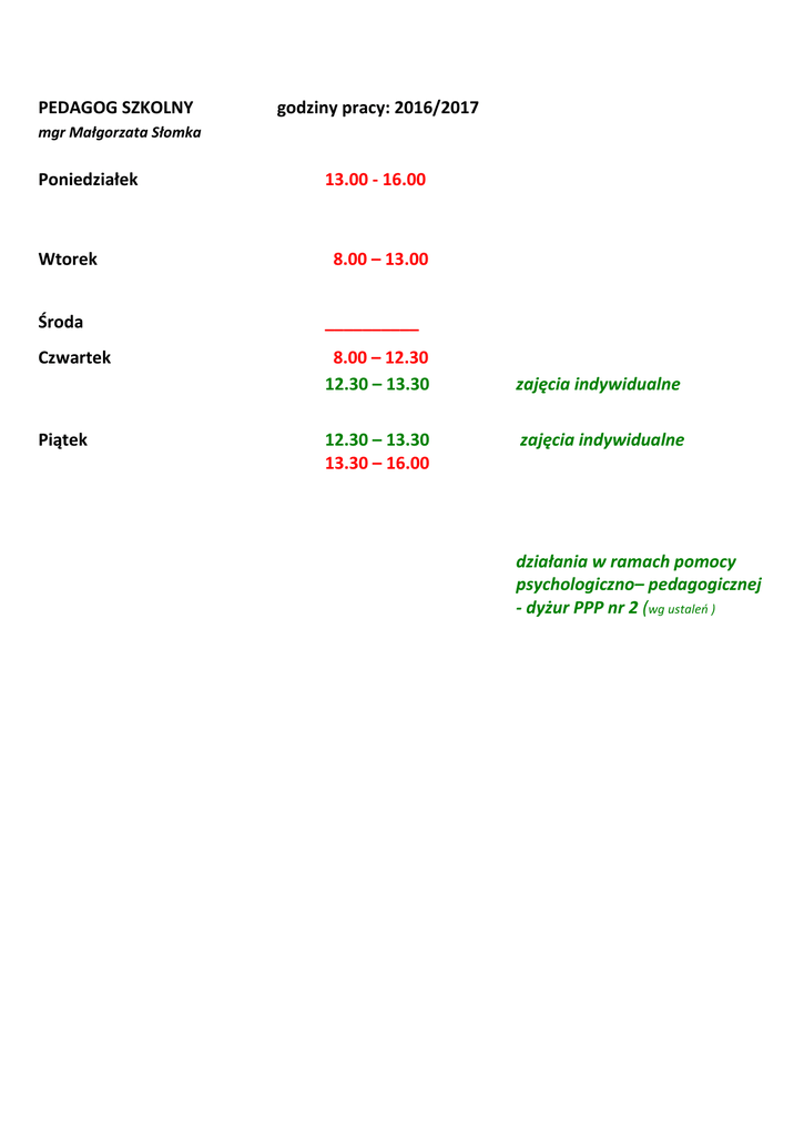 PEDAGOG SZKOLNY godziny pracy: 2016/2017 mgr Małgorzata Słomka Poniedziałek Wtorek 13.00 - 16.00 8.00 – 13.00 Środa __________ Czwartek 8.00 – 12.30 12.30 – 13.30 Piątek 12.30 – 13.30 13.30 – 16.00 zajęcia indywidualne zajęcia indywidualne działania w ramach pomocy psychologiczno– pedagogicznej - dyżur PPP nr 2 (wg ustaleń )