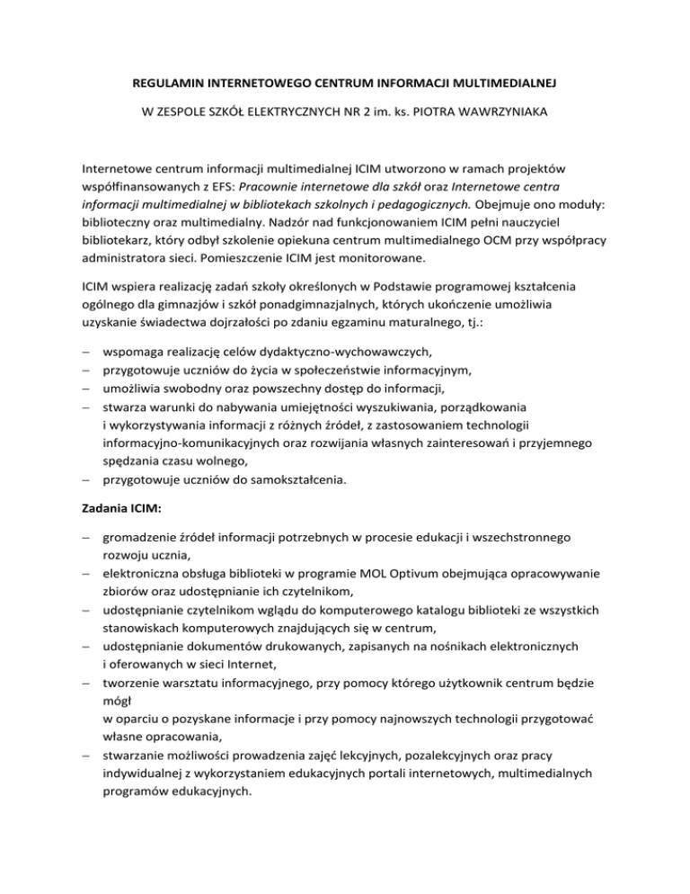 REGULAMIN INTERNETOWEGO CENTRUM INFORMACJI MULTIMEDIALNEJ W ZESPOLE SZKÓŁ ELEKTRYCZNYCH NR 2 im. ks. PIOTRA WAWRZYNIAKA Internetowe centrum informacji multimedialnej ICIM utworzono w ramach projektów współfinansowanych z EFS: Pracownie internetowe dla szkół oraz Internetowe centra informacji multimedialnej w bibliotekach szkolnych i pedagogicznych. Obejmuje ono moduły: biblioteczny oraz multimedialny. Nadzór nad funkcjonowaniem ICIM pełni nauczyciel bibliotekarz, który odbył szkolenie opiekuna centrum multimedialnego OCM przy współpracy administratora sieci. Pomieszczenie ICIM jest monitorowane. ICIM wspiera realizację zadań szkoły określonych w Podstawie programowej kształcenia ogólnego dla gimnazjów i szkół ponadgimnazjalnych, których ukończenie umożliwia uzyskanie świadectwa dojrzałości po zdaniu egzaminu maturalnego, tj.: wspomaga realizację celów dydaktyczno-wychowawczych, przygotowuje uczniów do życia w społeczeństwie informacyjnym, umożliwia swobodny oraz powszechny dostęp do informacji, stwarza warunki do nabywania umiejętności wyszukiwania, porządkowania i wykorzystywania informacji z różnych źródeł, z zastosowaniem technologii informacyjno-komunikacyjnych oraz rozwijania własnych zainteresowań i przyjemnego spędzania czasu wolnego, przygotowuje uczniów do samokształcenia. Zadania ICIM: gromadzenie źródeł informacji potrzebnych w procesie edukacji i wszechstronnego rozwoju ucznia, elektroniczna obsługa biblioteki w programie MOL Optivum obejmująca opracowywanie zbiorów oraz udostępnianie ich czytelnikom, udostępnianie czytelnikom wglądu do komputerowego katalogu biblioteki ze wszystkich stanowiskach komputerowych znajdujących się w centrum, udostępnianie dokumentów drukowanych, zapisanych na nośnikach elektronicznych i oferowanych w sieci Internet, tworzenie warsztatu informacyjnego, przy pomocy którego użytkownik centrum będzie mógł w oparciu o pozyskane informacje i przy pomocy najnowszych technologii przygotować własne opracowania, stwarzanie możliwości prowadzenia zajęć lekcyjnych, pozalekcyjnych oraz pracy indywidualnej z wykorzystaniem edukacyjnych portali internetowych, multimedialnych programów edukacyjnych. Zasady korzystania z ICIM: 1. Użytkownicy centrum posiadają dostęp do sprzętu komputerowego w ilości ośmiu stanowisk komputerowych podłączonych do sieci Internet oraz wielofunkcyjnego urządzenia sieciowego. 2. Ze sprzętu komputerowego mogą korzystać wszyscy uczniowie, pracownicy szkoły, rodzice oraz absolwenci. 3. Uczniowie mogą korzystać z ICIM poza godzinami swoich zajęć lekcyjnych. 4. Podczas przerw sprzęt komputerowy jest udostępniany tylko za zgodą dyżurnego nauczyciela bibliotekarza. 5. Przy jednym stanowisku komputerowym pracować może do dwóch osób. 6. Przed rozpoczęciem pracy przy komputerze, należy wpisać się do zeszytu odwiedzin podając: datę, imię i nazwisko, klasę, numer komputera, godziny pracy, poszukiwane informacje. 7. Sprzęt komputerowy służy realizowaniu celów edukacyjnych. Dopuszczalne jest korzystanie z poczty elektronicznej oraz portali społecznościowych. 8. Pierwszeństwo przy korzystaniu z komputerów mają te osoby, które przygotowują się do zajęć lekcyjnych czy konkursów. 9. Użytkownicy mogą korzystać z własnych nośników pamięci. 10. Drukowanie materiałów edukacyjnych dostępnych w sieci Internet jest odpłatne. Wysokość opłat ustali dyrektor szkoły. 11. O wszelkich zakłóceniach pracy komputerów należy poinformować dyżurnego nauczyciela bibliotekarza. 12. Za mechaniczne uszkodzenie sprzętu komputerowego i oprogramowania odpowiada użytkownik. 13. Zabrania się: dokonywania zmian w systemie komputerowym, kasowania programów zainstalowanych przez administratora sieci, samodzielnego dokonywania połączeń technicznych, instalowania własnego oprogramowania, korzystania ze stron internetowych zawierających treści niezgodne z przyjętymi normami społecznymi, gier komputerowych, spożywania posiłków, korzystania z telefonów komórkowych. 14. Nie przestrzeganie regulaminu skutkować będzie karą upomnienia, a następnie czasowego ograniczenia dostępu do sprzętu komputerowego. Wymiar czasu określi dyżurny nauczyciel bibliotekarz. 15. Użytkownik może zostać wyproszony z centrum w sytuacji, gdy jego postawa budzić będzie zastrzeżenia (niekulturalne zachowanie, przeklinanie, przeszkadzanie w pracy innym użytkownikom).