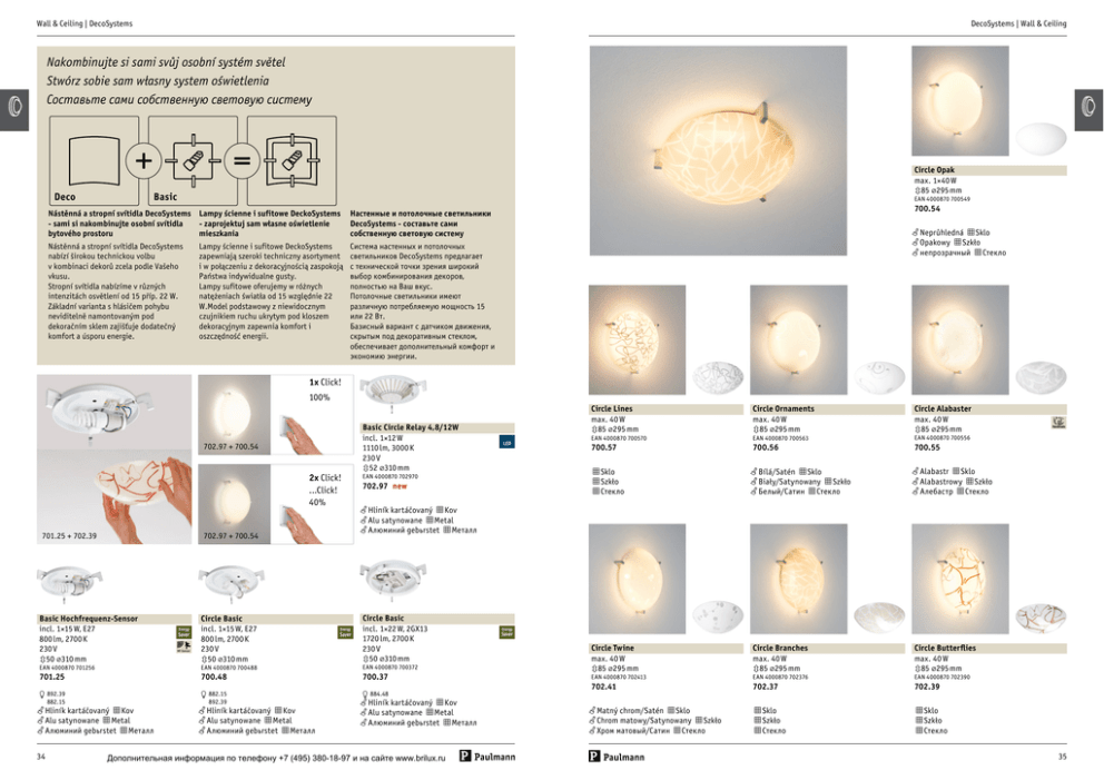 Wall & Ceiling | DecoSystems DecoSystems | Wall & Ceiling Nakombinujte si sami svůj osobní systém světel Stwórz sobie sam własny system oświetlenia Составьте сами собственную световую систему Deco Circle Opak max. 1×40 W 385 ⌀295 mm Basic EAN 4000870 700549 Nástěnná a stropní svítidla DecoSystems Lampy ścienne i sufitowe DeckoSystems - sami si nakombinujte osobní svítidla - zaprojektuj sam własne oświetlenie mieszkania bytového prostoru Настенные и потолочные светильники DecoSystems - составьте сами собственную световую систему Nástěnná a stropní svítidla DecoSystems nabízí širokou technickou volbu v kombinaci dekorů zcela podle Vašeho vkusu. Stropní svítidla nabízíme v různých intenzitách osvětlení od 15 příp. 22 W. Základní varianta s hlásičem pohybu neviditelně namontovaným pod dekoračním sklem zajišťuje dodatečný komfort a úsporu energie. Система настенных и потолочных светильников DecoSystems предлагает с технической точки зрения широкий выбор комбинирования декоров, полностью на Ваш вкус. Потолочные светильники имеют различную потребляемую мощность 15 или 22 Вт. Базисный вариант с датчиком движения, скрытым под декоративным стеклом, обеспечивает дополнительный комфорт и экономию энергии. Lampy ścienne i sufitowe DeckoSystems zapewniają szeroki techniczny asortyment i w połączeniu z dekoracyjnością zaspokoją Państwa indywidualne gusty. Lampy sufitowe oferujemy w różnych natężeniach światła od 15 względnie 22 W.Model podstawowy z niewidocznym czujnikiem ruchu ukrytym pod kloszem dekoracyjnym zapewnia komfort i oszczędność energii. 700.54 f Neprůhledná m Sklo f Opakowy m Szkło f непрозрачный m Стекло 1x Click! 100% 702.97 + 700.54 2x Click! ...Click! 40% 701.25 + 702.39 702.97 + 700.54 Basic Hochfrequenz-Sensor incl. 1×15 W, E27 800 lm, 2700 K 230 V 350 ⌀310 mm Energy Saver HF-Sensor Circle Basic incl. 1×15 W, E27 800 lm, 2700 K 230 V 350 ⌀310 mm Energy Saver Basic Circle Relay 4,8/12W incl. 1×12 W 1110 lm, 3000 K 230 V 352 ⌀310 mm 702.97 new Circle Basic incl. 1×22 W, 2GX13 1720 lm, 2700 K 230 V 350 ⌀310 mm EAN 4000870 700488 EAN 4000870 700372 700.48 700.37 L 892.39 L 882.15 f Hliník kartáčovaný m Kov f Alu satynowane m Metal f Алюминий gebьrstet m Металл 34 f Hliník kartáčovaný m Kov f Alu satynowane m Metal f Алюминий gebьrstet m Металл Circle Alabaster max. 40 W 385 ⌀295 mm EAN 4000870 700570 EAN 4000870 700563 EAN 4000870 700556 700.57 700.56 700.55 f Bílá/Satén m Sklo f Biały/Satynowany m Szkło f Белый/Сатин m Стекло Handmade f Alabastr m Sklo f Alabastrowy m Szkło f Алебастр m Стекло f Hliník kartáčovaný m Kov f Alu satynowane m Metal f Алюминий gebьrstet m Металл 701.25 892.39 Circle Ornaments max. 40 W 385 ⌀295 mm m Sklo m Szkło m Стекло EAN 4000870 702970 EAN 4000870 701256 882.15 LED Circle Lines max. 40 W 385 ⌀295 mm L 884.48 f Hliník kartáčovaný m Kov f Alu satynowane m Metal f Алюминий gebьrstet m Металл Дополнительная информация по телефону +7 (495) 380-18-97 и на сайте www.brilux.ru Energy Saver Circle Twine max. 40 W 385 ⌀295 mm Circle Branches max. 40 W 385 ⌀295 mm Circle Butterflies max. 40 W 385 ⌀295 mm EAN 4000870 702413 EAN 4000870 702376 EAN 4000870 702390 702.41 702.37 702.39 m Sklo m Szkło m Стекло m Sklo m Szkło m Стекло f Matný chrom/Satén m Sklo f Chrom matowy/Satynowany m Szkło f Хром матовый/Сатин m Стекло 35