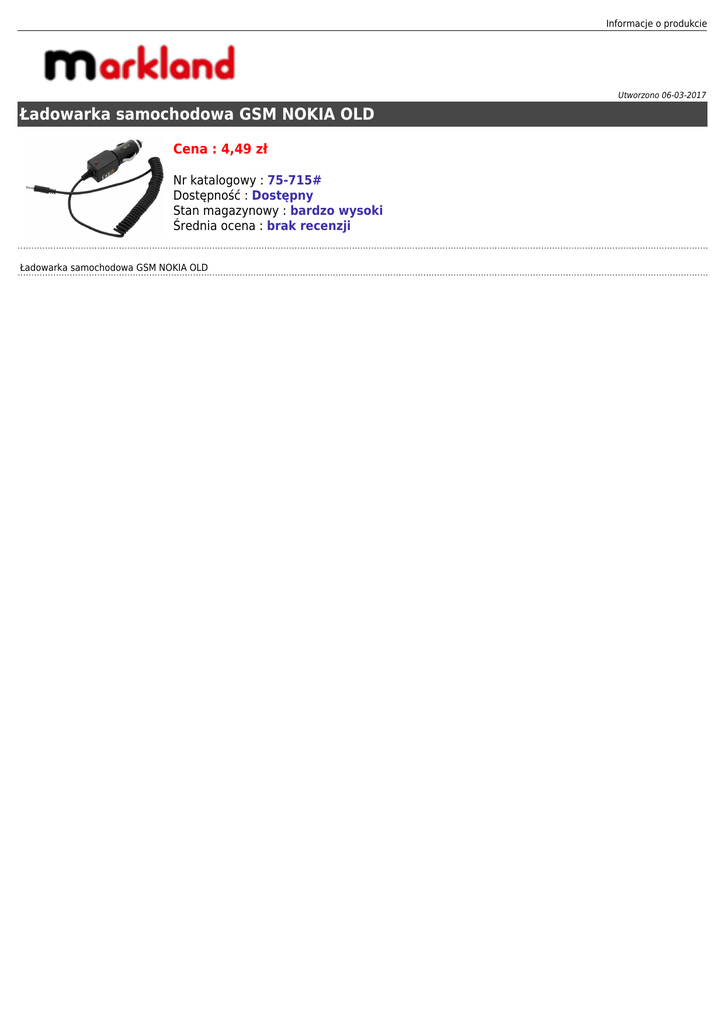 Informacje o produkcie Utworzono 06-03-2017 Ładowarka samochodowa GSM NOKIA OLD Cena : 4,49 zł Nr katalogowy : 75-715# Dostępność : Dostępny Stan magazynowy : bardzo wysoki Średnia ocena : brak recenzji Ładowarka samochodowa GSM NOKIA OLD
