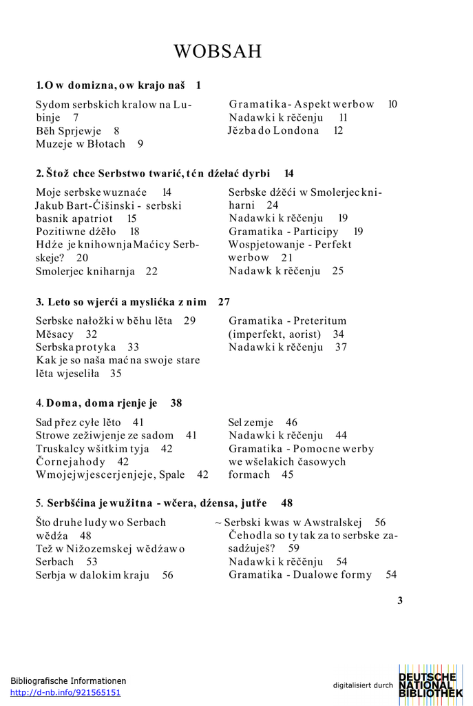 WOBSAH 1. O w domizna, o w krajo naš 1 Sydom serbskich kralow na L u binje 7 Bĕh Sprjewje 8 Muzeje w Błotach 9 G r a m a t i k a - Aspekt werbow Nadawki k rĕčenju 11 Jĕzba d o Londona 12 2. Štož chce Serbstwo twarić, t ć n dźełać dyrbi Moje serbske wuznaće 14 Jakub Bart-Ćišinski - serbski basnik a patriot 15 Pozitiwne dźĕło 18 Hdźe je knihownja Maćicy Serbskeje? 20 Smolerjec kniharnja 22 3. Leto so wjerći a myslićka z nim Serbske nałožki w bĕhu lĕta 29 Mĕsacy 32 Serbska protyka 33 Kak je so naša mać na swoje stare lĕta wjeseliła 35 4. Doma, doma rjenje je 10 14 Serbske dźĕći w Smolerjec kniharni 24 Nadawki k rĕčenju 19 Gramatika - Participy 19 Wospjetowanje - Perfekt werbow 21 N a d a w k k rĕčenju 25 27 Gramatika - Preteritum (imperfekt, aorist) 34 Nadawki k rĕčenju 37 38 Sad přez cyłe lĕto 41 Strowe zežiwjenje ze sadom 41 Truskalcy wšitkim tyja 42 Čornejahody 42 Wmojejwjescerjenjeje, Spale 42 Sel zemje 46 Nadawki k rĕčenju 44 Gramatika - Pomocne werby we wšelakich časowych formach 45 5. Serbšćina je wužitna - wčera, dźensa, jutře Što druhe ludy wo Serbach wĕdźa 48 Tež w Nižozemskej wĕdźa w o Serbach 53 Serbja w dalokim kraju 56 48 ~ Serbski kwas w Awstralskej 56 Čehodla so t y tak za to serbske zasadźuješ? 59 Nadawki k rĕčĕnju 54 Gramatika - Dualowe formy 54 3 http://d-nb.info/921565151 6. Za swoj lud a l$raj 61 Ze stawiznow Serbskeho doma 62 Prĕnja serbska wučerka 66 Wospjetowanje-Werbypohiba 7. Žiwjenje m y će lubujemy 62 71 Wospjetowanje - Prefigowanje a sufigowanje werbow 71 Vineta 74 Mysle k hrĕ „Vineta" w inscenaciji N S L D ź 75 8. Přez letstotki 9. Serbja so rady schadźuja Kelko rĕčow so rĕči na swĕće? Wospjetowanje leksiki 81 Gramatika - Prepozicije, kiž žadaja akuzatiw abo instrumental 88 Nadawki k rĕčenju 89 94 Pod Kulowom we holi (spĕw) 94 N a zdar, serbscy Sokoljo! 95 Lipsčanska „Sorabija" 97 Dźiwadło - Sebske lajske dźiwadło 98 Wosomnate narodniny 100 Towarstwo přećelow Lužicy w Pćlskej 101 Gramatika - Substantiwy p o deklinaciji adjektiwow 96 Nadawk k rĕčenju 101 103 Rjana Lužica (hymna) 103 Budyšin - Bautzen 104 Budyska křiwa wĕža 106 Č o r n o b o h 107 H o b e r Sprjewnik 109 Mikławš Jakubica wojuje w o w u daće prĕnjeje serbskeje knihi 110 Słowničk po lekcijach 4 Gramatika — Deklinacija substantiw o w 75 Nadawki k rĕčenju 78 Překwapjenka 79 81 Ludowa literatura 82 Přistowa 82 Serbski ludowy spĕw 84 Krabat 86 Moje serbske wuznaće 90 Najwjetši pokład delnjoserbskeje rĕče 91 10. Rjana Łužica Gramatika-Deklinacijasubstantiw o w 67 Mnohostronska p o m o c 68 Nadawk k rĕčenju 68 113 Serbska mĕrowa kantata 112 Gramatika - Deklinacija substantiwow 107 Nadawki k rĕčenju 108 92