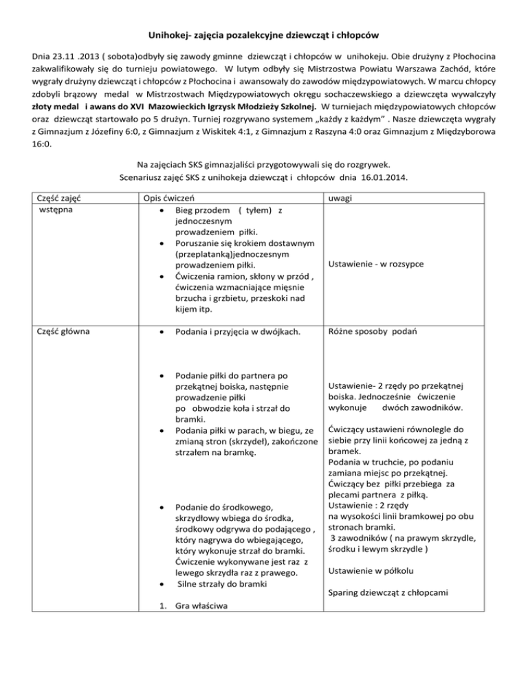 Unihokej- zajęcia pozalekcyjne dziewcząt i chłopców Dnia 23.11 .2013 ( sobota)odbyły się zawody gminne dziewcząt i chłopców w unihokeju. Obie drużyny z Płochocina zakwalifikowały się do turnieju powiatowego. W lutym odbyły się Mistrzostwa Powiatu Warszawa Zachód, które wygrały drużyny dziewcząt i chłopców z Płochocina i awansowały do zawodów międzypowiatowych. W marcu chłopcy zdobyli brązowy medal w Mistrzostwach Międzypowiatowych okręgu sochaczewskiego a dziewczęta wywalczyły złoty medal i awans do XVI Mazowieckich Igrzysk Młodzieży Szkolnej. W turniejach międzypowiatowych chłopców oraz dziewcząt startowało po 5 drużyn. Turniej rozgrywano systemem „każdy z każdym” . Nasze dziewczęta wygrały z Gimnazjum z Józefiny 6:0, z Gimnazjum z Wiskitek 4:1, z Gimnazjum z Raszyna 4:0 oraz Gimnazjum z Międzyborowa 16:0. Na zajęciach SKS gimnazjaliści przygotowywali się do rozgrywek. Scenariusz zajęć SKS z unihokeja dziewcząt i chłopców dnia 16.01.2014. Część zajęć wstępna Część główna Opis ćwiczeń Bieg przodem ( tyłem) z jednoczesnym prowadzeniem piłki. Poruszanie się krokiem dostawnym (przeplatanką)jednoczesnym prowadzeniem piłki. Ćwiczenia ramion, skłony w przód , ćwiczenia wzmacniające mięsnie brzucha i grzbietu, przeskoki nad kijem itp. Podania i przyjęcia w dwójkach. Podanie piłki do partnera po przekątnej boiska, następnie prowadzenie piłki po obwodzie koła i strzał do bramki. Podania piłki w parach, w biegu, ze zmianą stron (skrzydeł), zakończone strzałem na bramkę. Podanie do środkowego, skrzydłowy wbiega do środka, środkowy odgrywa do podającego , który nagrywa do wbiegającego, który wykonuje strzał do bramki. Ćwiczenie wykonywane jest raz z lewego skrzydła raz z prawego. Silne strzały do bramki 1. Gra właściwa uwagi Ustawienie - w rozsypce Różne sposoby podań Ustawienie- 2 rzędy po przekątnej boiska. Jednocześnie ćwiczenie wykonuje dwóch zawodników. Ćwiczący ustawieni równolegle do siebie przy linii końcowej za jedną z bramek. Podania w truchcie, po podaniu zamiana miejsc po przekątnej. Ćwiczący bez piłki przebiega za plecami partnera z piłką. Ustawienie : 2 rzędy na wysokości linii bramkowej po obu stronach bramki. 3 zawodników ( na prawym skrzydle, środku i lewym skrzydle ) Ustawienie w półkolu Sparing dziewcząt z chłopcami