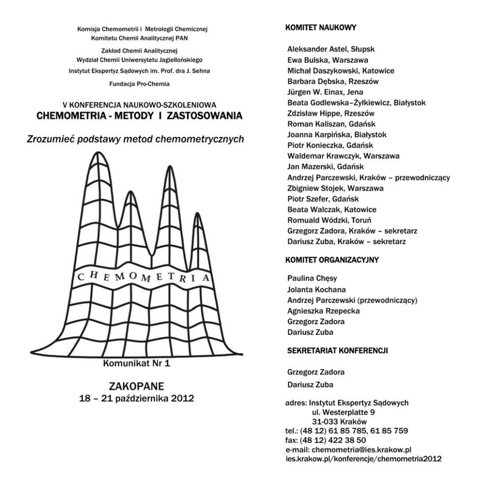 Komisja Chemometrii i Metrologii Chemicznej Komitetu Chemii Analitycznej PAN Zakład Chemii Analitycznej Wydział Chemii Uniwersytetu Jagiellońskiego Instytut Ekspertyz Sądowych im. Prof. dra J. Sehna Fundacja Pro-Chemia V KONFERENCJA NAUKOWO-SZKOLENIOWA CHEMOMETRIA - METODY I ZASTOSOWANIA Zrozumieć podstawy metod chemometrycznych KOMITET NAUKOWY Aleksander Astel, Słupsk Ewa Bulska, Warszawa Michał Daszykowski, Katowice Barbara Dębska, Rzeszów Jürgen W. Einax, Jena Beata Godlewska–Żyłkiewicz, Białystok Zdzisław Hippe, Rzeszów Roman Kaliszan, Gdańsk Joanna Karpińska, Białystok Piotr Konieczka, Gdańsk Waldemar Krawczyk, Warszawa Jan Mazerski, Gdańsk Andrzej Parczewski, Kraków – przewodniczący Zbigniew Stojek, Warszawa Piotr Szefer, Gdańsk Beata Walczak, Katowice Romuald Wódzki, Toruń Grzegorz Zadora, Kraków – sekretarz Dariusz Zuba, Kraków – sekretarz KOMITET ORGANIZACYJNY Paulina Chęsy Jolanta Kochana Andrzej Parczewski (przewodniczący) Agnieszka Rzepecka Grzegorz Zadora Dariusz Zuba SEKRETARIAT KONFERENCJI Komunikat Nr 1 ZAKOPANE 18 – 21 października 2012 Grzegorz Zadora Dariusz Zuba adres: Instytut Ekspertyz Sądowych ul. Westerplatte 9 31-033 Kraków tel.: (48 12) 61 85 785, 61 85 759 fax: (48 12) 422 38 50 e-mail: [email protected] ies.krakow.pl/konferencje/chemometria2012 KONCEPCJA KONFERENCJI TERMINY W każdym roboczym dniu (piątek i sobota) konferencji wygłoszone zostaną po dwa plenarne wykłady, które przedstawią zaproszeni wykładowcy. Istotnymi w programie każdego roboczego dnia konferencji będą wyjaśnienia problemów, wcześniej zgłoszonych przez osoby zainteresowane uczestnictwem w konferencji, dotyczących podstaw i warunków prawidłowego stosowania metod chemometrycznych. Odpowiedzi na zgłoszone pytania zostaną przedstawione przez specjalistów w zakresie chemometrii. W tej części programu konferencji przewidziana jest również otwarta dyskusja uczestników oraz odpowiedzi na pytania zadawane „na gorąco”. Już teraz gorąco zachęcamy potencjalnych uczestników konferencji do przesyłania, na podany niżej adres e-mailowy, wątpliwości dotyczących założeń i stosowalności metod chemometrycznych, a także problemów, na jakie natknęli się przy planowaniu doświadczeń oraz statystycznym i chemometrycznym opracowywaniu wyników pomiarów. Nadesłane uwagi zostaną opracowane przez organizatorów konferencji i przekazane specjalistom do wyjaśnienia podczas chemometrycznego spotkania w Zakopanem. Przy tym zachowana będzie anonimowość autorów nadesłanych zapytań i uwag. Ponadto uczestnicy konferencji będą mieli możliwość przedstawienia wyników swoich prac w formie komunikatów ustnych (przewidywany czas - 20 min, w tym krótka dyskusja) oraz posterów. Jednostronicowe streszczenia zaakceptowanych komunikatów i posterów zostaną zamieszczone w materiałach konferencyjnych (pod warunkiem opłacenia przez autorów opłaty konferencyjnej). Ponadto, organizatorzy konferencji zamierzają wydać materiały pokonferencyjne w formie książki zawierającej poszerzone streszczenia prezentacji (do 6 stron), po ich zakwalifikowaniu przez recenzentów. Wstępne zgłoszenie udziału w konferencji: do 29.02.2012 Streszczenia prezentacji (do oceny): do 30.05.2012 Zgłaszanie pytań i problemów związanych z podstawami metod chemometrycznych: do 30.05.2012 Informacja o akceptacji prezentacji i jej formy: do dnia 15.06.2012 Termin płatności wpisowego: do 15.07.2012 (uwaga: warunkiem zamieszczenia streszczenia w materiałach jest terminowe uiszczenie opłaty konferencyjnej). ZGŁOSZENIA Osoby zainteresowane udziałem w konferencji są proszone o wypełnienie formularza zamieszczonego na stronie internetowej konferencji, która aktywna będzie od 16.01.2012: ies.krakow.pl/konferencje/chemometria2012 Uwaga: liczba uczestników konferencji jest ograniczona. OPŁATY Opłata konferencyjna (wpisowe): Pełne uczestnictwo – 450 zł Studenci i doktoranci – 250 zł Osoby towarzyszące – 200 zł Obsługę finansową konferencji będzie prowadzić Fundacja PRO CHEMIA: ul. Ingardena 3, 30-060 Kraków; tel. 012 663 22 06, 012 663 29 11; fax 012 663 22 06. Opłaty konferencyjne należy wpłacać na konto Fundacji: 54 1680 1062 0000 3000 0090 0881, z dopiskiem „Chemometria 2012”. Opłata powyższa obejmuje, w przypadku uczestników konferencji – udział w zajęciach i dyskusjach merytorycznych, materiały konferencyjne w tym streszczenia komunikatów i posterów, przerwy kawowe i uczestnictwo w dwóch spotkaniach towarzyskich oraz wycieczce do Doliny Strążyckiej; w przypadku osób towarzyszących – uczestnictwo w spotkaniach towarzyskich oraz wycieczce do Doliny Strążyckiej. Uczestnicy konferencji rezerwują hotel i wyżywienie we własnym zakresie. Informacje o miejscu konferencji oraz wskazówki dotyczące zakwaterowania (do ewentualnego wykorzystania) zostaną podane w komunikacie nr 2, który zostanie rozesłany przed 31.03.2012 oraz umieszczony na stronie internetowej konferencji.