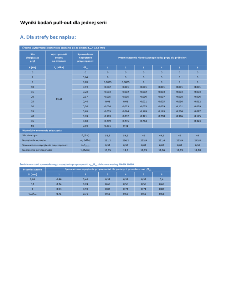 Wyniki badań pull-out dla jednej serii A. Dla strefy bez napisu: Średnia wytrzymałość betonu na ściskanie po 28 dniach: f cm = 13,4 MPa Siła obciążająca pręt Wytrzymałość betonu na ściskanie Sprowadzone naprężenie przyczepności F [kN] fc [MPa] τ/fcm 1 2 3 4 5 6 0 0 0 0 0 0 0 0 2 0,04 0 0 0 0 0 0 Przemieszczenia nieobciążonego końca pręta dla próbki nr: 5 0,09 0,0005 0,0005 0 0 0 0 10 0,19 0,002 0,001 0,001 0,001 0,001 0,001 15 0,28 0,003 0,002 0,002 0,003 0,003 0,003 20 0,37 0,005 0,005 0,006 0,007 0,008 0,006 13,41 25 0,46 0,01 0,01 0,021 0,025 0,036 0,012 30 0,56 0,024 0,023 0,075 0,079 0,101 0,039 35 0,65 0,055 0,064 0,169 0,163 0,206 0,087 40 0,74 0,103 0,032 0,321 0,298 0,386 0,175 45 0,83 0,249 0,235 0,784 50 0,93 0,291 0,41 Fn [kN] 52,5 53,5 45 44,5 45 49 0,323 Wartości w momencie zniszczenia: Siła niszcząca σn [MPa] 261,2 266,2 223,9 221,4 223,9 243,8 Sprowadzone naprężenie przyczepności (τ/f cm)n 0,97 0,99 0,83 0,83 0,83 0,91 Naprężenie przyczepności τn [Mpa] 13,05 13,3 11,19 11,06 11,19 12,18 Naprężenie w pręcie Średnie wartości sprowadzonego naprężenia przyczepności τ bm/fcm obliczone według PN-EN 10080 Sprowadzone naprężenie przyczepności dla podanych przemieszczeń τ/f cm Przemieszczenie Δl [mm] 1 2 3 4 5 6 0,01 0,46 0,46 0,37 0,37 0,37 0,4 0,1 0,74 0,74 0,65 0,56 0,56 0,65 1 0,93 0,93 0,83 0,74 0,74 0,83 τbm/fcm 0,71 0,71 0,62 0,56 0,56 0,63 Wyniki badań pull-out dla jednej serii B. Dla strefy z napisem: Średnia wytrzymałość betonu na ściskanie po 28 dniach: f cm = 13,4 MPa Siła obciążająca pręt Wytrzymałość betonu na ściskanie Sprowadzone naprężenie przyczepności F [kN] fc [MPa] τ/fcm 1 2 3 4 5 6 0 0 0 0 0 0 0 0 2 0,04 0 0 0 0 0 0 Przemieszczenia nieobciążonego końca pręta dla próbki nr: 5 0,09 0 0 0 0 0 0 10 0,19 0,001 0 0,001 0,001 0,001 0 15 0,28 0,002 0,002 0,003 0,002 0,003 0,002 20 0,37 0,005 0,005 0,007 0,005 0,007 0,004 25 0,46 0,011 0,013 0,019 0,013 0,037 0,01 30 0,56 0,034 0,059 0,076 0,051 0,088 0,026 35 0,65 0,096 0,178 0,194 0,098 0,17 0,066 40 0,74 0,193 0,503 0,496 0,215 0,323 0,133 45 0,83 0,363 0,698 0,678 50 0,93 13,41 0,353 0,628 Wartości w momencie zniszczenia: Siła niszcząca Fn [kN] 50 41 41,5 45 47 53 σn [MPa] 248,8 204 206,5 223,9 233,9 263,7 Sprowadzone naprężenie przyczepności (τ/f cm)n 0,93 0,76 0,77 0,83 0,87 0,98 Naprężenie przyczepności τn [Mpa] 12,43 10,19 10,32 11,19 11,69 13,18 Naprężenie w pręcie Średnie wartości sprowadzonego naprężenia przyczepności τ bm/fcm obliczone według PN-EN 10080 Sprowadzone naprężenie przyczepności dla podanych przemieszczeń τ/f cm Przemieszczenie Δl [mm] 1 2 3 4 5 6 0,32 0,01 0,46 0,4 0,4 0,4 0,4 0,1 0,65 0,6 0,58 0,65 0,56 0,7 1 0,83 0,74 0,74 0,83 0,83 0,93 τbm/fcm 0,65 0,58 0,57 0,63 0,6 0,65