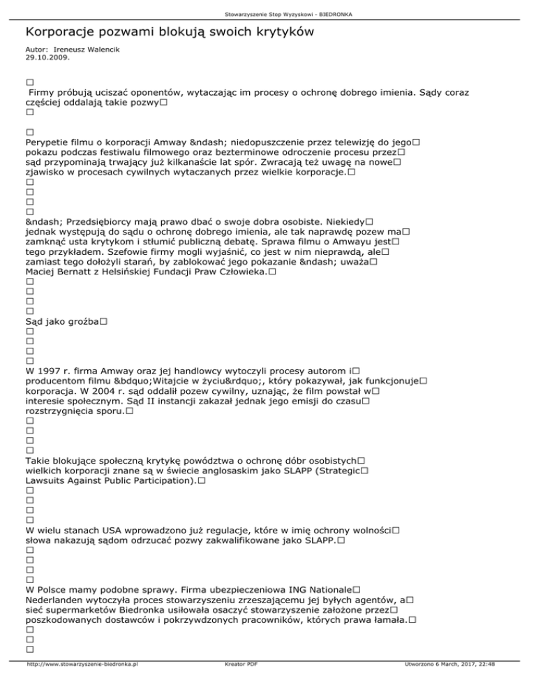 Stowarzyszenie Stop Wyzyskowi - BIEDRONKA Korporacje pozwami blokują swoich krytyków Autor: Ireneusz Walencik 29.10.2009. Firmy próbują uciszać oponentów, wytaczając im procesy o ochronę dobrego imienia. Sądy coraz częściej oddalają takie pozwy Perypetie filmu o korporacji Amway – niedopuszczenie przez telewizję do jego pokazu podczas festiwalu filmowego oraz bezterminowe odroczenie procesu przez sąd przypominają trwający już kilkanaście lat spór. Zwracają też uwagę na nowe zjawisko w procesach cywilnych wytaczanych przez wielkie korporacje. – Przedsiębiorcy mają prawo dbać o swoje dobra osobiste. Niekiedy jednak występują do sądu o ochronę dobrego imienia, ale tak naprawdę pozew ma zamknąć usta krytykom i stłumić publiczną debatę. Sprawa filmu o Amwayu jest tego przykładem. Szefowie firmy mogli wyjaśnić, co jest w nim nieprawdą, ale zamiast tego dołożyli starań, by zablokować jego pokazanie – uważa Maciej Bernatt z Helsińskiej Fundacji Praw Człowieka. Sąd jako groźba W 1997 r. firma Amway oraz jej handlowcy wytoczyli procesy autorom i producentom filmu „Witajcie w życiu”, który pokazywał, jak funkcjonuje korporacja. W 2004 r. sąd oddalił pozew cywilny, uznając, że film powstał w interesie społecznym. Sąd II instancji zakazał jednak jego emisji do czasu rozstrzygnięcia sporu. Takie blokujące społeczną krytykę powództwa o ochronę dóbr osobistych wielkich korporacji znane są w świecie anglosaskim jako SLAPP (Strategic Lawsuits Against Public Participation). W wielu stanach USA wprowadzono już regulacje, które w imię ochrony wolności słowa nakazują sądom odrzucać pozwy zakwalifikowane jako SLAPP. W Polsce mamy podobne sprawy. Firma ubezpieczeniowa ING Nationale Nederlanden wytoczyła proces stowarzyszeniu zrzeszającemu jej byłych agentów, a sieć supermarketów Biedronka usiłowała osaczyć stowarzyszenie założone przez poszkodowanych dostawców i pokrzywdzonych pracowników, których prawa łamała. http://www.stowarzyszenie-biedronka.pl Kreator PDF Utworzono 6 March, 2017, 22:48 Stowarzyszenie Stop Wyzyskowi - BIEDRONKA – Sądy dostrzegły prawdziwy cel tych powództw – mówi radca prawny Lech Obara, pełnomocnik stowarzyszenia. Według Macieja Bernatta, znawcy zagadnienia, firmy kierują je przeciw krytykującej je osobie lub organizacji, żeby podważyć jej wiarygodność. Twierdzenie o naruszeniu prawa służy zaś odwróceniu uwagi od zarzutów kierowanych pod adresem korporacji. Zamiast publicznej debaty jest proces sądowy, który ze względu na żądania finansowe może mieć także charakter odwetowy czy represyjny. Chodzi w tym o zastraszenie lub zniechęcenie do krytyki, do wypowiadania się w mediach. Dobre imię złoczyńcy Coraz częstsze są orzeczenia oddalające takie pozwy. Sąd Apelacyjny w Łodzi ocenił, iż firma ING Nationale Nederlanden dopuściła się – sprzecznego z zasadami współżycia społecznego – nadużycia prawa podmiotowego. Występując o zakaz rozpowszechniania informacji przez jakoby naruszających jej dobre imię, chciała bowiem uniemożliwić stowarzyszeniu przedstawianie krytycznej oceny jej postępowania. Z kolei w jednej z kilku spraw z powództwa Biedronki (wszystkie przegrała) Sąd Apelacyjny w Lublinie stwierdził w styczniu 2009 r., że sieć nie może domagać się ochrony swoich dóbr osobistych, jeżeli – wykorzystując pracowników i kontrahentów, co sąd nazwał „niecnym postępowaniem” – sama narusza zasady współżycia społecznego. Uznał, że celem powództwa nie było uzyskanie ochrony sądowej, lecz powstrzymanie niewygodnej aktywności stowarzyszenia: krytyki i nagłaśniania negatywnych aspektów działalności firmy. Komentuje Bartosz Krużewski, adwokat w kancelarii Clifford Chance Nie zgadzam się z tezą, że zamożne korporacje, wykorzystując łatwiejszy dostęp do dobrych prawników, dławią debatę, ponieważ pracowników czy stowarzyszeń nie stać na odpowiednią obronę. Korporacje korzystają ze swoich dobrych praw. Rozwiązaniem nie jest poszukiwanie procesowych czy materialnoprawnych ograniczeń powództw o ochronę dóbr osobistych (np. poprzez jakieś nadzwyczajne wykorzystywanie zasady nadużycia prawa), ale stworzenie systemu pomocy prawnej, który zniweluje różnice w dostępie do adwokatów. Robi http://www.stowarzyszenie-biedronka.pl Kreator PDF Utworzono 6 March, 2017, 22:48 Stowarzyszenie Stop Wyzyskowi - BIEDRONKA to z powodzeniem Helsińska Fundacja Praw Człowieka w Programie Spraw Precedensowych. Mam nadzieję, że tak jak np. w Stanach Zjednoczonych będą powstawały kolejne organizacje zainteresowane wspieraniem merytorycznym i finansowym tzw. sporów (z ich punktu widzenia) strategicznych. http://www.stowarzyszenie-biedronka.pl Kreator PDF Utworzono 6 March, 2017, 22:48