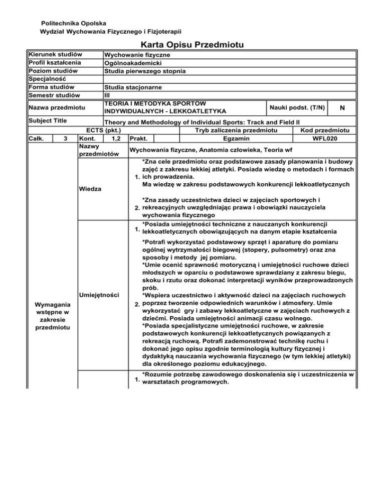 Politechnika Opolska Wydział Wychowania Fizycznego i Fizjoterapii Karta Opisu Przedmiotu Kierunek studiów Profil kształcenia Poziom studiów Specjalność Forma studiów Semestr studiów Nazwa przedmiotu Subject Title Całk. 3 Wychowanie fizyczne Ogólnoakademicki Studia pierwszego stopnia Studia stacjonarne III TEORIA I METODYKA SPORTÓW INDYWIDUALNYCH - LEKKOATLETYKA Nauki podst. (T/N) N Theory and Methodology of Individual Sports: Track and Field II ECTS (pkt.) Tryb zaliczenia przedmiotu Kod przedmiotu Kont. 1,2 Prakt. Egzamin WFL020 Nazwy Wychowania fizyczne, Anatomia człowieka, Teoria wf przedmiotów *Zna cele przedmiotu oraz podstawowe zasady planowania i budowy zajęć z zakresu lekkiej atletyki. Posiada wiedzę o metodach i formach 1. ich prowadzenia. Ma wiedzę w zakresu podstawowych konkurencji lekkoatletycznych Wiedza *Zna zasady uczestnictwa dzieci w zajęciach sportowych i 2. rekreacyjnych uwzględniając prawa i obowiązki nauczyciela wychowania fizycznego 3. *Posiada umiejętności techniczne z nauczanych konkurencji 1. lekkoatletycznych obowiązujących na danym etapie kształcenia Umiejętności Wymagania wstępne w zakresie przedmiotu *Potrafi wykorzystać podstawowy sprzęt i aparaturę do pomiaru ogólnej wytrzymałości biegowej (stopery, pulsometry) oraz zna sposoby i metody jej pomiaru. *Umie ocenić sprawność motoryczną i umiejętności ruchowe dzieci młodszych w oparciu o podstawowe sprawdziany z zakresu biegu, skoku i rzutu oraz dokonać interpretacji wyników przeprowadzonych prób. *Wspiera uczestnictwo i aktywność dzieci na zajęciach ruchowych 2. poprzez tworzenie odpowiednich warunków i atmosfery. Umie wykorzystać gry i zabawy lekkoatletyczne w zajęciach ruchowych z dziećmi. Posiada umiejętności animacji czasu wolnego. *Posiada specjalistyczne umiejętności ruchowe, w zakresie podstawowych konkurencji lekkoatletycznych powiązanych z rekreacją ruchową. Potrafi zademonstrować technikę ruchu i dokonać jego opisu zgodnie terminologią kultury fizycznej i dydaktyką nauczania wychowania fizycznego (w tym lekkiej atletyki) dla określonego poziomu edukacyjnego. *Rozumie potrzebę zawodowego doskonalenia się i uczestniczenia w 1. warsztatach programowych. Kompetencje społeczne Kompetencje społeczne *Ma świadomość konieczności prowadzenia zindywidualizowanych działań dydaktycznych i wychowawczych w stosunku do uczniów ze specjalnymi uzdolnieniami w kierunku lekkiej atletykiZna podstawowe przepisy BHP obowiązujące na zajęciach ruchowych. *Jest odpowiedzialny za uczestników zajęć dydaktycznych. Wykazuje troskę o bazę dydaktyczną i powierzony sprzęt. Jest świadomy 2. znaczenia systematycznego przeglądu technicznego urządzeń i sprzętu dydaktycznego. *Aktywnie uczestniczy w różnych formach aktywności fizycznej. Jest świadomy znaczenia doskonalenia sprawności fizycznej i umiejętności ruchowych oraz samokreacji w zakresie kształcenia i rozwoju pożądanych postaw zdrowego stylu życia. … Forma zajęć Seminarium Program przedmiotu L. godz. zajęć w sem. Prowadzący zajęcia Całkowita Kontaktowa (tytuł/stopień naukowy, imię i nazwisko) hab. Ivan Cillik, dr hab. Rafał Tataruch 65 30TreściProf.dr | kształcenia Sposób realizacji Zajęcia praktyczne na stadionie i bieżni lekkoatletycz. Tematyka zajęć Liczba godzin Metodyka nauczania startu niskiego i biegów krótkich. Ćwiczenia przygotowawcze 2 i oswajające. Ćwiczenia metodycznego nauczania. Ćwiczenia specjalne. Metody i formy nauczania konkurencji. Gry i zabawy w nauczaniu konkurencji. Zajęcia przygotowane i prowadzone przez studentów. Seminarium Lp. 1. Metodyka nauczania biegu przez płotki (z wykorzestaniem róznego rodzaju przeszkód). Ćwiczenia przygotowawcze i oswajające. Ćwiczenia metodycznego nauczania. Ćwiczenia specjalne. Metody i formy nauczania konkurencji. Gry i zabawy w nauczaniu konkurencji. Zajęcia przygotowane i prowadzone przez studentów. Metodyka nauczania biegów sztafetowych (przekazywanie pałeczki sztafetowej w różnymi sposobami). Ćwiczenia przygotowawcze i oswajające. Ćwiczenia metodycznego nauczania. Ćwiczenia specjalne. Metody i formy nauczania konkurencji. Gry i zabawy w nauczaniu konkurencji. Zajęcia przygotowane i prowadzone przez studentów. 2 Metodyka nauczania skoku w dal techniką naturalną (ze strefy i miejsca odbicia). Ćwiczenia przygotowawcze i oswajające poszczególnych faz skoku. Ćwiczenia metodycznego nauczania. Ćwiczenia specjalne. Metody i formy nauczania konkurencji. Gry i zabawy w nauczaniu konkurencji. Zajęcia przygotowane i prowadzone przez studentów. Metodyka nauczania rzutu piłeczką palantową. Ćwiczenia przygotowawcze i oswajające. Ćwiczenia metodycznego nauczania. Ćwiczenia specjalne. Metody i formy nauczania konkurencji. Gry i zabawy w nauczaniu konkurencji. Zajęcia przygotowane i prowadzone przez studentów. 2 Organizacja wewnątrzgrupowych „mini zawodów” (4-bój lekkoatletyczny) Zadania sędziego lekkoatletycznego i organizatora zawodów Mini „wielobój” LA. Zawody zaplanowane, przygotowane i prowadzone przez studentów. Gry zabawy w nauczaniu konkurencji lekkoatletycznych. Zabawy biegowoszybkościowe i skocznościowe. Zajęcia przygotowane i prowadzone przez studentów. 2 2 8. Metodyka nauczania skoku wzwyż techniką naturalną. Ćwiczenia przygotowawcze i oswajające . Ćwiczenia metodycznego nauczania poszczególnych faz skoku. Ćwiczenia specjalne. Metody i formy nauczania konkurencji. Gry i zabawy w nauczaniu konkurencji. Zajęcia przygotowane i prowadzone przez studentów. 9. Atletyka terenowa jako jednostka treningowa wytrzymałości biegowej. Zajęcia terenowe. Jednostka lekcyjna obejmująca chody, biegi, rzuty i skoki. Zajęcia przygotowane i prowadzone przez studentów. 2. 3. 4. 5. 6. 7. 2 2 8 10. Gry zabawy lekkoatletyczne. Zabawy biegowo-wytrzymałościowe i siłowo- rzutne. Zajęcia przygotowane i prowadzone przez studentów. L. godz. pracy własnej s