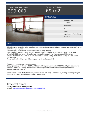 Szczecin, Bolinko LOKAL na SPRZEDAŻ 69 m2 299 000 PMR24239 299 000 PLN 4 333 PLN Secondary 4 1970 ApartmentOfficeBuilding Services 2 Opis Oferujemy na sprzedaż lokal położony na parterze budynku .Składa się z dwóch pomieszczeń, WC , dodatkowego wyjścia . Duże witryny, przez wiele lat funkcjonował tu sklep mięsny . Ogrzewanie miejskie , ciepła woda z bojlera .Prąd -do zawarcia umowa o przesył , gazu brak . Wysokość 350 cm, ściany do odświeżenia, częściowo pokryte glazurą, posadzki terakota . Czynsz do spółdzielni - 400 zł, w nim zaliczka na zimną wodę .Dodatkowe opłaty to prąd, woda i ogrzewanie . Przez wiele lat w lokalu był sklep mięsny , brak konkurencji!!!! Polecamy i zapraszamy na prezentację . Zapytaj naszego maklera o BEZPŁATNE doradztwo przy uzyskaniu KREDYTU. Współpracujemy z wieloma bankami i mamy doświadczenie w przeprowadzaniu transakcji z uwzględnieniem warunków kredytowych. Dane nie stanowią oferty handlowej w rozumieniu art. 66,§ 1 Kodeksu Cywilnego. Szczegółowych informacji udziela Biuro Nieruchomości Pomerania . Krzysztof Swora tel. 695323343; 914894242 email: [email protected] Pomerania Nieruchomości Powered by TCPDF (www.tcpdf.org)