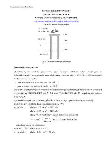 Fundamentowanie (P.Srokosz) ĆWICZENIE PROJEKTOWE NR 4 „POSADOWIENIE NA PALACH” Wybrane schematy i tablice z PN-83/B-02482 : http://www.uwm.edu.pl/edu/piotrsrokosz/mg2.htm UWAGA! Rysunki nie są w skali!!! Nr = 900 kN Mr = 500 kNm 0.0m G, IL=0.3 3.0m T 5.5m Po, ID=0.7 Rys.1. Założenia zadania projektowego. 1. Parametry geotechniczne Charakterystyczne wartości parametrów geotechnicznych ustalono metodą korelacyjną na podstawie rodzaju i stanu gruntów oraz tabel zawartych w normie PN-83/B-02482 „Nośność pali i fundamentów palowych”: opór graniczny pod podstawą pala : pn.tab.1, opór graniczny na pobocznicy pala : pn.tab.2. Wartości charakterystyczne i obliczeniowe parametrów geotechnicznych zestawiono w tabeli nr 1 przyjmując wg PN-83/B-02482, pkt.2.2.2.1. oraz PN-81/B-03020, pkt.3.2. współczynnik materiałowy m=0.9. – jednostkowy opór pod podstawą (tylko dla warstw leżących poniżej warstwy nienośnej) grunt w nośnym podłożu: Pospółka, stan gruntu: ID = 0.7 wg pn.tab.1. : dla ID = 1.00 q(n) = 7750 kPa dla ID = 0.67 q(n) = 5100 kPa dla ID = 0.70 wartość q(n) należy liniowo interpolować: q n 5100 7750 5100 0.70 0.67 5340.9 kPa 1.00 0.67 – jednostkowy opór na pobocznicy grunt nr 1: Glina, stan gruntu: IL = 0.3 wg pn.tab.2. : dla IL = 0.00 t(n) = 50 kPa Fundamentowanie (P.Srokosz) dla IL = 0.50 t(n) = 31 kPa dla IL = 0.30 wartość t(n) należy liniowo interpolować: 50 31 0.30 0.50 38.6 kPa 0.00 0.50 t n 31 grunt nr 2: Torf, t(n) = 0.0 kPa grunt nr 3: Pospółka, stan gruntu: ID = 0.7 wg pn.tab.2. : dla ID = 1.00 t(n) = 165 kPa dla ID = 0.67 t(n) = 110 kPa dla ID = 0.70 wartość t(n) należy liniowo interpolować: t n 110 165 110 0.70 0.67 115.0 kPa 1.00 0.67 Tab.1. Parametry geotechniczne Rodzaj gruntu Stan Przelot [m] q(n)[kPa] t(n)[kPa] m q(r)[kPa] t(r)[kPa] G IL=0.3 0.03.0 - 38.6 0.9 - 34.7 T - 3.05.5 - 0 - - 0 Po ID=0.7 5.520.0 5340.9 115.0 0.9 4806.8 103.5 2. Założenia obliczeniowe. Zebranie obciążeń. 2.1. Schemat fundamentu Przyjęto płytowo-palowy fundament z oczepem o wysokości 0.6m i wymiarach w rzucie jak na rys.2. Obciążenia zostaną przeniesione na nośne podłoże za pomocą trzech pionowych pali wierconych z betonu zbrojonego, o średnicy 0.5m i długości 8m. Założono, że pale zostaną zagłębione w drugiej warstwie nośnej na długości: 8.0 – 5.5 = 2.5m. 0.75m 1.0m 4.6m 6.6m Rys.2. Przyjęte wymiary oczepu (plan trójkąta równobocznego). Fundamentowanie (P.Srokosz) 2.2. Obciążenia osiowe pali Charakterystyczne wartości sił pionowych w oparciu o średnie ciężary objętościowe materiałów oraz ich objętości zestawiono w tab.2. Do wyznaczenia wartości obciążeń obliczeniowych zastosowano współczynniki wg PN-82/B-02001 „Obciążenia budowli obciążenia stałe”. Tab.2. Obciążenia objętościowe Obciążenie Materiał [kN/m3] PN-82/B-02001 V [m3] ciężar oczepu G1 Beton na kruszywie kamiennym, zbrojony, zagęszczony 25.0 Tab. Z1.6, pkt.13 – 30.511sin(60)) = 14.05 ciężar pala G2 Gn [kN] 0.8(0.56.66.6sin(60) + 0.52/48.0 = 1.57 f [-] 351.25 Gr [kN] 386.38 1.1 39.25 43.18 Y R=3.81m Pal nr 1 y1=2.19m x2=1.90m X y2=-1.10m Pal nr 2 Pal nr 3 Rys.3. Współrzędne położenia środków ciężkości przekrojów pali. Założono, że fundament zostanie umiejscowiony w taki sposób, aby moment skupiony i siła pionowa działały w środku geometrycznym oczepu (całego układu). Środek geometryczny pokrywa się ze środkiem okręgu opisującego trójkąt równoboczny, na planie którego wycięto kształt oczepu. R 6.6 3.81 m 2 sin 60 Maksymalna siła w palu (pal nr 1): Qr max N r Gr1 M y 900 386.38 500 2.19 Gr 2 r 12 43.18 613.72 kN 2 2 2 n 3 2.19 1.1 1.1 yi n Minimalna siła w palu (pale nr 2 i 3): Qr min N r Gr 1 M y 900 386.38 500 1.1 Gr 2 r 22 43.18 385.75 kN 2 2 2 n 3 2.19 1.1 1.1 yi n W założonym układzie statycznym żadna podpora palowa nie jest obciążona siłą wyciągającą. Fundamentowanie (P.Srokosz) 3. Sprawdzenie nośności podpór palowych. 3.1. Rozkład oporów jednostkowych w podłożu Zgodnie z PN-83/B-02482, pkt.2.2.2.2. w gruntach niespoistych średniozagęszczonych i zagęszczonych głębokość, na której opór jednostkowy gruntu pod podstawą pala osiąga wartość normową q (wg pn.tab.1.) należy skorygować ze względu na przyjętą średnicę D=0.5m, która jest większa od wzorcowej D0=0.4m: hci hc D 0. 5 10 11.18 m , D0 0.4 dodatkowo, w przypadku pali wierconych głębokość ta powinna być zwiększona o 30%, jeśli podstawa pala znajduje się na głębokości przekraczającej 10m (tutaj nie przekracza): hci ' 1.3hci 1.3 11.18 14.53 m Zgodnie z założeniami do obliczeń (rys.1) i wytycznymi PN-83/B-02482, pkt.2.2.4., przyjęto poniższy schemat interpolacji wartości q i t w podłożu: Qr q grunt nośny t grunt nienośny, h>0.5m grunt nośny Nt Rys.4. Schemat obliczeniowy pala. 0.0m t q t(r)=20.8 kPa 3.0m z=5m 5.5m q(r)=3439.6 kPa z=8m t(r)=34.7 kPa q(r)=4806.8 kPa t(r)=103.5 kPa z=11.18m z Rys.5. Interpolacja q i t. Fundamentowanie (P.Srokosz) Wartość q(r) na głębokości 8m od poziomu interpolacji wynosi: q r 4806.8 8 3439.6 kPa 11.18 Wartość t(r) dla pierwszej warstwy nośnej (G) na głębokości 3m od poziomu interpolacji wynosi: t r 34.7 3 20.8 kPa 5 natomiast dla warstwy drugiej (Po) t(r) przyjmuje wartość maksymalną ze względu na położenie stropu Pospółki poniżej głębokości 5m. Rozkład wartości q i t przedstawiono na rys.5. 3.2. Współczynniki technologiczne Zgodnie z PN-83/B-02482, pkt.2.2.7., pn.tab.4. przyjęto następujące wartości współczynników technologicznych dla pali wierconych w wyciąganych rurach obsadowych: – dla oporów tarcia na pobocznicy pala w pierwszej warstwie nośnej (G) : SS = 0.9 – dla oporów tarcia na pobocznicy pala w drugiej warstwie nośnej (Po) : SS = 0.8 – dla oporów pod podstawą pala w drugiej warstwie nośnej (Po) : SP = 1.0 3.3. Charakterystyki geometryczne pala Zgodnie z PN-83/B-02482, pkt.2.2.9
