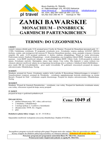 Biuro Podróży PL TRAVEL ul. Dąbrowskiego 1/6, 40-032 Katowice www.pltravel.pl [email protected] [email protected] tel. kom. 662 097 959 lub 691 133 433 tel./fax 032 256 45 77 licencja nr 782 ZAMKI BAWARSKIE MONACHIUM – INNSBRUCK GARMISCH PARTENKIRCHEN TERMIN: DO UZGODNIENIA I DZIEŃ wyjazd z miejsca zbiórki godz. 0.10, przejazd przez Czechy do Niemiec. Przyjazd do Monachium (przyjazd godz. 12 13.00). Całodzienne zwiedzanie. W programie zwiedzania m.in.: Zwiedzanie wnętrza stadionu ALIANZ ARENA (trybuny, szatnie, sala treningowa) lub muzeum FC Bayernu Monachium (puchary, stroje, pamiątki związane z historią zespołu). Ok. godz. 14.30 przejazd autokarem w okolice stadionu olimpijskiego. Wjazd na wieżę telewizyjną. Podziwianie terenów Stadionu Olimpijskiego - wioski olimpijskiej, oraz kompleksu fabryk BMW. Następnie wizyta w muzeum – świat BMW (możliwość zakupów w oryginalnym sklepie BMW i Mini). Godz. 16.00 przyjazd do centrum miasta. Zwiedzanie starówki: Marienplatz, ratusz, stare miasto. Czas wolny. Dla chętnych w czasie wolnym (we własnym zakresie) możliwość udania się na degustację bawarskiego piwa w jednym z lokalnych lokali (Hofbräuhaus – piwo marki HB lub Löwenbräukeller – piwo marki Löwenbräu). W godzinach wieczornych przejazd do miejsca zakwaterowania. Obiadokolacja. Nocleg II DZIEŃ Śniadanie, przejazd do Fussen. Zwiedzanie zamków króla Ludwika II Bawarskiego Hohenschwangau (z zewnątrz) i Neuschwainsten (wnętrze), przejazd do Wieskirche - zwiedzanie najpiękniejszego kościoła rokokowego na terenie Bawarii. Przejazd do Ettal - zwiedzanie zespołu klasztornego. Przejazd do miejsca zakwaterowania. Obiadokolacja. Nocleg III DZIEŃ Śniadanie. Wyjazd do Garmisch Partenkirchen – zwiedzanie, czas wolny. Przejazd do Innsbrucka zwiedzania miasta, czas wolny, wieczorem wyjazd do kraju, nocny przejazd IV DZIEŃ przyjazd do kraju w godzinach południowych ŚWIADCZENIA • autokar (klimatyzacja, WC, video, cafe-service) • 2 śniadania, 2 obiadokolacje • 2 noclegi (pokoje 2, 3 osobowe z łazienkami) • ubezpieczenie: NNW, KL i bagażu • pilot Cena: 1049 zł Dodatkowo płatne bilety wstępu: ok. 45 - 55 EUR/os Opcjonalnie możliwość wykupienia uroczystej obiadokolacji. Dopłata 45 EUR/os. Szczegółowy program wycieczki realizuje pilot grupy! Program może ulec zmianie. Pilot nie oprowadza po wnętrzach. Koszty wstępów do obiektów pokrywają uczestnicy we własnym zakresie! | Kalkulacja dla grupy min. 44 os. Powyższy program jest programem autorskim Biura PL TRAVEL z Katowic Wykorzystywanie i kopiowanie jedynie za zgodą PL TRAVEL