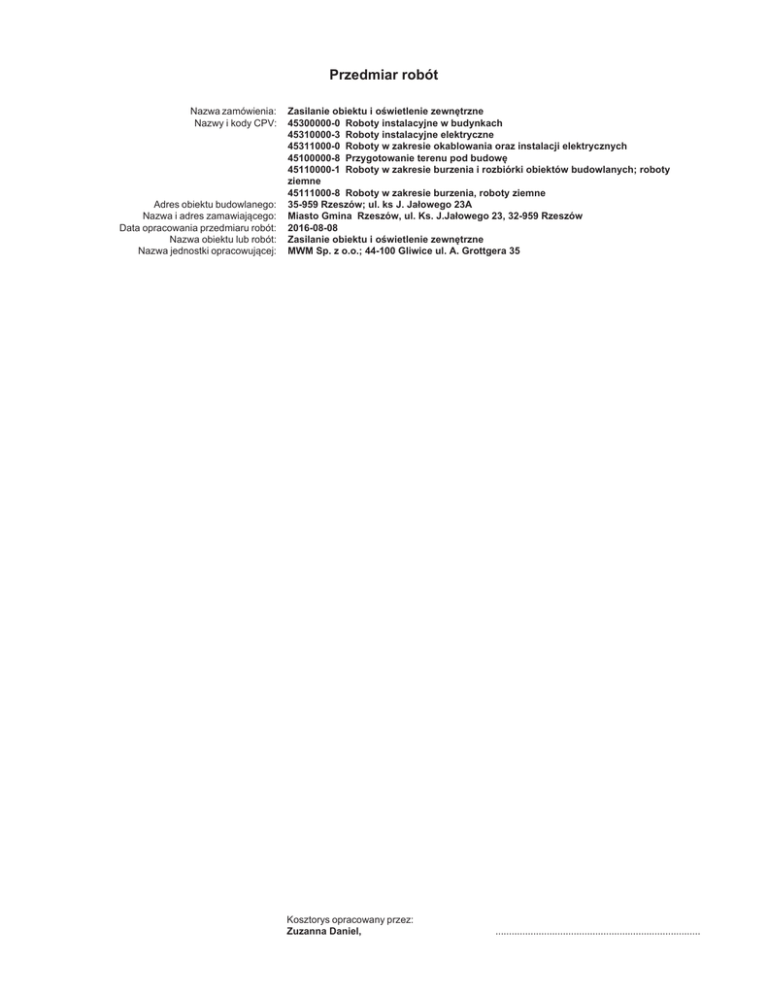 Przedmiar robót Nazwa zamówienia: Nazwy i kody CPV: Adres obiektu budowlanego: Nazwa i adres zamawiającego: Data opracowania przedmiaru robót: Nazwa obiektu lub robót: Nazwa jednostki opracowującej: Zasilanie obiektu i oświetlenie zewnętrzne 45300000-0 Roboty instalacyjne w budynkach 45310000-3 Roboty instalacyjne elektryczne 45311000-0 Roboty w zakresie okablowania oraz instalacji elektrycznych 45100000-8 Przygotowanie terenu pod budowę 45110000-1 Roboty w zakresie burzenia i rozbiórki obiektów budowlanych; roboty ziemne 45111000-8 Roboty w zakresie burzenia, roboty ziemne 35-959 Rzeszów; ul. ks J. Jałowego 23A Miasto Gmina Rzeszów, ul. Ks. J.Jałowego 23, 32-959 Rzeszów 2016-08-08 Zasilanie obiektu i oświetlenie zewnętrzne MWM Sp. z o.o.; 44-100 Gliwice ul. A. Grottgera 35 Kosztorys opracowany przez: Zuzanna Daniel, .................................................................................................... ROSiR_Oświetlenie zewnętrzne Zuzia10 (C) Datacomp 1994-2011(lic. 12209) strona nr: 2 Spis działów przedmiaru robót Nr Nazwa działu robót Kody CPV: 45100000-8 Przygotowanie terenu pod budowę 45110000-1 Roboty w zakresie burzenia i rozbiórki obiektów budowlanych; roboty ziemne 45111000-8 Roboty w zakresie burzenia, roboty ziemne 45300000-0 Roboty instalacyjne w budynkach 45310000-3 Roboty instalacyjne elektryczne 45311000-0 Roboty w zakresie okablowania oraz instalacji elektrycznych Roboty ziemnie i układanie kabli Element kopanie rowów dla kabli , szerokość dna rowu do 0.4 m, kategoria gruntu III-IV, głębokość rowu do 0.8 m Nasypanie warstwy piasku na dnie rowu kablowego, o szerokości do 0,4 m Kopanie rowów dla kabli szerokość dna rowu do 0.8 m, kategoria gruntu III-IV, głębokość rowu do 0.8 m Nasypanie warstwy piasku na dnie rowu kablowego, o szerokości do 0,6 m Nasypanie warstwy piasku na dnie rowu kablowego, dodatek za każde 0,2 m powyżej 0,6 m szerokości rowu Układanie rur ochronnych z PCW w wykopie, rura do Fi 75 mm- DVK 50 Układanie rur ochronnych z PCW w wykopie, rura do Fi 110 mm- DVK 110 Układanie rur ochronnych z PCW w wykopie, rura do Fi 1160 mm- DVK 160 Układanie kabli wielożyłowych układanych ręcznie w rowach kablowych, kabel do 2,0 kg/m, przykrycie kabla folią kalandrowaną z PCW uplastycznionego Układanie kabli wielożyłowych w rurach, pustakach lub kanałach zamkniętych, do 1,0 kg/m Układanie kabli wielożyłowych układanych ręcznie w rowach kablowych, kabel do 9,0 kg/m, przykrycie kabla folią kalandrowaną z PCW uplastycznionego Wciąganie kabli światłowodowych do rurociągów kablowych Dostawa kabla- YKY 3 x 10 Dostawa kabla- YKY 5x6 Dostawa kabla- YKY 5 x 10 Dostawa kabla- YKY 5 x 16 Dostawa kabla- YKY 5 x 35 Dostawa kabla- YKY 5 x 150 Dostawa kabla- UTP doziemny żelowany kat 5 Dostawa kabla-światłowód Z-XOTKtd 6G50/125 Układanie bednarki, w rowach kablowych, przekrój bednarki do 120 mm2 Obróbka na sucho kabli na napięcie do 1 kV o izolacji i powłoce z tworzyw sztucznych, kabel 3-żyłowy, do 16 mm2 Obróbka na sucho kabli na napięcie do 1 kV o izolacji i powłoce z tworzyw sztucznych, kabel 5-żyłowy, do 16 mm2 Obróbka na sucho kabli na napięcie do 1 kV o izolacji i powłoce z tworzyw sztucznych, kabel 5-żyłowy, do 35 mm2 Obróbka na sucho kabli na napięcie do 1 kV o izolacji i powłoce z tworzyw sztucznych, kabel 5-żyłowy, 150 mm2 Mechaniczne zasypywanie rowów dla kabli spycharkami, szerokość dna wykopu do 0.8 m, kategoria gruntu III-IV, głębokość rowu do 0.6 m Mechaniczne zasypywanie rowów dla kabli spycharkami, szerokość dna wykopu do 0.4 m, kategoria gruntu III-IV, głębokość rowu do 0.6 m Budowa studni kablowych prefabrykowanych rozdzielczych , SK-1 Zasilanie obiektu i oświetlenie zewnętrzne ROSiR_Oświetlenie zewnętrzne Nr Zuzia10 (C) Datacomp 1994-2011(lic. 12209) strona nr: 3 Nazwa działu robót Rozdzielnia ROZ Element kalkulacja własna - prefabrykacja rozdzielni ROZ Tablice rozdzielcze i obudowy- montaz ROZ Zasilanie obiektu i oświetlenie zewnętrzne ROSiR_Oświetlenie zewnętrzne Nr Zuzia10 (C) Datacomp 1994-2011(lic. 12209) strona nr: 4 Nazwa działu robót Montaż słupów oświetleniowych i opraw Element Montaż wysięgników rurowych- na słupie, wspornik pod naswietlacze Montaż opraw oświetlenia zewnętrznego,Naświetlacz do lamp metalohalogenkowych, moc 1000W optyka symetryczna. Montaż i stawianie słupów oświetleniowych, Słup cylindryczny H=3,5m do montażu na fundamencie szary Montaż opraw oświetlenia zewnętrznego,- oprawa do lamp metalohalogenkowych 70 W+źródło światła 70 W+deflektor antyolśnieniowy+daszek Wciąganie przewodów, z udziałem podnośnika samochodowego w słupy latarń lub rury osłonowe- YDY 3 x 2,5 Zasilanie obiektu i oświetlenie zewnętrzne ROSiR_Oświetlenie zewnętrzne Nr Zuzia10 (C) Datacomp 1994-2011(lic. 12209) strona nr: 5 Nazwa działu robót Roboty towarzyszace Element Wywóz samochodami skrzyniowymi, do 1 km, grunt kategorii III Wywóz samochodami skrzyniowymi, ziemia, dodatek za każdy następny 1 km- przyjeto do 10 km opłata za wysypisko Zasilanie obiektu i oświetlenie zewnętrzne ROSiR_Oświetlenie zewnętrzne Nr Zuzia10 (C) Datacomp 1994-2011(lic. 12209) strona nr: 6 Nazwa działu robót Pomiary Element Badanie i pomiar instalacji uziemiającej ochronnej lub roboczej, pomiar pierwszy Badanie i pomiar skuteczności zerowania, - słupy Sprawdzenie i pomiar kompletnego obwodu elektrycznego niskiego napięcia, 1-fazowego Sprawdzenie i pomiar kompletnego obwodu elektrycznego niskiego napięcia, 3-fazowego Linie kablowe do 1kV. Linia kablowa 5-żyłowa Pomiary reflektometryczne linii światłowodowych, , mierzony 1 światłowód Pomiary tłumienności optycznej linii światłowodowyc, mierzony 1 światłowód Zasilanie obiektu i oświetlenie zewnętrzne ROSiR_Oświetlenie zewnętrzne Zuzia10 (C) Datacomp 1994-2011(lic. 12209) strona nr: 7 Tabela przedmiaru robót Nr Kod pozycji STWiOR Opis robót