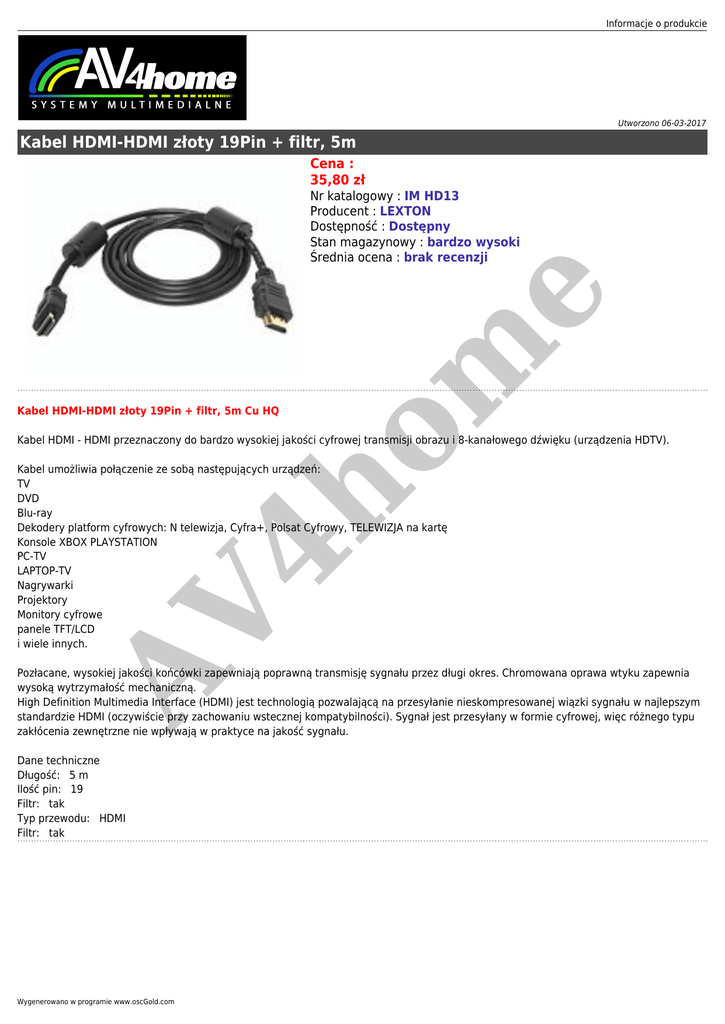 Informacje o produkcie Utworzono 06-03-2017 Kabel HDMI-HDMI złoty 19Pin + filtr, 5m Cena : 35,80 zł Kabel HDMI-HDMI złoty 19Pin + filtr, 5m Cu HQ om e Nr katalogowy : IM HD13 Producent : LEXTON Dostępność : Dostępny Stan magazynowy : bardzo wysoki Średnia ocena : brak recenzji Kabel HDMI - HDMI przeznaczony do bardzo wysokiej jakości cyfrowej transmisji obrazu i 8-kanałowego dźwięku (urządzenia HDTV). AV 4h Kabel umożliwia połączenie ze sobą następujących urządzeń: TV DVD Blu-ray Dekodery platform cyfrowych: N telewizja, Cyfra+, Polsat Cyfrowy, TELEWIZJA na kartę Konsole XBOX PLAYSTATION PC-TV LAPTOP-TV Nagrywarki Projektory Monitory cyfrowe panele TFT/LCD i wiele innych. Pozłacane, wysokiej jakości końcówki zapewniają poprawną transmisję sygnału przez długi okres. Chromowana oprawa wtyku zapewnia wysoką wytrzymałość mechaniczną. High Definition Multimedia Interface (HDMI) jest technologią pozwalającą na przesyłanie nieskompresowanej wiązki sygnału w najlepszym standardzie HDMI (oczywiście przy zachowaniu wstecznej kompatybilności). Sygnał jest przesyłany w formie cyfrowej, więc różnego typu zakłócenia zewnętrzne nie wpływają w praktyce na jakość sygnału. Dane techniczne Długość: 5 m Ilość pin: 19 Filtr: tak Typ przewodu: HDMI Filtr: tak Wygenerowano w programie www.oscGold.com