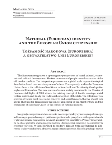 Magdalena Sitek Wyższa Szkoła Gospodarki Euroregionalnej w Józefowie Journal of Modern Science tom 4/27/2015, s. 111–126 National (European) identity and the European Union citizenship Tożsamość narodowa (europejska) a obywatelstwo Unii Europejskiej Abstract The European integration is opening new perspectives of social, cultural, economic and political development. The free movement of people caused extinction of the old border conflicts. The integration processes on a global scale require ideological foundation based on a certain system of values. Consequently, within the European Union, there is the collision of traditional culture, built on Christianity, Greek philosophy and Roman law. The new system of values, mainly contained in the Charter of Fundamental Rights of 2000, storms the existing concept of family, marriage, social welfare system, and finally the traditional conception of the state. The collision of two systems of values must raise some concerns and social tensions, that we should talk about. The basis for discussion is the issue of citizenship of the Member State and the citizenship of European Union in the context of national identity. Streszczenie Integracja europejska otwiera coraz to nowsze perspektywy rozwoju społecznego, kulturowego, gospodarczego i politycznego. Swoboda przepływu osób spowodowała w głównej mierze wygaszenie dawnych granicznych konfliktów. Procesy integracyjne na skalę globalną wymagają podbudowy ideologicznej osadzonej na określonym systemie wartości. W konsekwencji dochodzi w ramach Unii Europejskiej do zderzenia tradycyjnej kultury, zbudowanej na chrześcijaństwie, filozofii greckiej i prawie Journal of Modern Science tom 4/27/2015 111 Magdalena Sitek rzymskim. Nowy system wartości, zawarty głównie w Karcie Praw Podstawowych z 2000 roku, burzy dotychczasową koncepcję m.in. rodziny, małżeństwa, systemu pomocy społecznej, a w końcu tradycyjną koncepcję państwa. Zderzenie się dwóch systemów wartości musi rodzić pewne obawy i napięcia społeczne, o których należy mówić. Podstawę rozważań stanowi kwestia obywatelstwa państwa członkowskiego i obywatelstwa Unii Europejskiej w kontekście tożsamości narodowej. Keywords: European law, citizenship, tradition, culture, civilization changes Słowa kluczowe: prawo europejskie, obywatelstwo, tradycja, kultura, zmiany cywilizacyjne Naród, który odcina się od historii, który się jej wstydzi, wychowuje młode pokolenie bez powiązań historycznych, podcina korzenie własnego istnienia Bł. Jan Paweł II Wprowadzenie Integracja europejska zapoczątkowana przez chrześcijańskie nurty myślowe po II wojnie światowej pozwoliła na wprowadzenie nowych zasad współpracy między państwami w różnych obszarach. Stopniowo wprowadzano polityki sektorowe wpływające na tworzenie nowych instrumentów prawnych i instytucjonalnych pozwalających na rozwiązywanie trudnych i dotychczas konfliktogennych problemów, np. wydobycie węgla, wytop stali czy produkcja energii atomowej. Obecnie zostało uregulowanych znacznie więcej obszarów problemowych, w tym ochrona konsumenta, polityka ekologiczna, energetyczna, transportowa czy zapewnienie bezpieczeństwa jednostkowego i społecznego. Zmiany te konsekwentnie rodzą pytanie o tożsamość narodową i europejską (Kabat-Rudnicka, Rudnicki, 2011, s. 121 i n.). Konsekwencją ujednolicania polityk jest stopniowe ograniczanie suwerenności państw na rzecz organów unijnych mających dbać o interes już nie jednego państwa, lecz całej europejskiej wspólnoty. Namacalnymi dowodami zachodzących zmian było stworzenie wspólnoty celnej, która zniosła granice przepływu osób i usług, wspólnoty walutowej, która wprowadziła w większości państw unijnych wspólną walutę – euro, tworząc tym samym 112 Journal of Modern Science tom 4/27/2015 Tożsamość narodowa (europejska) a obywatelstwo Unii Europejskiej wewnątrz Unii strefę euro. Zniesienie granic politycznych stało się możliwe na podstawie układu z Schengen. Wprowadzone zmiany zintensyfikowały ruch nie tylko handlowy, ale przede wszystkim osobowy. Strumień przemieszczających się osób ciągle wzrasta, kreując tym samym nowe problemy związane z bezpieczeństwem, zabezpieczeniami socjalnymi czy transportem i ochroną środowiska. Uczestnikami tego ruchu są nie tylko turyści, ale przede wszystkim osoby poszukujące pracy i lepsze warunki do życia. To z kolei powoduje następne kwestie związane głównie z przemieszczaniem się ludzi młodych do państw o wyższej stopie życiowej i tym samym pustoszeniem regionów biedniejszych. Strumień ten jest wzmacniany dodatkowo coraz bardziej napływającymi obywatelami spoza Unii, zwłaszcza z terenów objętych działaniami wojennymi, tj. z Bliskiego Wschodu, Dalekiej Azji i Afryki. Zmienia się również system wartości. Europa z kraju monokulturowego, w dużej mierze chrześcijańskiego, staje się społeczeństwem wielokulturowym, o dużym stopniu zrelatywizowania wartości. Zmiany te mają coraz bardziej charakter trwały, chociaż napływająca coraz większa fala uchodźców do Europy budzi coraz większy sprzeciw i obawy przed utratą tożsamości europejskiej. Nie tylko Polska, ale już i Dania odmawiają wykonania wskazań Rady Europejskiej co do przyjęcia przyznanej liczby uchodźców do swojego kraju. Zmianom tym towarzyszą również coraz to nowsze regulacje prawne, których celem jest uporządkowanie nowych obszarów problemowych zgodnie z założeniami ogólnoeuropejskiej polityki. W tym też duchu należy spostrzegać jedną z najistotniejszych zmian, a mianowicie wprowadzenie obywatelstwa europejskiego. Obywatelstwo europejskie pociąga za sobą wiele korzyści. Dzięki temu obywatele Unii mogą znaleźć ochronę konsularną, niezależnie z jakiegokolwiek kraju pochodzą czy w jakimkolwiek miejscu na świecie się znajdują (Čentéš, 2008, s. 133–140). Obywatelstwo a tożsamość