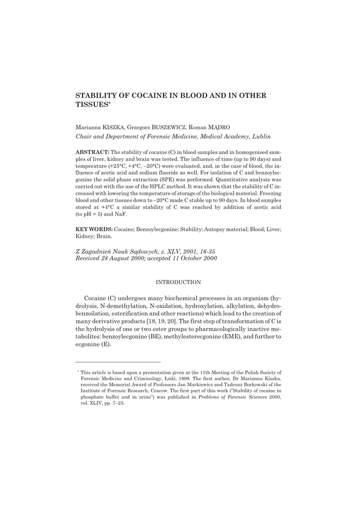 STABILITY OF COCAINE IN BLOOD AND IN OTHER TISSUES* Marianna KISZKA, Grzegorz BUSZEWICZ, Roman M¥DRO Chair and Department of Forensic Medicine, Medical Academy, Lublin ABSTRACT: The stability of cocaine (C) in blood samples and in homogenised samples of liver, kidney and brain was tested. The influence of time (up to 90 days) and temperature (+25°C, +4°C, –20°C) were evaluated, and, in the case of blood, the influence of acetic acid and sodium fluoride as well. For isolation of C and benzoylecgonine the solid phase extraction (SPE) was performed. Quantitative analysis was carried out with the use of the HPLC method. It was shown that the stability of C increased with lowering the temperature of storage of the biological material. Freezing blood and other tissues down to –20°C made C stable up to 90 days. In blood samples stored at +4°C a similar stability of C was reached by addition of acetic acid (to pH = 5) and NaF. KEY WORDS: Cocaine; Benzoylecgonine; Stability; Autopsy material; Blood; Liver; Kidney; Brain. Z Zagadnieñ Nauk S¹dowych, z. XLV, 2001, 16-35 Received 28 August 2000; accepted 11 October 2000 INTRODUCTION Cocaine (C) undergoes many biochemical processes in an organism (hydrolysis, N-demethylation, N-oxidation, hydroxylation, alkylation, dehydrobenzoilation, esterification and other reactions) which lead to the creation of many derivative products [18, 19, 20]. The first step of transformation of C is the hydrolysis of one or two ester groups to pharmacologically inactive metabolites: benzoylecgonine (BE), methylesterecgonine (EME), and further to ecgonine (E). * This article is based upon a presentation given at the 11th Meeting of the Polish Society of Forensic Medicine and Criminology, £ódŸ, 1998. The first author, Dr Marianna Kiszka, received the Memorial Award of Professors Jan Markiewicz and Tadeusz Borkowski of the Institute of Forensic Research, Cracow. The first part of this work (”Stability of cocaine in phosphate buffer and in urine”) was published in Problems of Forensic Sciences 2000, vol. XLIV, pp. 7–23. Stability of cocaine in blood ... 17 BE is formed on the path of hydrolysis of the methyl ester bond, especially if pH > 7 [5, 9, 23, 32]. However, it is generally accepted that enzymes also take part in the process [2, 9, 21, 26]. The hydrolysis of the other ester bond in the C molecule, leading to the creation of EME, is, however, catalysed by the liver and plasma esterases [9, 13, 26, 32]. These processes do not only take place in living organisms. They also go on after death until the exhaustion of buffer systems capacity. Moreover, the action of bacterial enzymatic systems occurs very early after death [25]. Also, the great influence of pH on the stability of C should not be overlooked [10] in the interpretation of results of the study of tissue materials. Although initially after death a gradual acidifying of tissues is observed (with the maximum appearing about 24–48 hours after death), in the following phase (of proteolytic autolysis) pH eventually rises above 7 [25]. Knowledge of the dynamics of the decomposition of C in enzymatically active biological material is therefore of significant importance for toxicological expert appraisements, both at the stage of securing and storage of samples and at the stage of interpretation of the obtained analytical results. Fig. 1. A diagram of preparation and storage of blood samples. 18 M. Kiszka, G. Buszewicz, R. M¹dro Fig. 2. A diagram of preparation and storage of liver, kidney and brain samples. MATERIALS AND METHODS The material studied was blood samples collected from 5 corpses and fragments of the liver, kidney and brain secured during the autopsy of 3 corpses. The method of preparation of blood samples is shown in part B of Figure 1. Each blood sample was divided into four portions. NaF in the quantity of 10 µg/ml was added to the first portion, CH3COOH was added to the second portion until pH ≈ 5 was obtained, both compounds were added to the third, and none of the preservatives was added to the fourth. Then each portion (of each blood sample) was divided into two parts, and 5 µg/ml of C was added to the first, whereas no C was added to the second1. 1 As a background control sample. Stability of cocaine in blood ... 19 The internal organs (3 livers, 3 kidneys and 3 brain hemispheres) were frozen at –20°C directly after collecting. Then they were partially thawed, cut into small fragments, treated with liquid nitrogen2 and powdered by grinding in a porcelain mortar. The powdered tissue was divided into two parts: to the first, C was added to obtain a concentration of 5 µg/g and the other was left without addition of C3. Material prepared in this manner (both the blood and the organs) was placed into vials that were stored at three different temperatures (+25°C, +4°C, –20°C) and was analysed (in order to determine the concentrations of C and BE) immediately after the preparation of samples and after 1, 7, 30, 60 and 90 days (in accordance with the scheme shown in parts C and D of Figures 1 and 2). Xenobiotics were isolated with the method of the solid phase extraction (SPE), using Bond Elut Certify 300 mg/3 ml columns made by Varian [1, 6]. Quantitative analysis was carried out by means of the HPLC method (with a liquid chromatograph manufactured by Gilson; Hypersil ODS 250 × 4.0 mm, 5 µm column; the mobile phase: 0.025 M phosphate buffer with addition of 0.5% triethylamine at pH = 3 – acetonitrile 80–20 in a two pump system; the flow rate of the eluent was 1 ml/min; the volume of the injected sample was 10 µl; detection at a wavelength of 233 nm). Concentrations of C and BE were determined with the method of the internal standard (lignocaine) using Gilson 715 HPLC software4. Extracts from blood were characterised by a sufficient level of purity, whereas those from other tissues were significantly contaminated, yet the influence of ‘biological background’ was