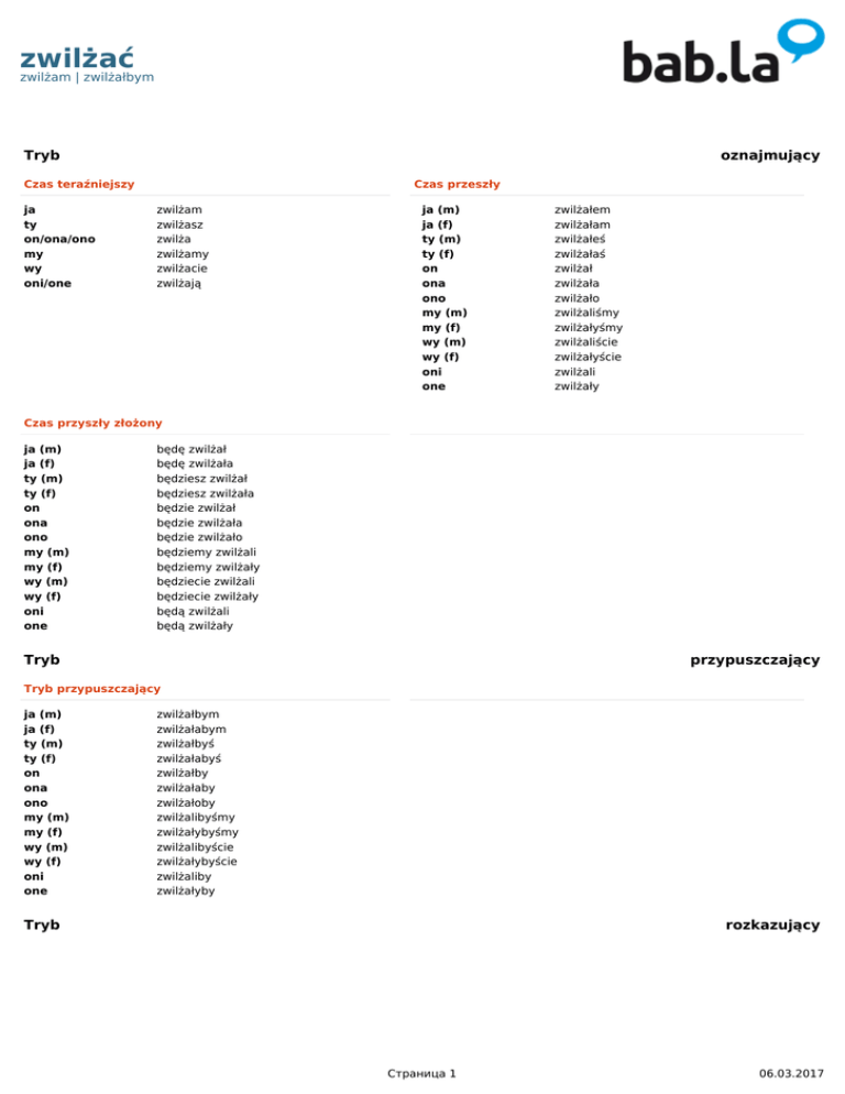 zwilżać zwilżam | zwilżałbym Tryb oznajmujący Czas teraźniejszy ja ty on/ona/ono my wy oni/one Czas przeszły zwilżam zwilżasz zwilża zwilżamy zwilżacie zwilżają ja (m) ja (f) ty (m) ty (f) on ona ono my (m) my (f) wy (m) wy (f) oni one zwilżałem zwilżałam zwilżałeś zwilżałaś zwilżał zwilżała zwilżało zwilżaliśmy zwilżałyśmy zwilżaliście zwilżałyście zwilżali zwilżały Czas przyszły złożony ja (m) ja (f) ty (m) ty (f) on ona ono my (m) my (f) wy (m) wy (f) oni one będę zwilżał będę zwilżała będziesz zwilżał będziesz zwilżała będzie zwilżał będzie zwilżała będzie zwilżało będziemy zwilżali będziemy zwilżały będziecie zwilżali będziecie zwilżały będą zwilżali będą zwilżały Tryb przypuszczający Tryb przypuszczający ja (m) ja (f) ty (m) ty (f) on ona ono my (m) my (f) wy (m) wy (f) oni one zwilżałbym zwilżałabym zwilżałbyś zwilżałabyś zwilżałby zwilżałaby zwilżałoby zwilżalibyśmy zwilżałybyśmy zwilżalibyście zwilżałybyście zwilżaliby zwilżałyby Tryb rozkazujący Страница 1 06.03.2017 zwilżać zwilżam | zwilżałbym Tryb rozkazujący ty on/ona/ono my wy oni/one zwilżaj niech zwilża zwilżajmy zwilżajcie niech zwilżają Imiesłowy Imiesłów przymiotnikowy teraźniejszy czynny zwilżający Imiesłów przymiotnikowy przeszły bierny zwilżany Imiesłów przysłówkowy współczesny zwilżając Страница 2 Powered by TCPDF (www.tcpdf.org) 06.03.2017