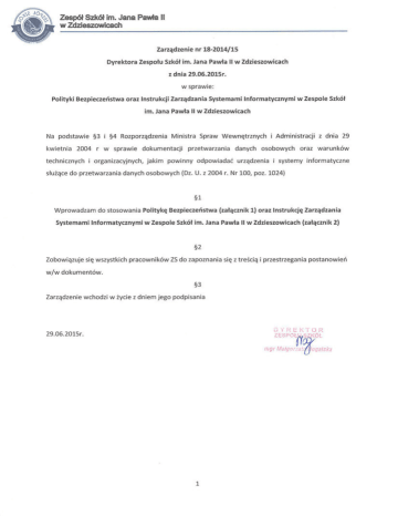 Polityki Bezpieczeństwa oraz Instrukcji Zarządzania Systemami Informatycznymi w Zespole Szkół