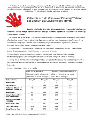 T-Mobile Polska S.A. z siedzibą w Warszawie, Ul. Marynarska 12, 02-647 Warszawa. Spółka zarejestrowana w Sądzie Rejonowym dla m.st. Warszawy w Warszawie, XII Wydział Gospodarczy Krajowego Rejestru Sądowego, nr KRS 0000391193, NIP 526-10-40-567, Regon 011417295, Kapitał zakładowy 471 mln złotych, kapitał wpłacony w całości. Załącznik nr 1 do Warunków Promocji "Telefon bez umowy" dla Użytkowników Heyah Cennik telefonów (nr 24), dla uczestników Promocji „Telefon bez umowy”, którzy nabyli uprawnienie do zakupu telefonu zgodnie z regulaminem Promocji „Telefon bez umowy” 1. W okresie od 28.05.2013 r. do wyczerpania zapasów modeli telefonów związanych z Promocją „Telefon bez umowy” lub do odwołania, Operator umożliwia nabycie aparatów telefonicznych na warunkach niniejszego Cennika oraz związanego z tym załącznikiem regulaminu „Warunki Promocji ’Telefon bez umowy’ dla Użytkowników Heyah”. 2. Cennik dotyczy Użytkowników korzystających z Promocji ‘Telefon bez umowy’, którzy nabyli prawo do zakupu aparatu telefonicznego w promocyjnej cenie. 3. Przez kupno telefonu rozumie się złożenia zamówienia na wybrany model aparatu telefonicznego przez uprawnionych Użytkowników Heyah biorących udział w Promocji. 4. Zakup przez Użytkownika wybranego modelu aparatu telefonicznego na zasadach opisanych w regulaminie Promocji oznacza zakończenie dla tego Użytkownika możliwości dalszego udziału w Promocji. 5. Ceny telefonów: (Ceny w zł z VAT): Model telefonu Ceny dla uczestników Ceny dla uczestników biorących biorących udział w Promocji udział w Promocji przez okres przez minimum 24 miesiące od 12 do 23 miesięcy Plan_50 Plan_30 Plan_50 Plan_30 Nokia 100 1 1 1 1 LG Swift L3 1 139 199 289 Motorola Gleam*/ Motorola Gleam +* 49 149 249 319 Nokia 500* 89 199 299 449 Sony Ericsson live with Walkman* 89 249 299 499 Samsung Galaxy Y (S5360) 99 199 229 319 1 89 109 189 LG P700 Swift L7 429 629 849 999 Sony Xperia tipo 89 279 419 449 Nokia Asha 203 Cennik ważny od 28.05.2013 r., ze zmianami z dnia 27.05.2013 r. T-Mobile Polska S.A. z siedzibą w Warszawie, Ul. Marynarska 12, 02-647 Warszawa. Spółka zarejestrowana w Sądzie Rejonowym dla m.st. Warszawy w Warszawie, XII Wydział Gospodarczy Krajowego Rejestru Sądowego, nr KRS 0000391193, NIP 526-10-40-567, Regon 011417295, Kapitał zakładowy 471 mln złotych, kapitał wpłacony w całości. ST21i Sony Xperia J czarny 279 589 649 819 Samsung Galaxy mini 2 (S6500) 199 359 389 509 Samsung C3520 19 69 139 189 Samsung S5610 29 79 169 229 159 239 279 349 1 109 199 269 329 519 789 919 Alcatel OT 908* 1 1 149 219 Nokia 1616* 1 1 1 1 Samsung E1150* 1 1 1 1 Samsung E1190* 1 1 1 1 Nokia 2220* 1 1 1 99 Nokia 2700* 1 19 69 199 LG EGO T500* 1 49 79 189 Nokia 7230* 1 149 249 299 Nokia C2-02* 1 109 199 249 Nokia C3* 1 149 199 299 Nokia 6303/6303i* 1 249 309 369 Samsung Avila (S5230)* 1 99 149 249 Samsung Avila (S5230G)* 1 249 289 319 LG Bali* 1 179 229 319 Sony Ericsson Zylo* 1 199 299 349 Nokia C2-01* 19 59 89 199 Nokia 5230* 49 229 319 369 Samsung Ch@t 335* 49 149 199 249 Samsung Galaxy Mini (S5570)* 129 249 299 349 Samsung Wave 533* 279 369 439 489 HTC Wildfire S* 329 419 539 599 LG Swift L5 (E610) Nokia X2* Sony Ericsson Neo V* * - telefony o ograniczonej dostępności Plan_30 - zobowiązanie uczestników promocji ‘Telefon bez umowy’ do comiesięcznego zasilania konta w kwocie minimalnej 30zł Plan_50 - zobowiązanie uczestników promocji ‘Telefon bez umowy’ do comiesięcznego zasilania konta w kwocie minimalnej 50zł Cennik ważny od 28.05.2013 r., ze zmianami z dnia 27.05.2013 r. T-Mobile Polska S.A. z siedzibą w Warszawie, Ul. Marynarska 12, 02-647 Warszawa. Spółka zarejestrowana w Sądzie Rejonowym dla m.st. Warszawy w Warszawie, XII Wydział Gospodarczy Krajowego Rejestru Sądowego, nr KRS 0000391193, NIP 526-10-40-567, Regon 011417295, Kapitał zakładowy 471 mln złotych, kapitał wpłacony w całości. Operator zastrzega sobie ograniczony dostęp wybranych modeli aparatów. 6. Zakup telefonu na warunkach określonych w regulaminie Promocji „Telefon bez umowy’ i zgodnie z niniejszym Cennikiem możliwy jest : - w Sklepie Internetowym Heyah na www.heyah.pl (eSklep Heyah) - za pośrednictwem serwisu telefonicznego (Telesklep Heyah) 7. Dokonanie zakupu wymaga identyfikacji aktywnej karty SIM, do której przypisane jest konto, które Użytkownik doładowywał zgodnie z postanowieniem regulaminu Promocji „Telefon bez umowy”. Cennik ważny od 28.05.2013 r., ze zmianami z dnia 27.05.2013 r.